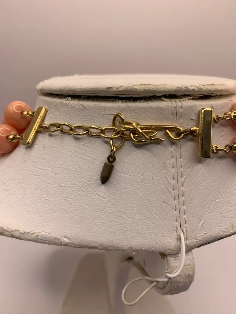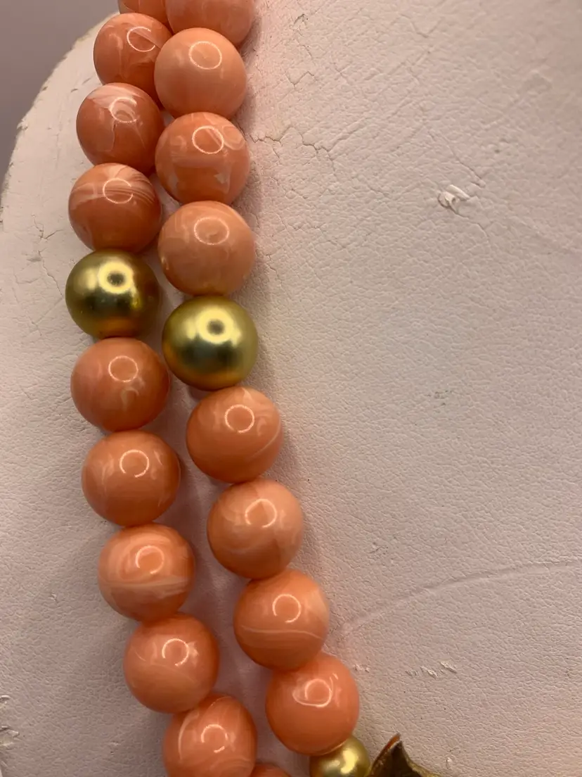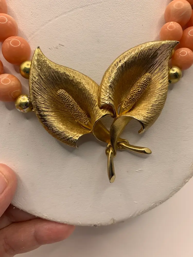 The color in this piece is wonderful Beautiful peach beads with a subtle white swirl on the bead. Gold tone accents beads as well The star of the necklace is the brushed gold calla lilies in the center. Beautiful clasp as well In very good condition. Well made Measures 17 in with 2 in extender