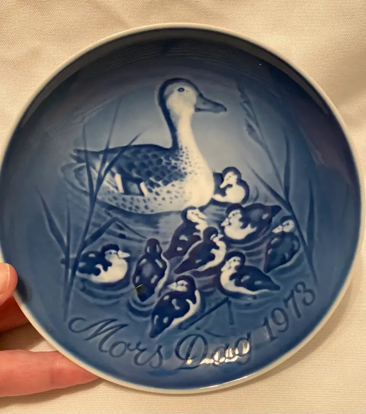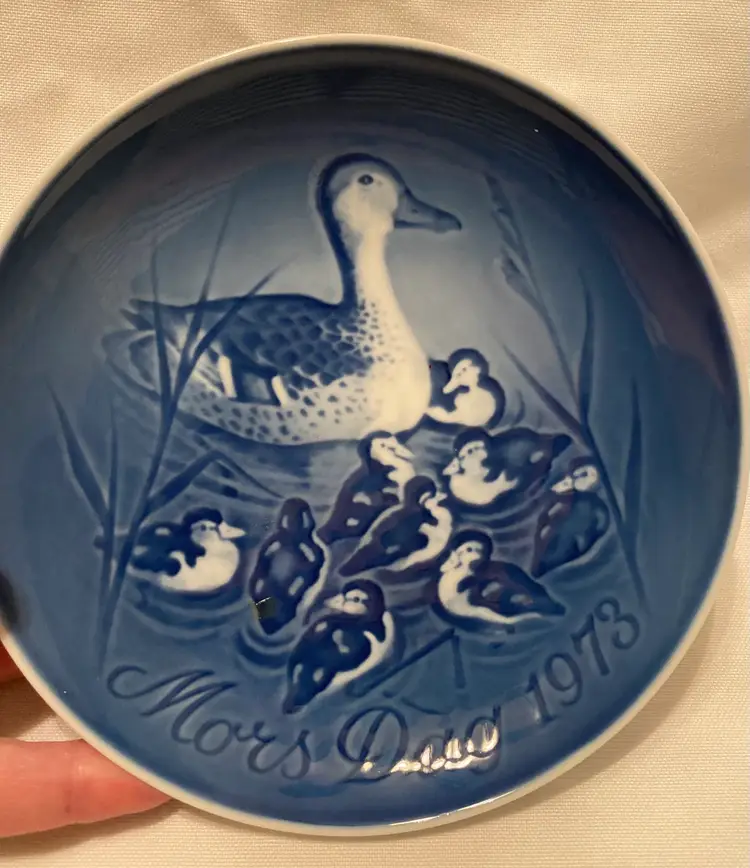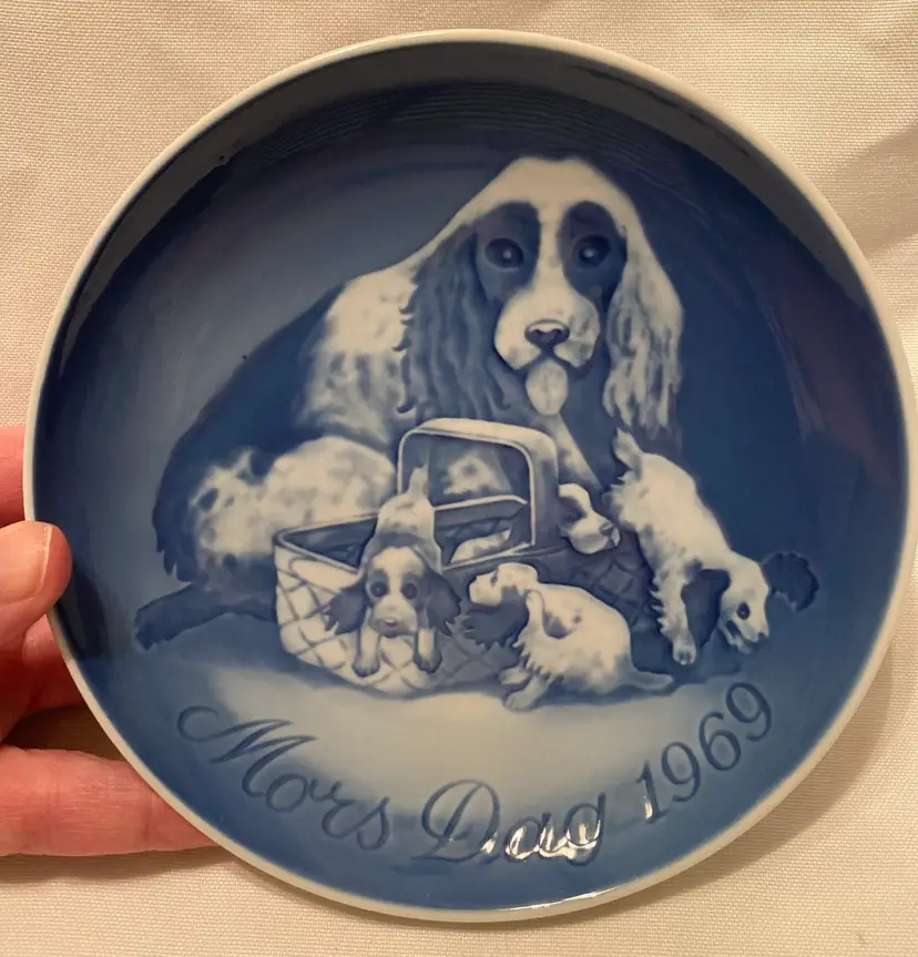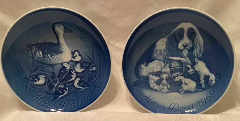 Gorgeous Vintage Royal Copenhagen Set of 2 Mothers Day Plates 1969 & 1973. Includes Mors Dag Dog & Puppies Bing & Grondahl featuring a cocker spaniel & puppies. This plate was the first of the series of Mother’s Day plates 1969. & Mors Dag Mother Duck with Ducklings 1973 Bing & Grondahl. Designed by Henry Thelander. Plates are approximately 6” diameter & wired holes and ready to hang ( just need wire). EXCELLENT pre-loved condition, no chipping or cracking. Do not come with original boxes or papers. Please see other Copenhagen plates. Happy Poshing!