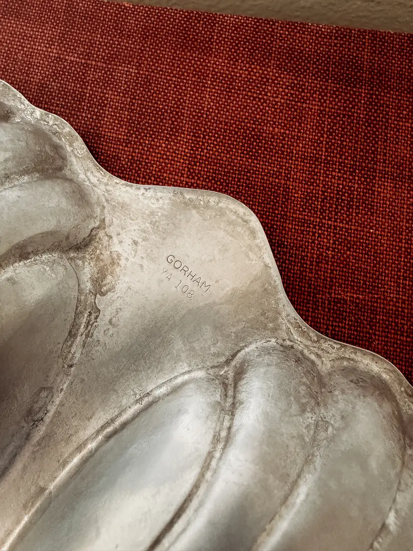 This is a Gorham Aegean Collection Three Shell Dish. The dish features a classic shell shape divided into three sections. Often used for serving nuts, candies, or as a trinket dish. Ameriloy metal.