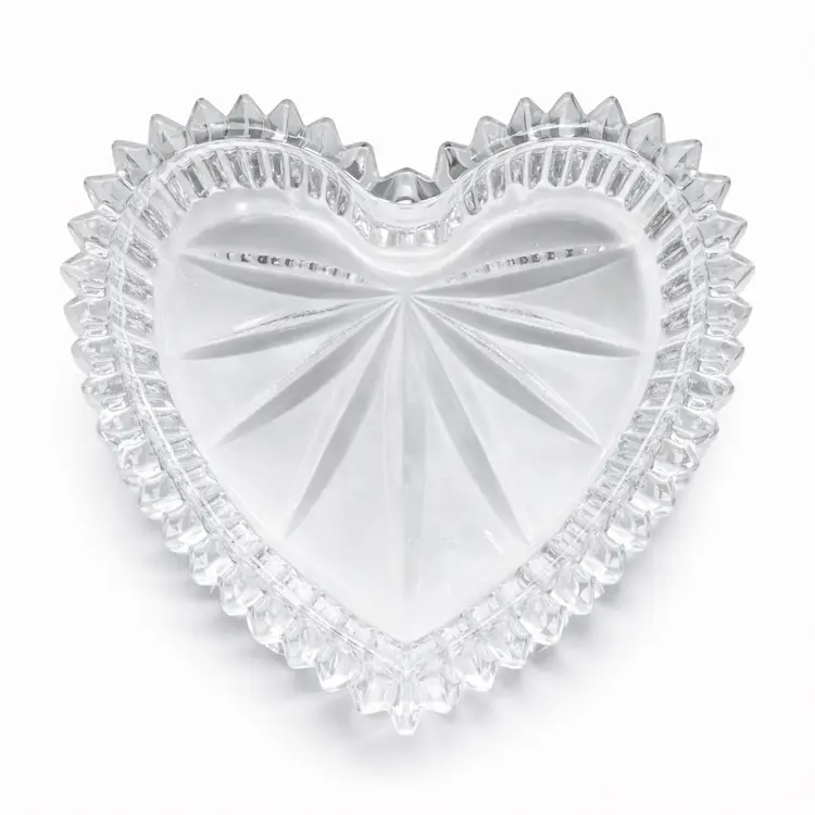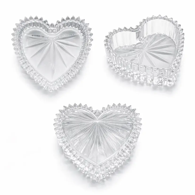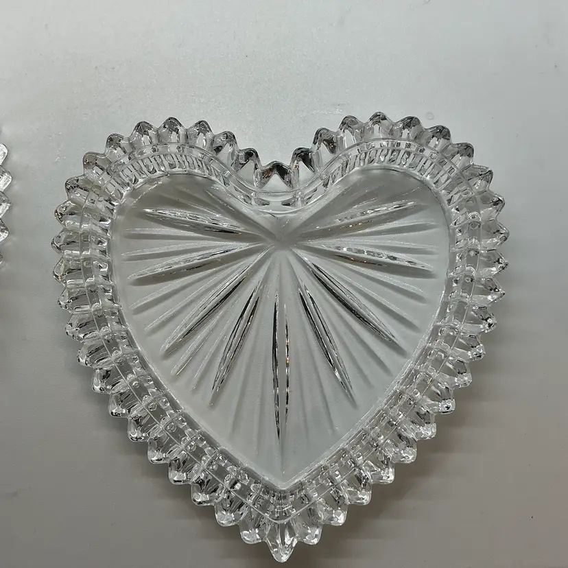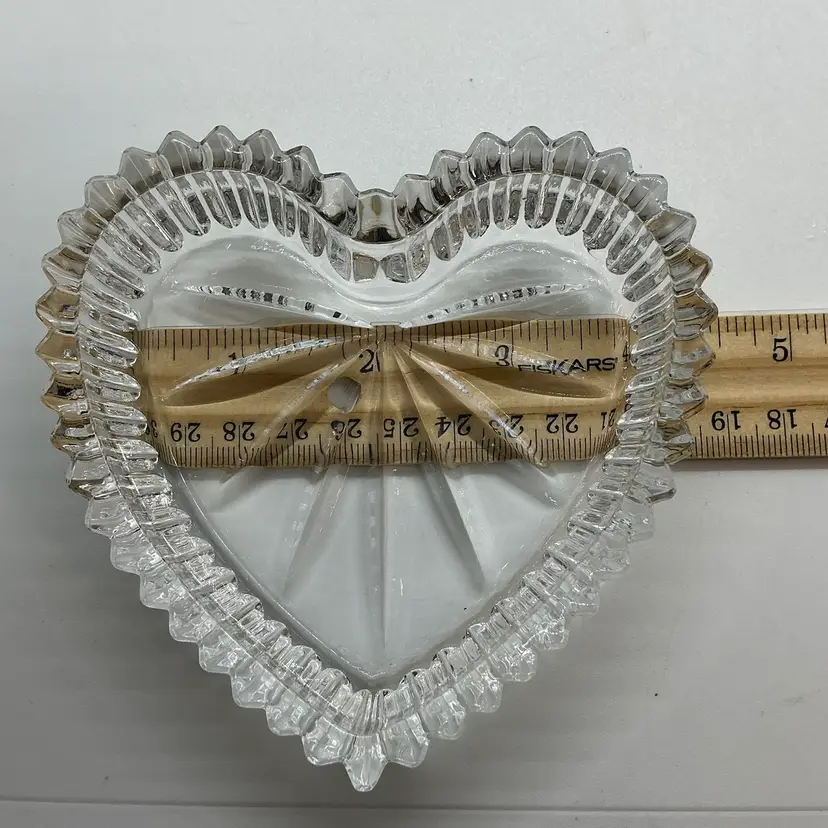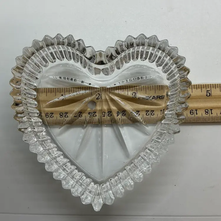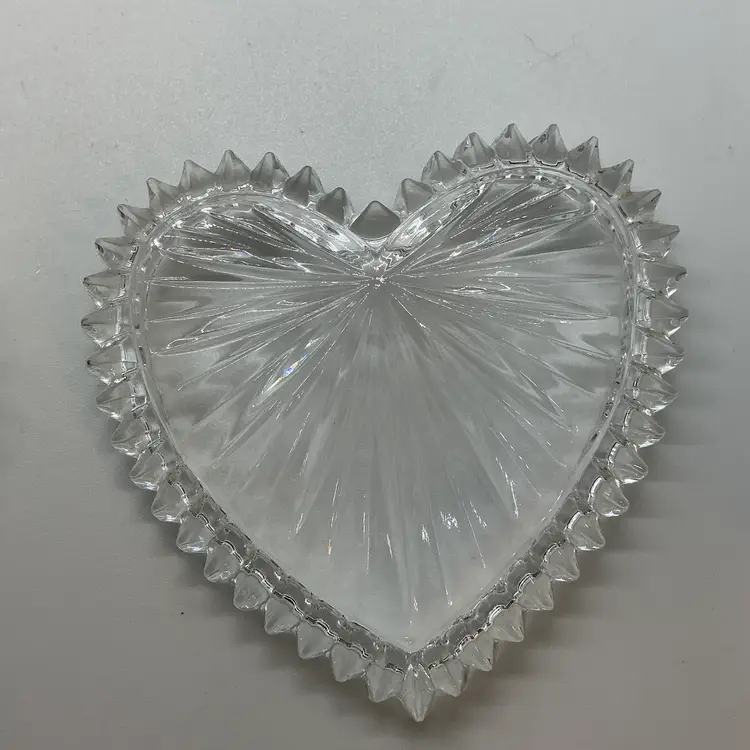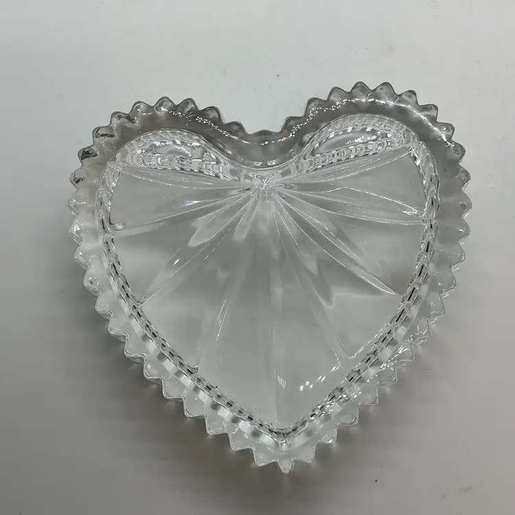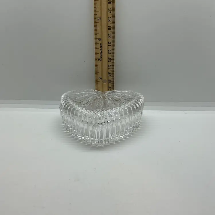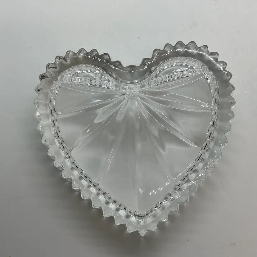 Gorham Crystal Glass Heart Shaped Trinket or Jewelry Box with Lid from West Germany. Made of clear glass with a smooth finish, this trinket box features a heart-shaped design, perfect for all occasions, especially romantic ones. Simply clean with warm water to maintain its beauty, and enjoy the timeless beauty of this classic trinket box. Comes from a non smoking home. No box. No chips or cracks.