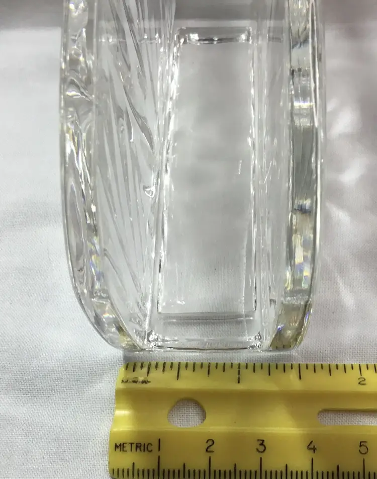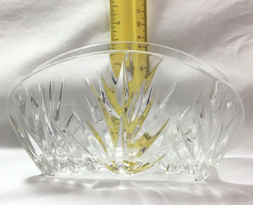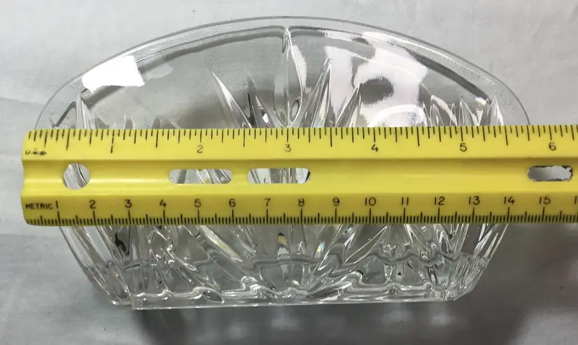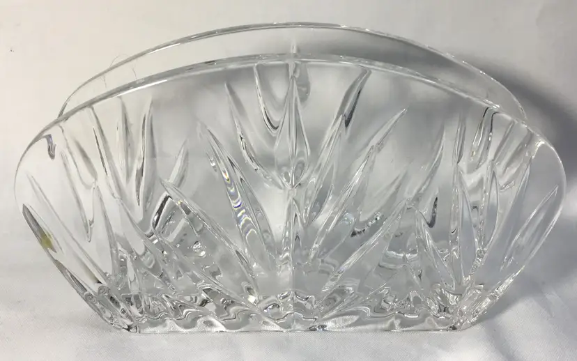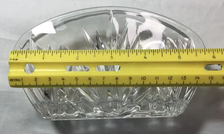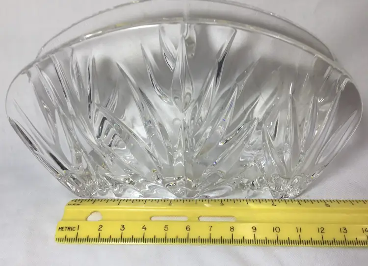 4 inches long at base, 6 inches long at widest part, 3.5 inches tall, 1.5 inches wide, clear crystal napkin holder, fan-shaped sides. Made by Gorham Crystal company in Germany. Star Blossom pattern on each side.