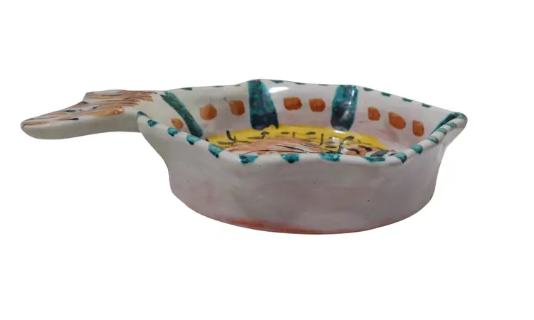 This is a very nice well-made handpainted folk art Terracotta art pottery fish dish with beautiful vivid colors. Dish measures 8.5" long x 6.75" wide x 1.5" tall.
