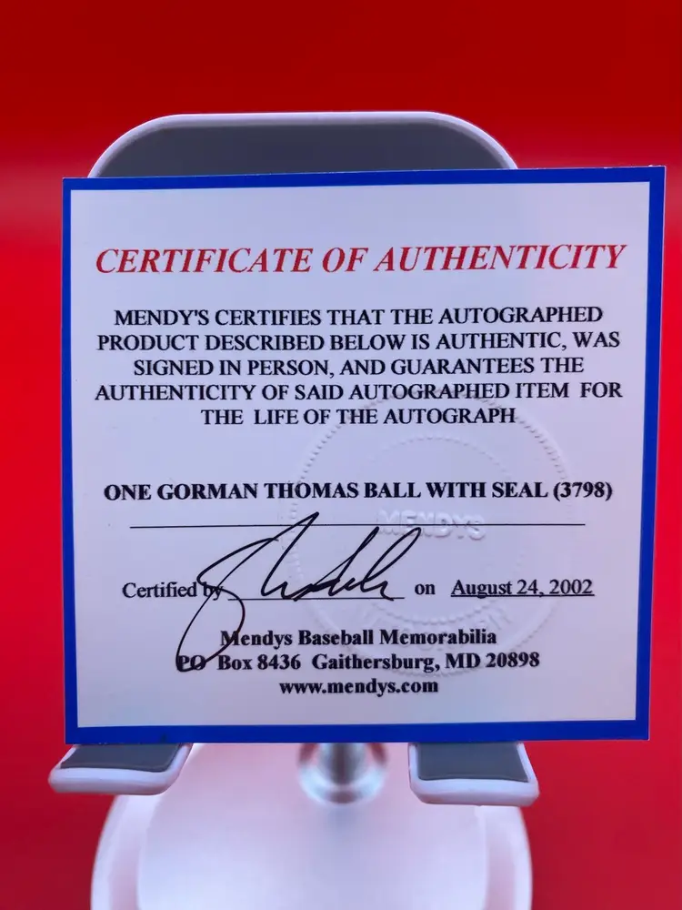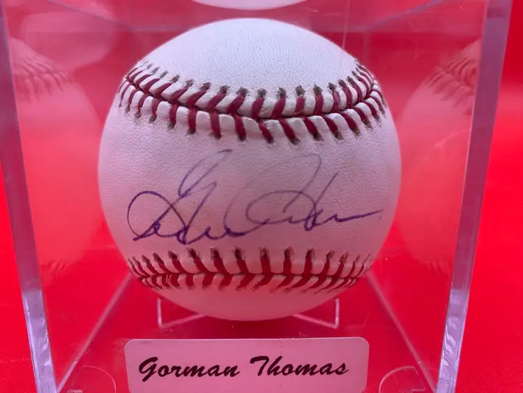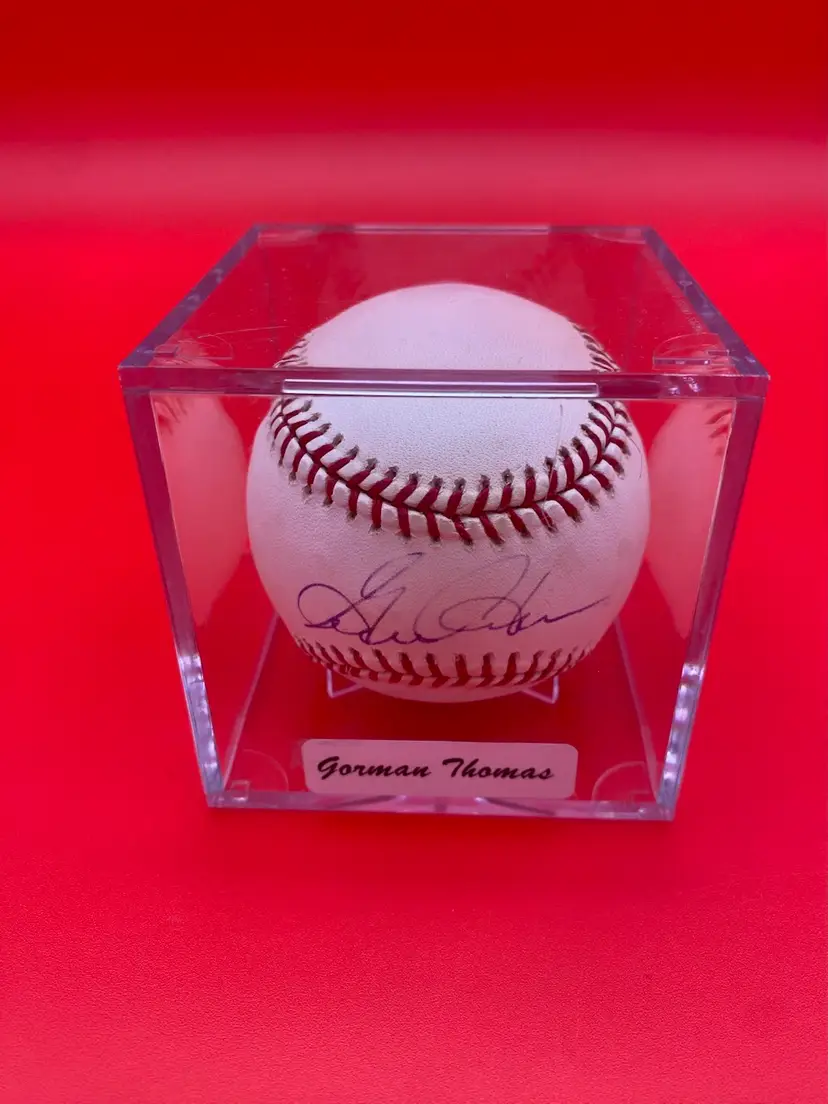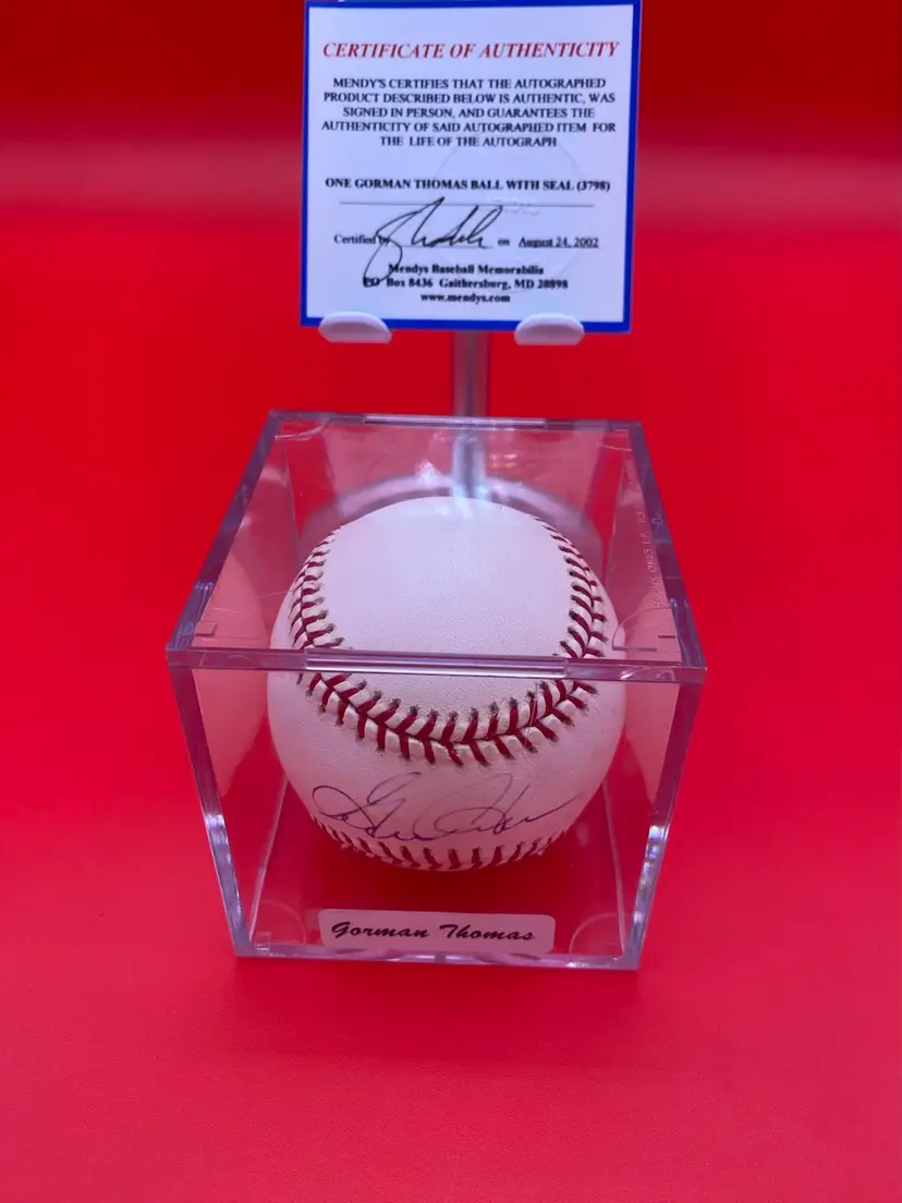 You are purchasing one Gorman Thomas Signed Rawlings Official Major League Baseball. This Baseball includes one Hard Plastic Display Case and a Certificate of Authenticity by Mendys Baseball Memorabilia from 2002 (No Seal Sticker). This Baseball is in overall good condition. See images for a closer look at each angle. No chips or cracks in the Case.