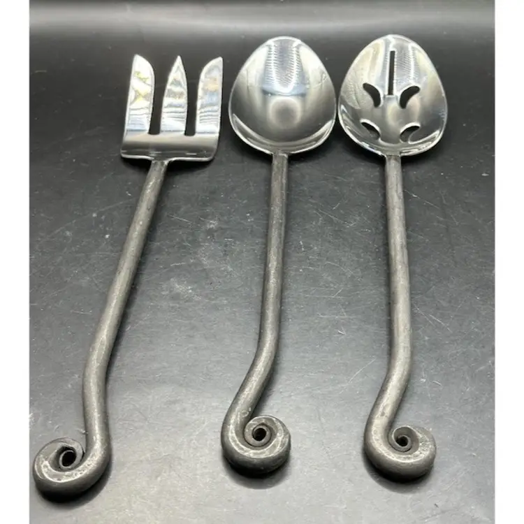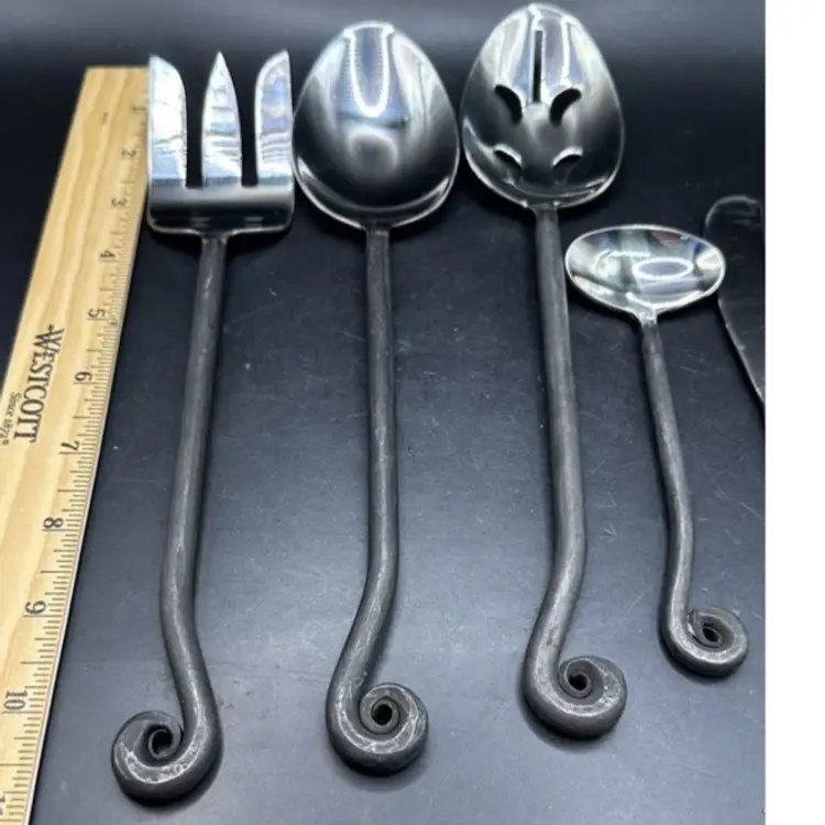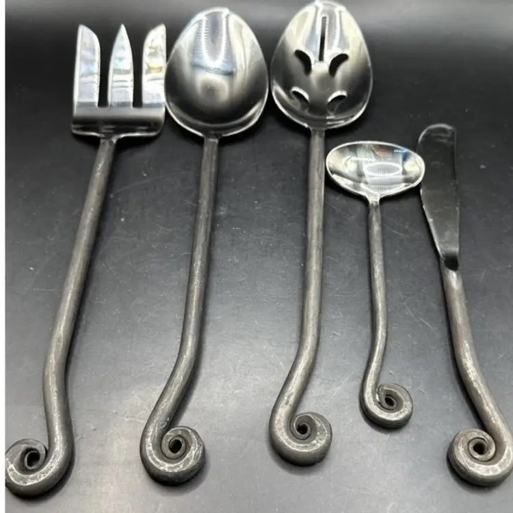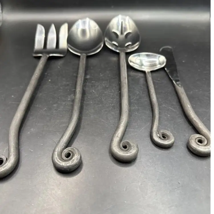 Add a touch of elegance to your dining experience with the Gourmet Settings Treble Clef 18/10 Stainless Steel 5pc. Hostess Set. This bundle includes 5 pieces of flatware with a stylish stainless steel design and black accents, perfect for any occasion.