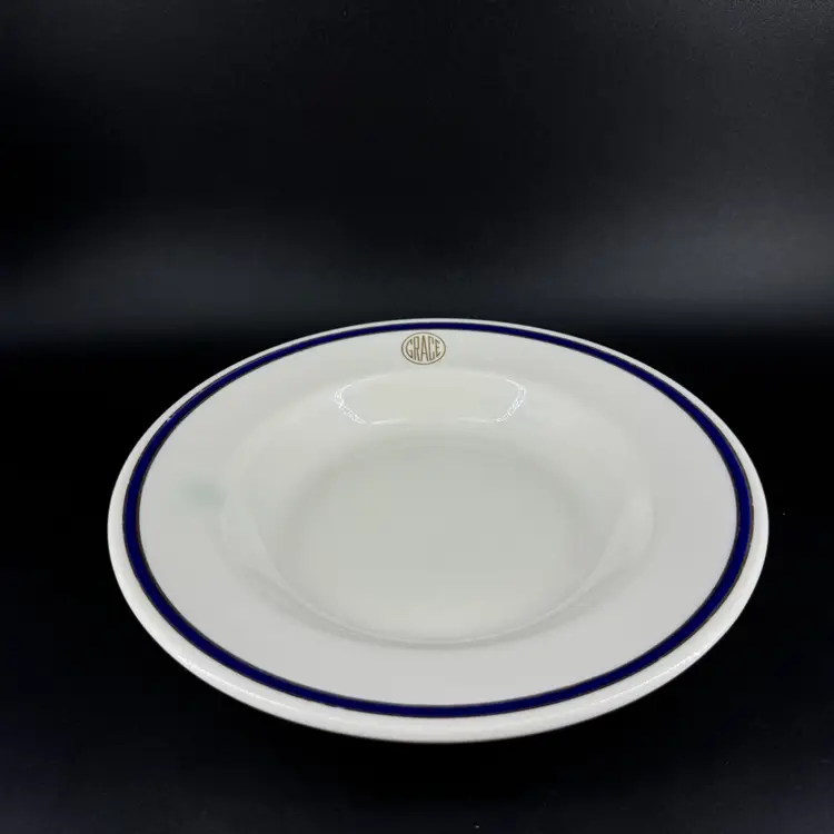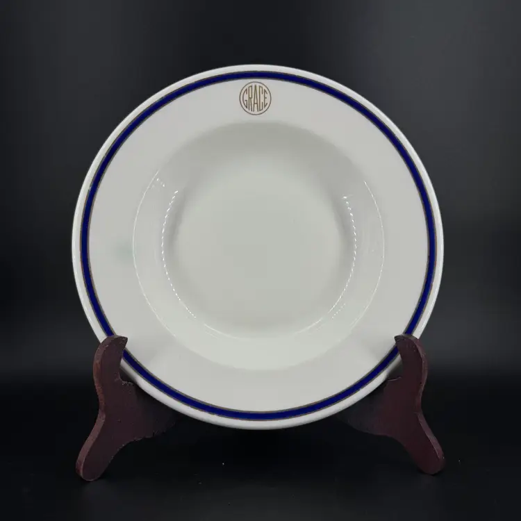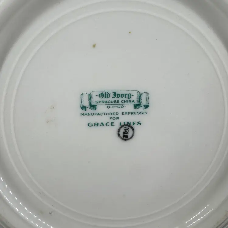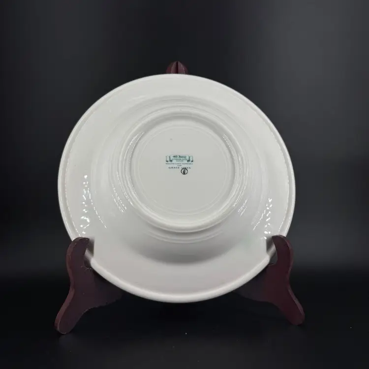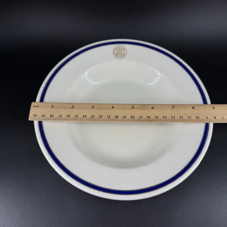 Width is approximately 9” No chips or cracks. Some wear on the gold. It is marked on the bottom, see photos. **Plate holder not included.