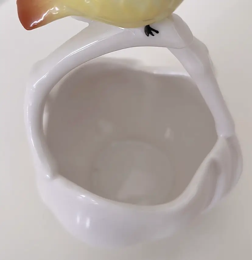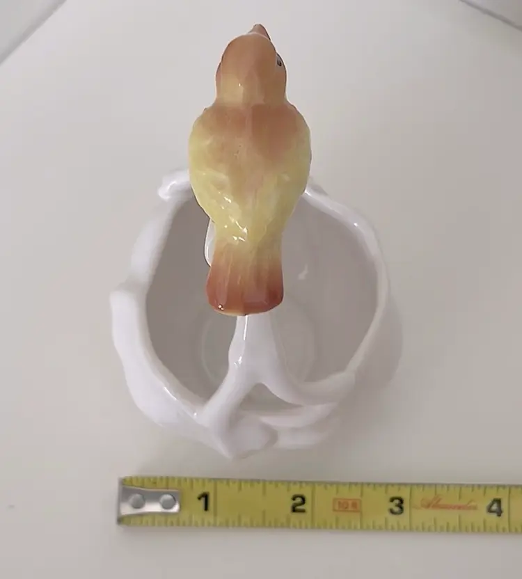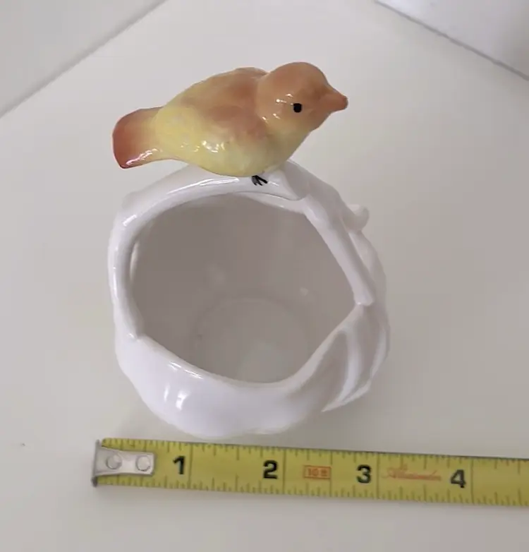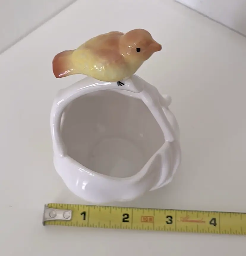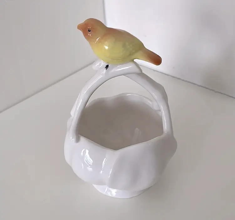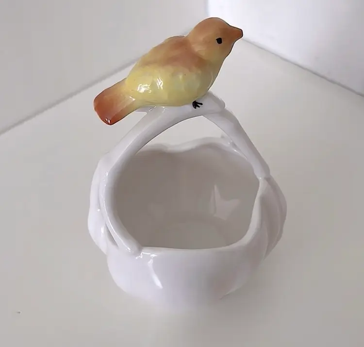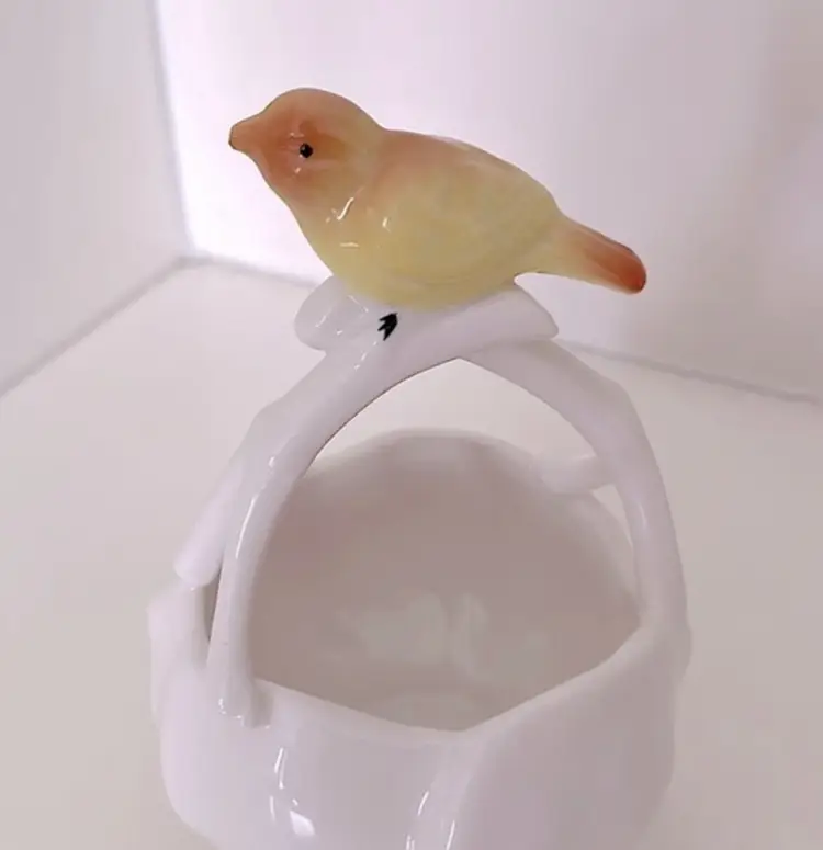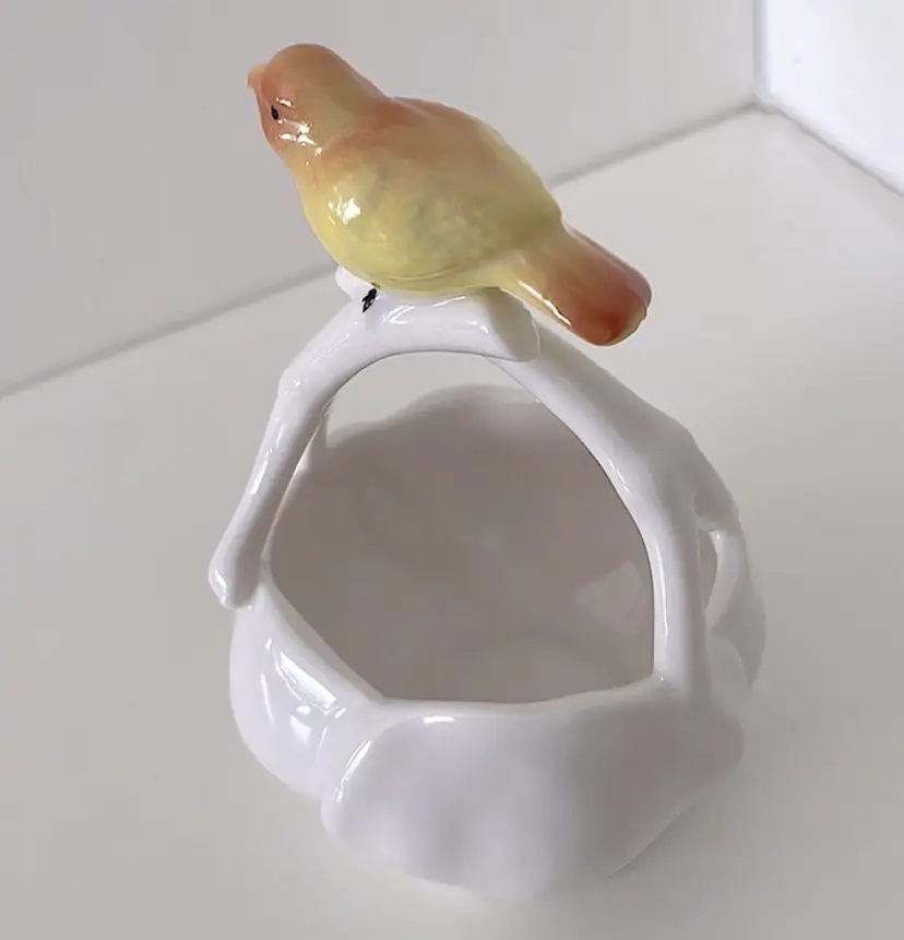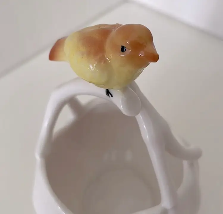 Gracie China for Coastline Imports, yellow bird sitting on a white basket. Adorable, in perfect condition!