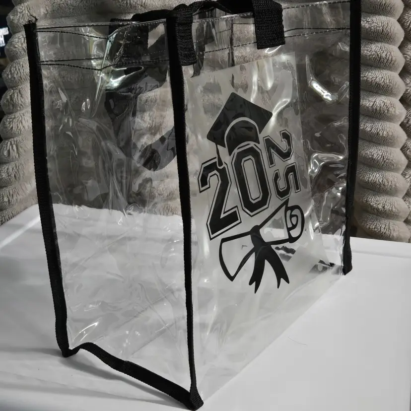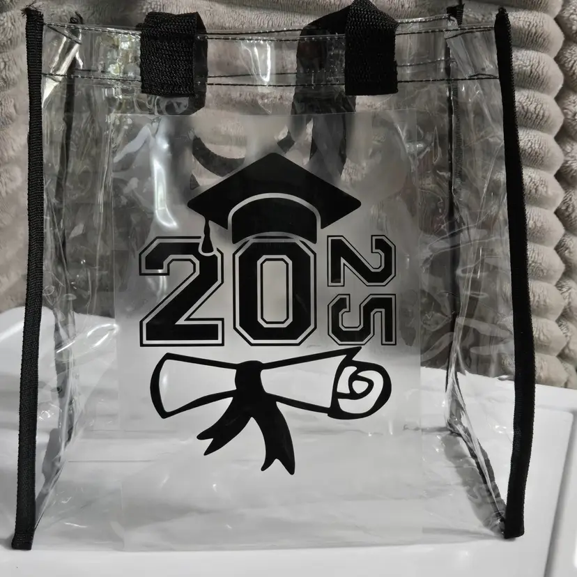 Cap and Diploma Decal. Clear Reusable Stadium Tote Bag with Black Trim. PVC, sturdy, lightweight and waterproof. Class of 2025. Graduation. Size 12 x 6 x 12