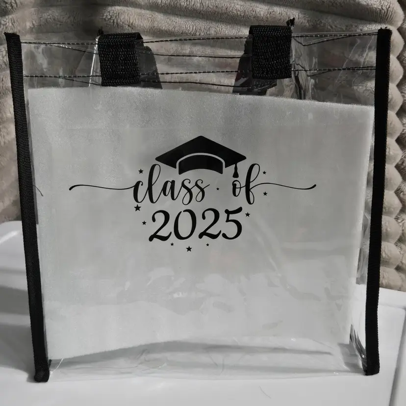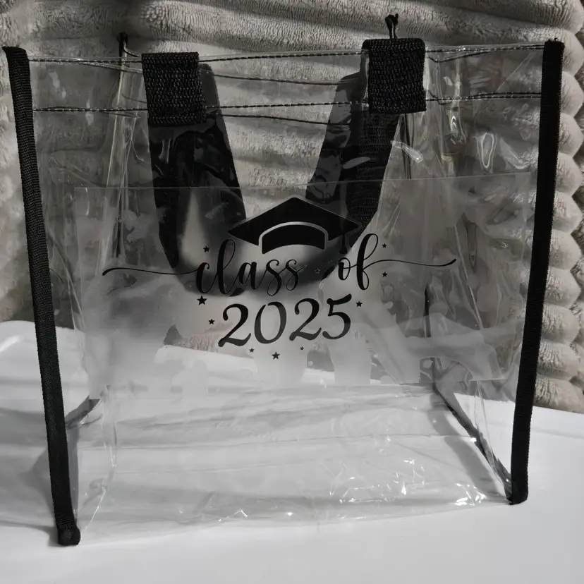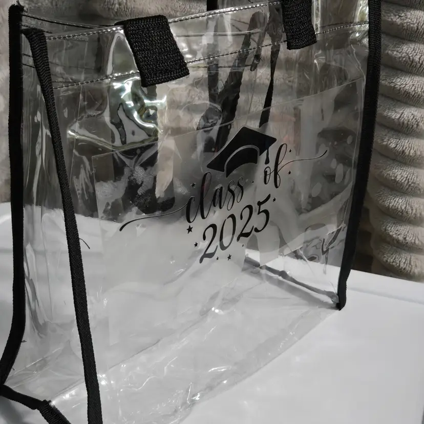 Class of 2025 Decal. Clear Reusable Stadium Tote Bag with Black Trim. PVC, sturdy, lightweight and waterproof. Graduation. Size 12 x 6 x 12