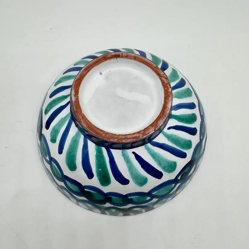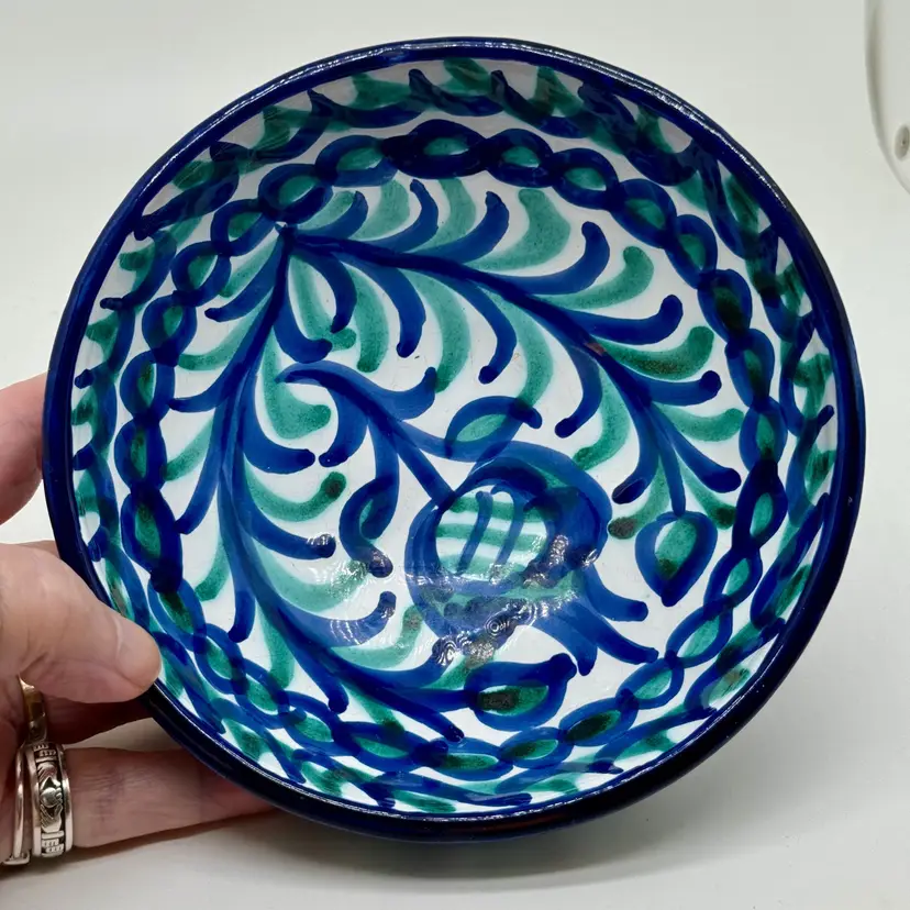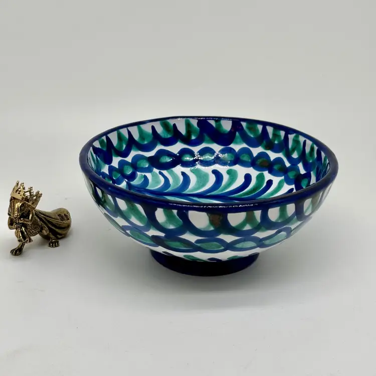 This decorative glazed terracotta footed bowl from Granada Fajalauza Spain is hand-painted blue & green on white. It is 2.5” high 5.75” diameter. It may be used for dining, perfect for condiments, tapas and “aperitivo or as a trinket bowl for your rings, etc. NOTE: the lurking PackratQueen mascot is NOT INCLUDED.