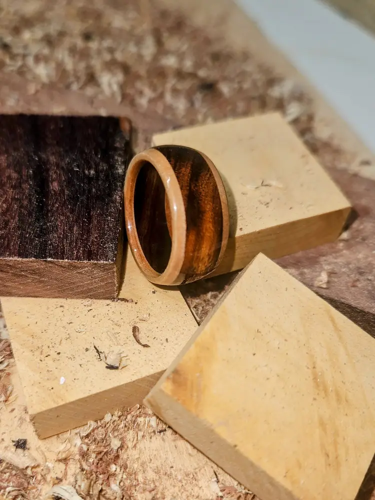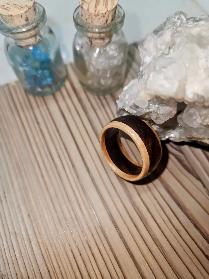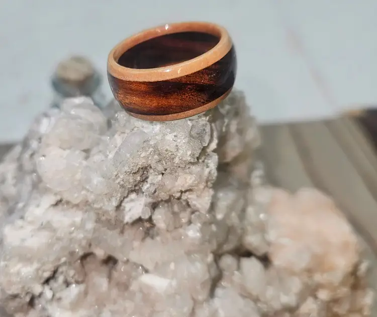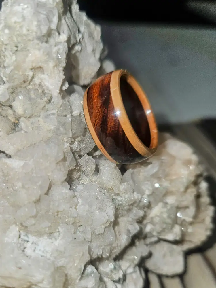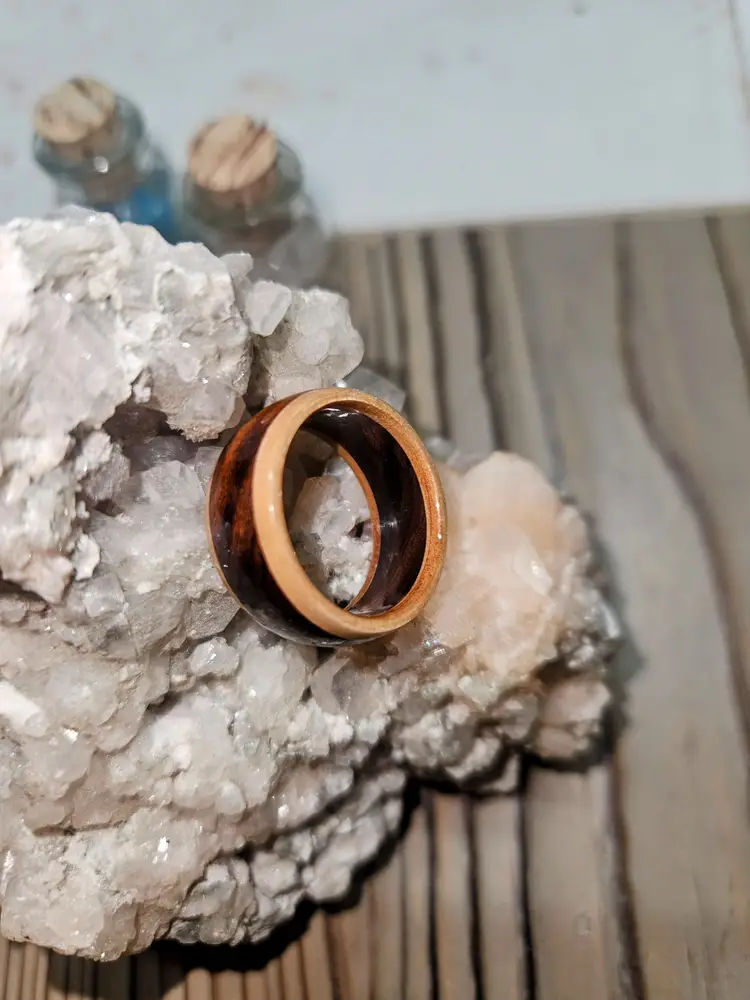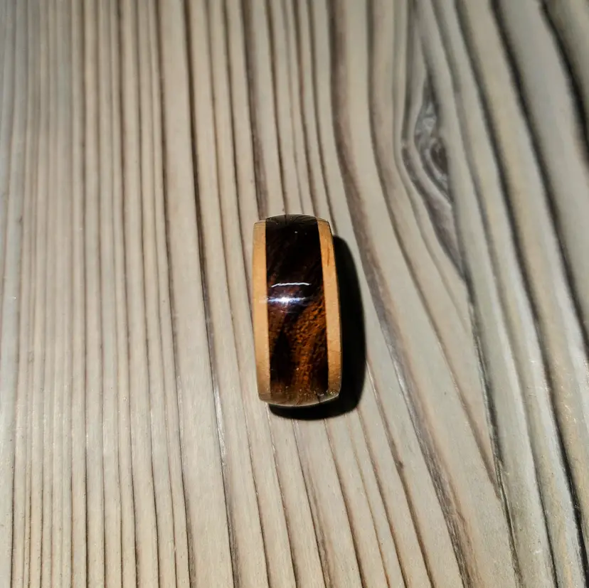 Size(s) 7,8,9,10,11. width 8mm. Handmade, Stabilized with epoxy resin making it very durable, however your new ring should be worn only in a professional and leisurely manner. Like any other ring it is open to scratching and scuffing. Please wear with this in mind. Avoid hard labor while wearing. ex. Construction, yardwork, factory work as this leaves it more open to damage. 100% waterproof, but please avoid contact with harsh chemicals such as bleach, ammonia, alcohol, thinners. Thank you very much for your interest and have a great day!