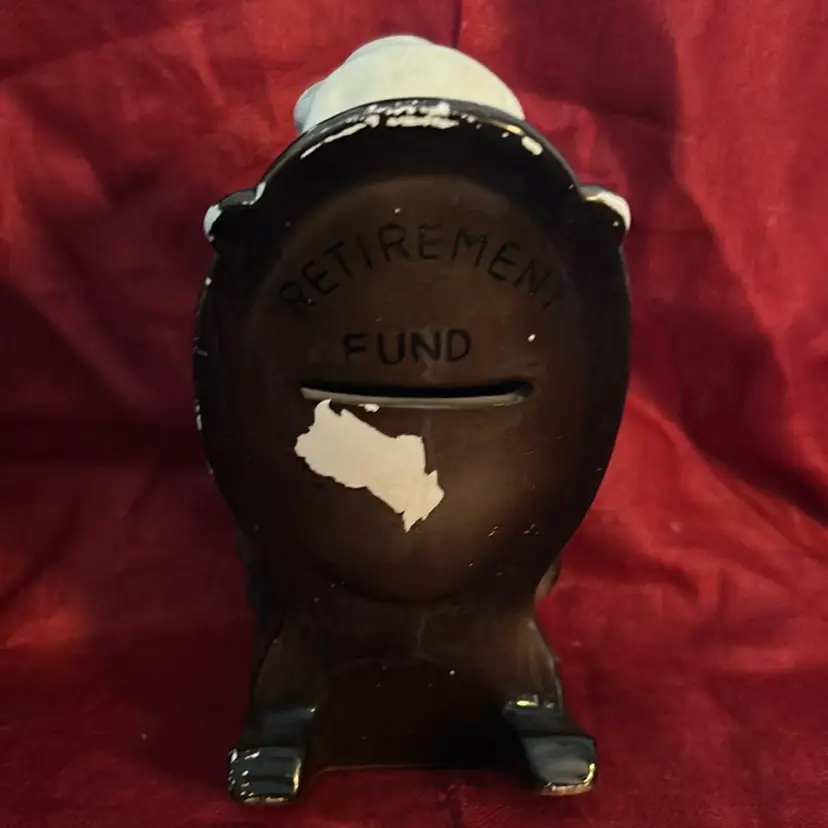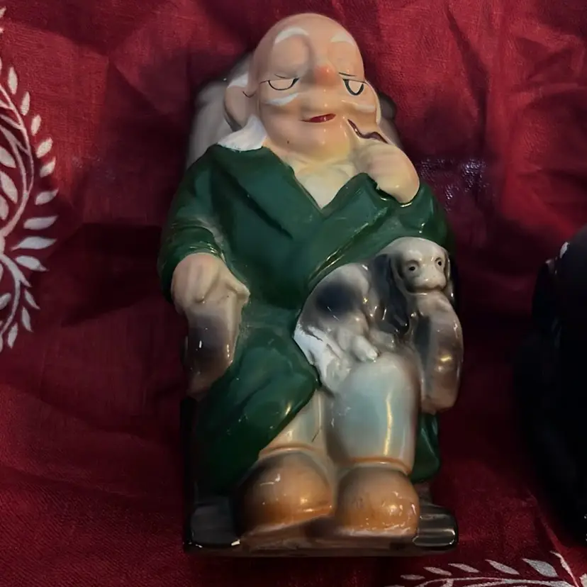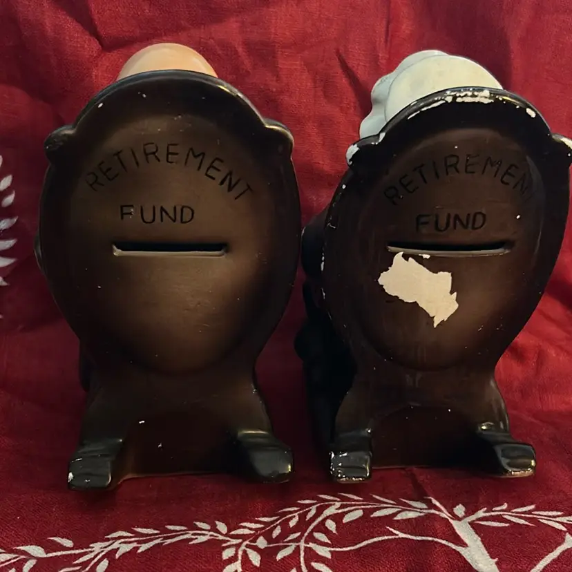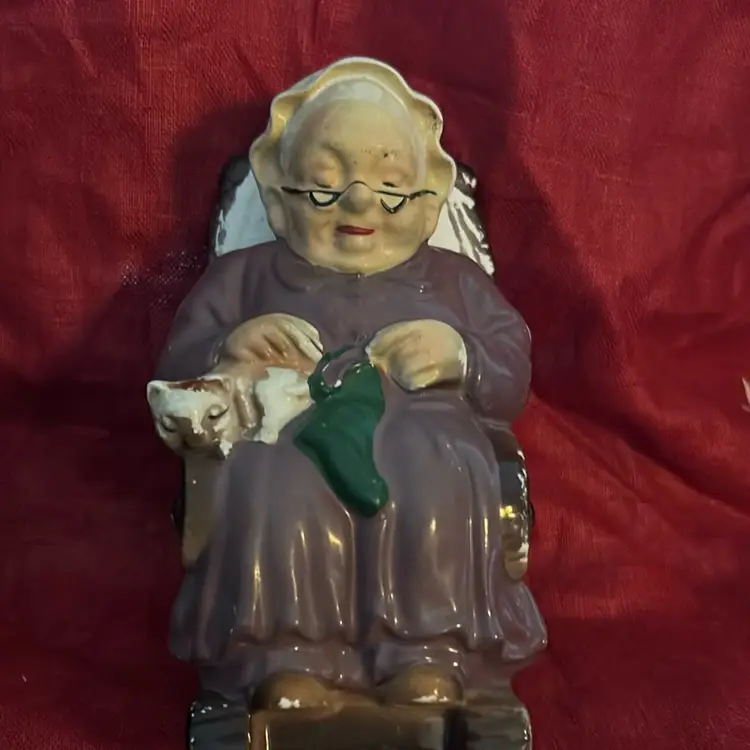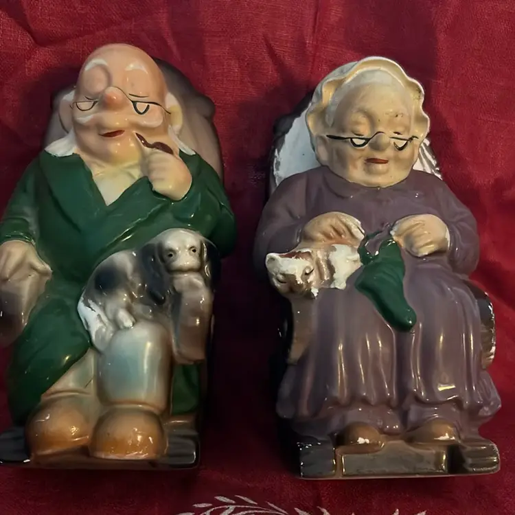These are the cutest 2 banks. In not bad shape for their age. Some paint loss on both. Grandma doesn’t have a stopper, but Grandpa does. They both measure: about 6 inches.