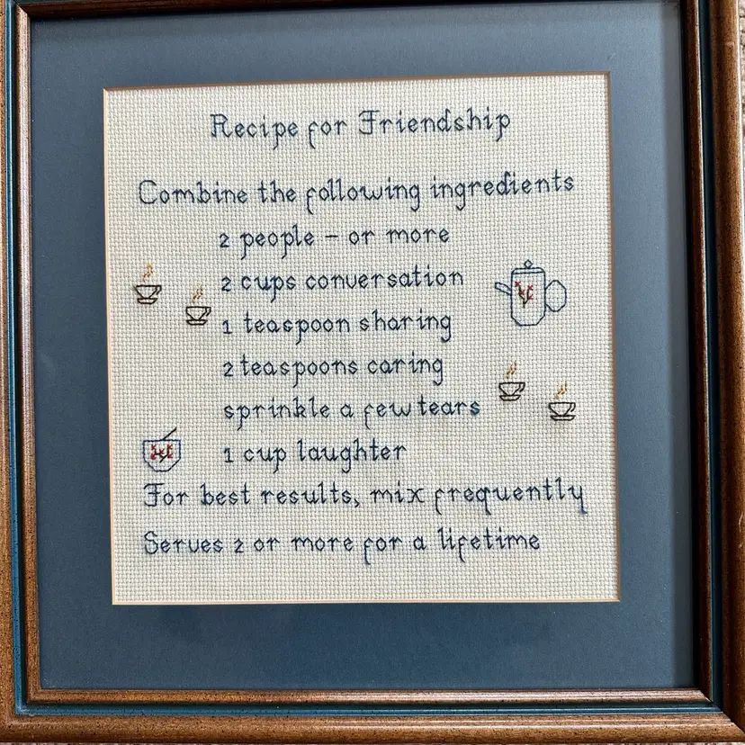 “Grandma-core” Vintage framed cross-stitch piece with a "Recipe for Friendship". Perfect for a Grandma-core Kitchen!