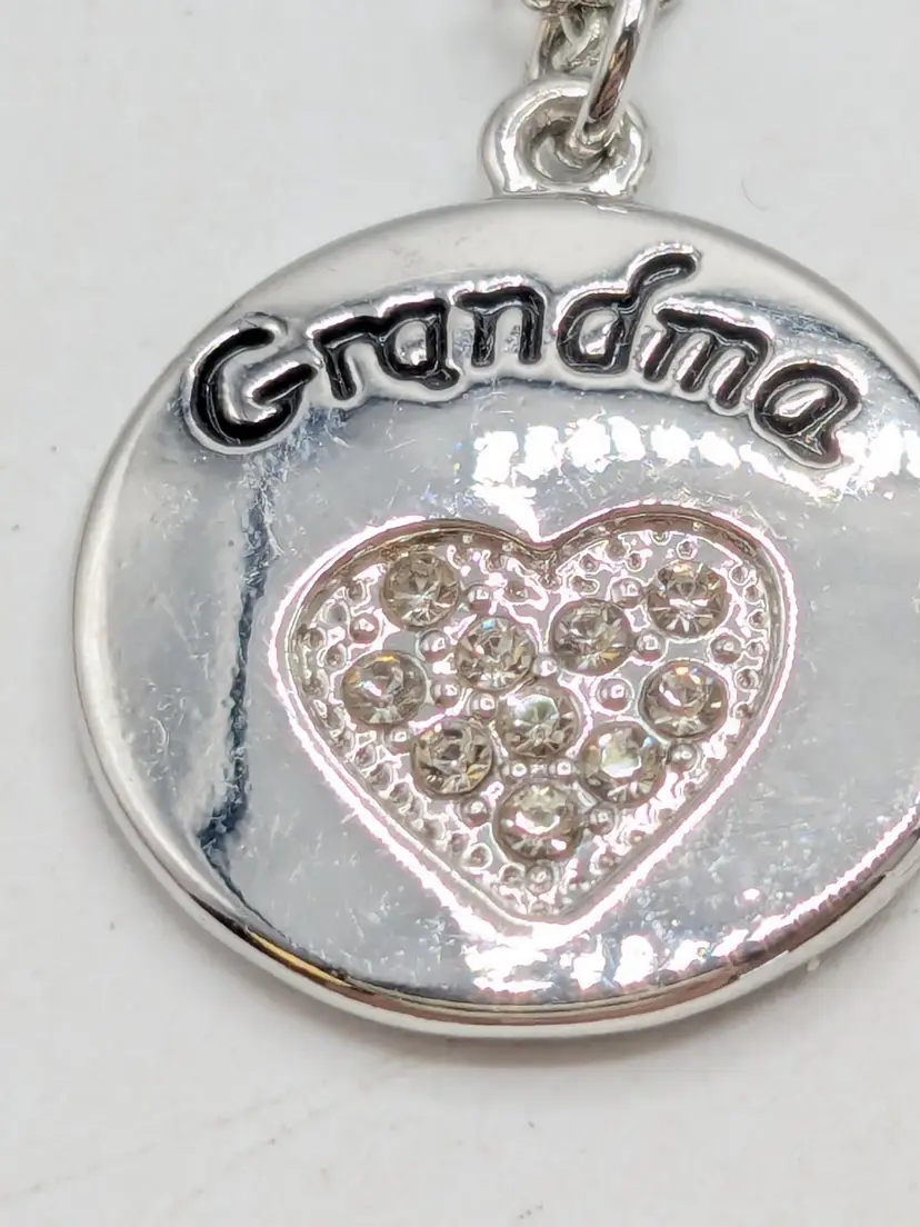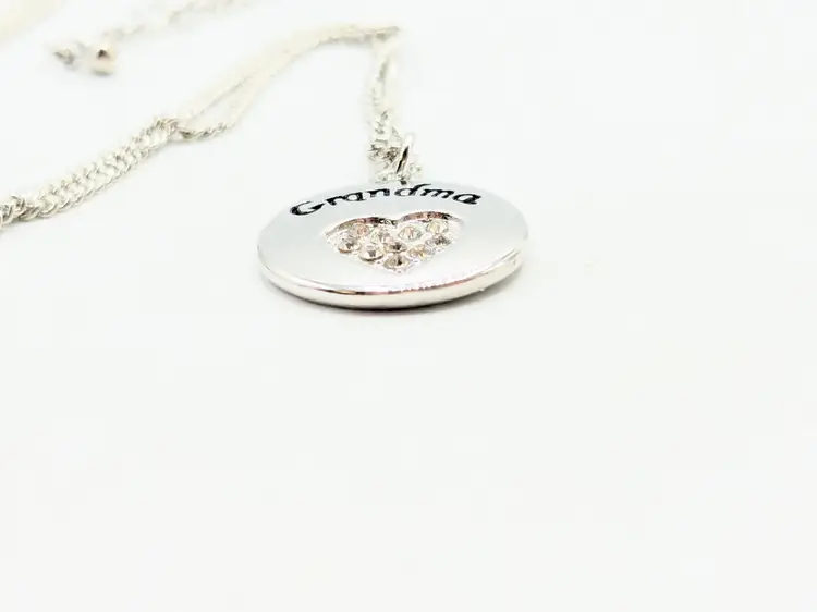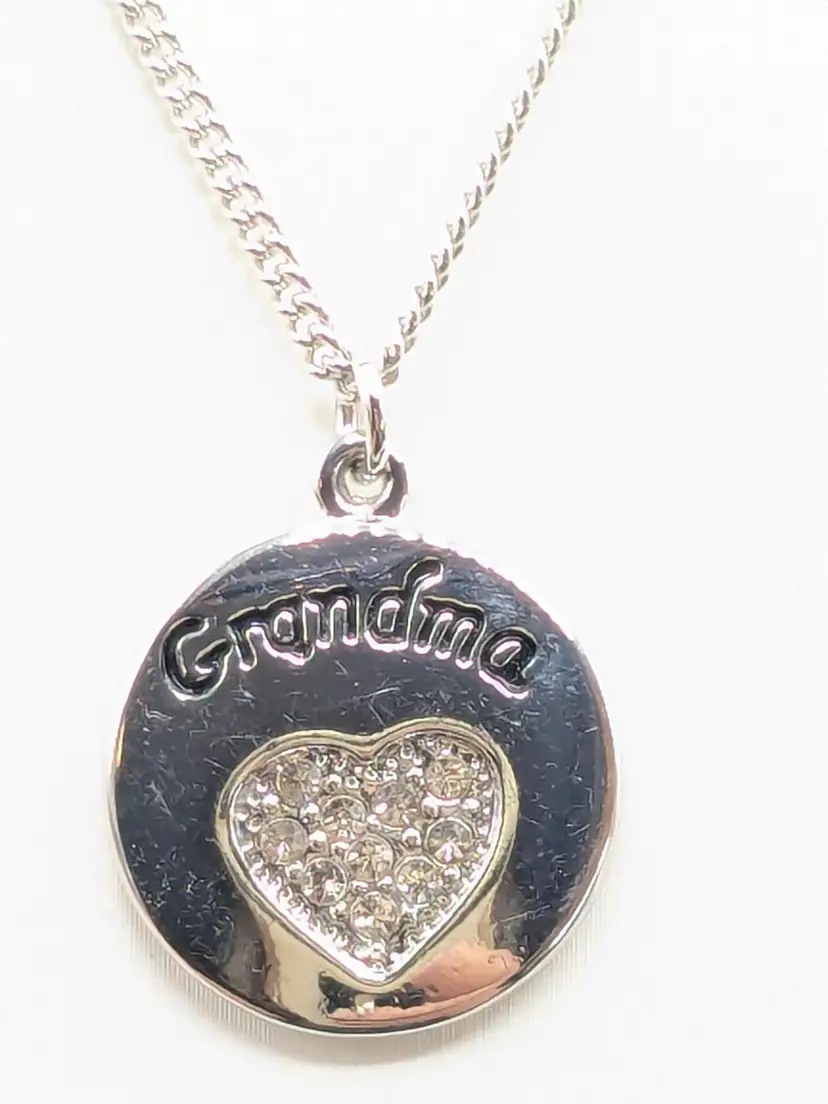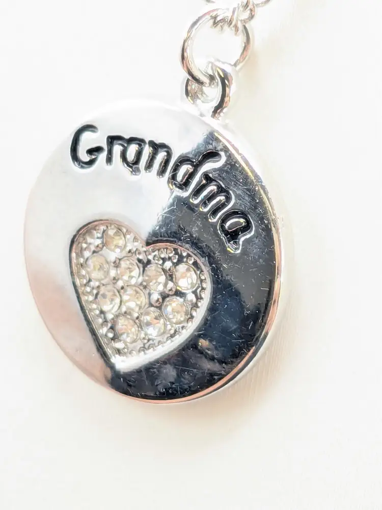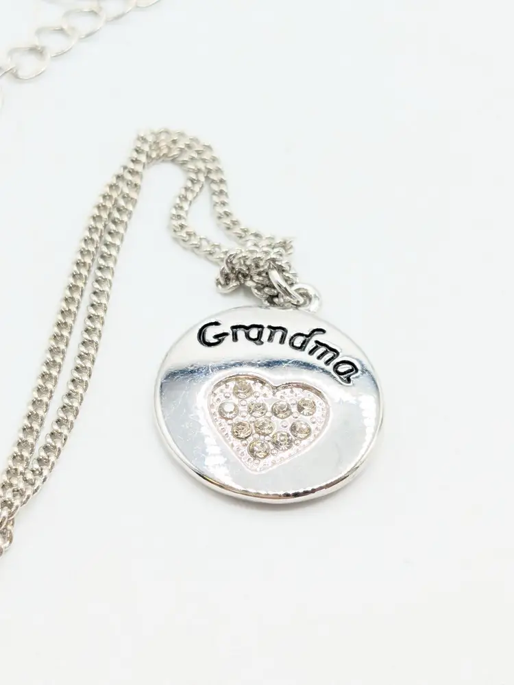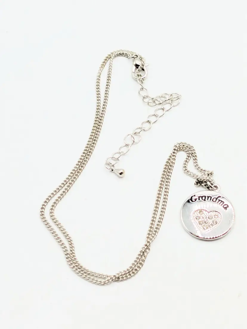 Good condition. Shiny and sparkly. Silver tone pendant with 'Grandma' engraving and rhinestone heart. Necklace measures 20" + 3" extension. (EN1)