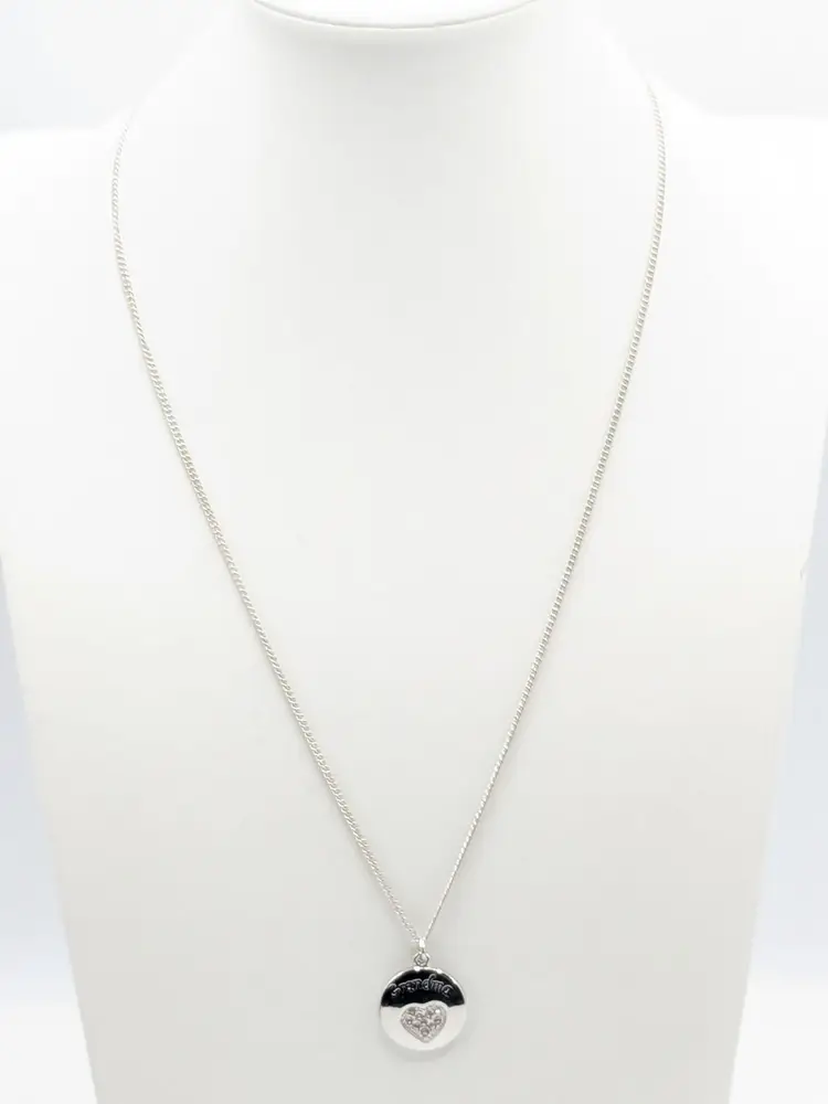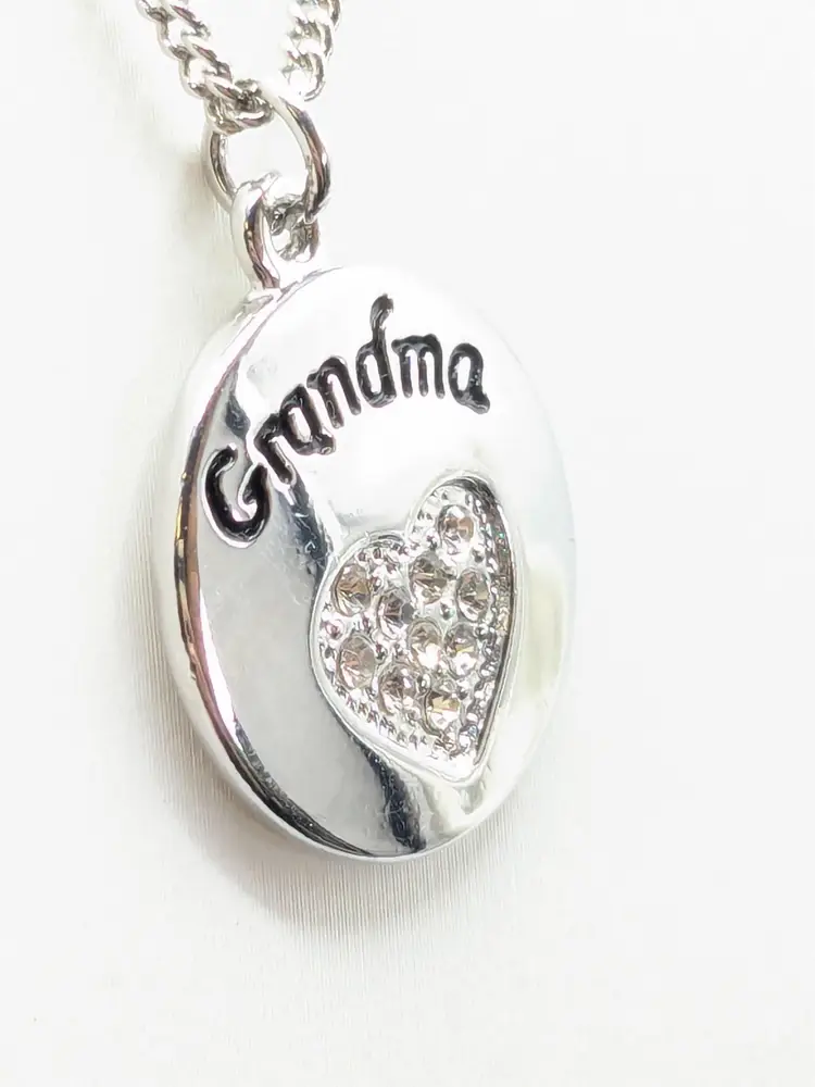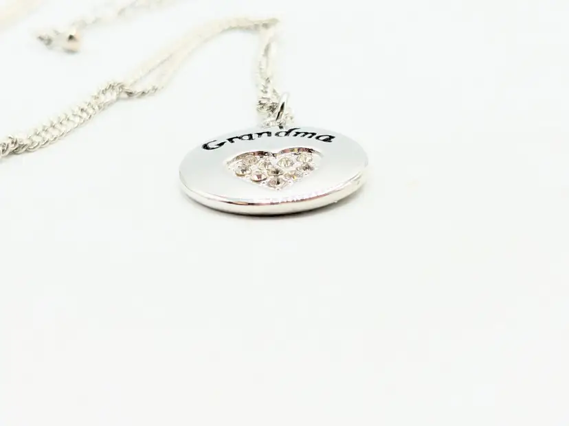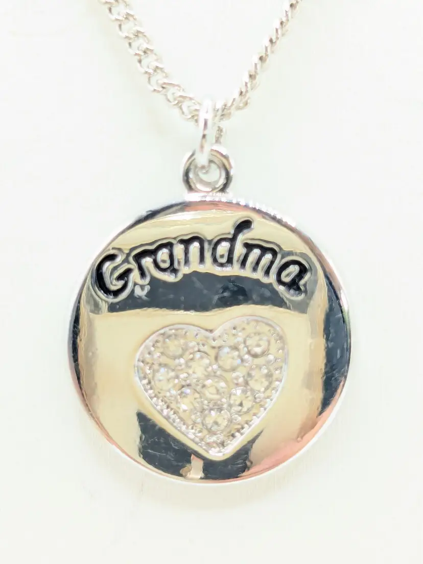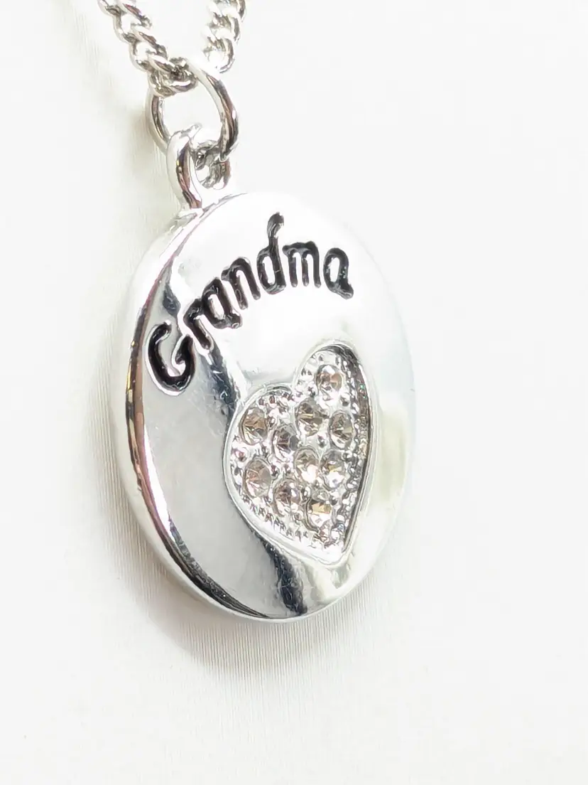 Good condition. Shiny and sparkly. Silver tone pendant with 'Grandma' engraving and rhinestone heart. Necklace measures 20" + 3" extension. (EN1)