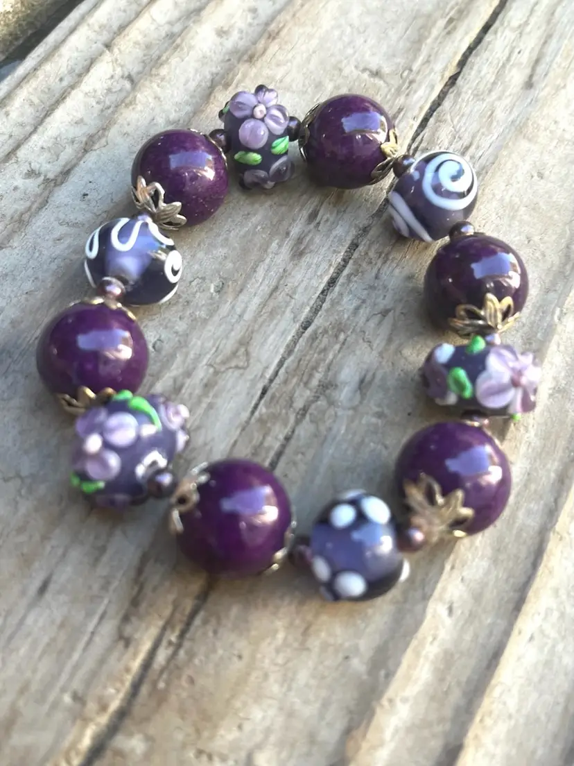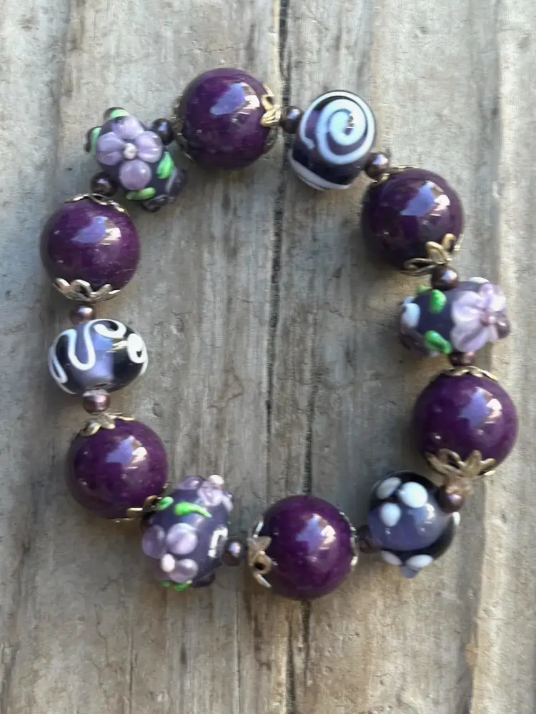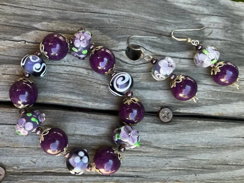 A Lampwork and focal beaded stretch bracelet and earring set. The earrings are approximately2 inches long. The stretch bracelet fits a 7 to 7 1/2 inch wrist. The beads are 8mm and 10 mm. Artisan.