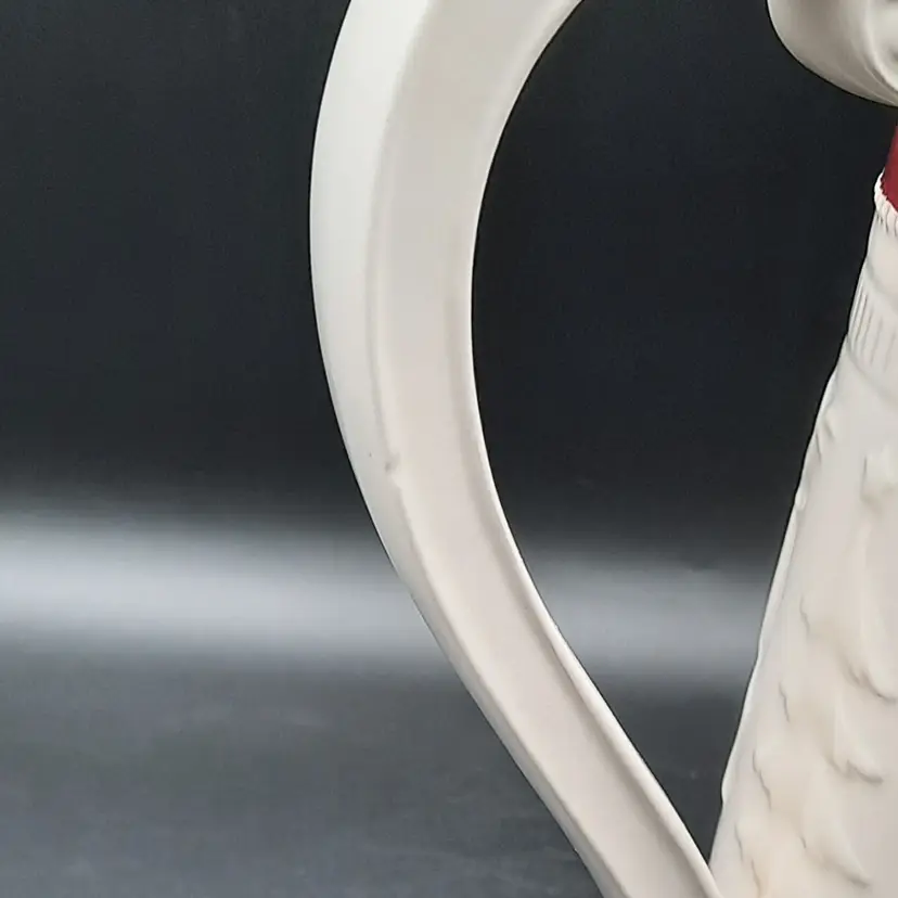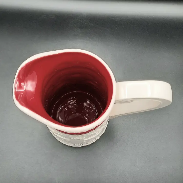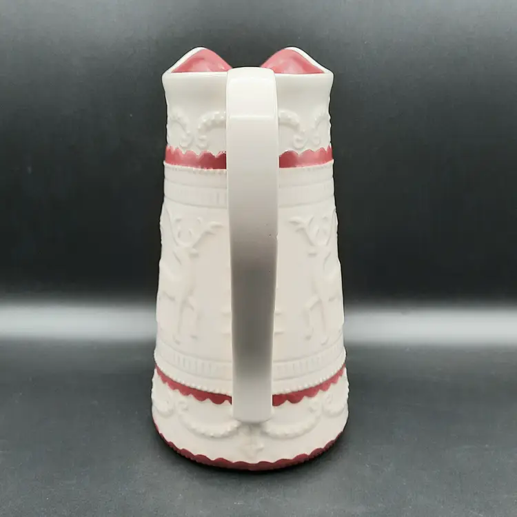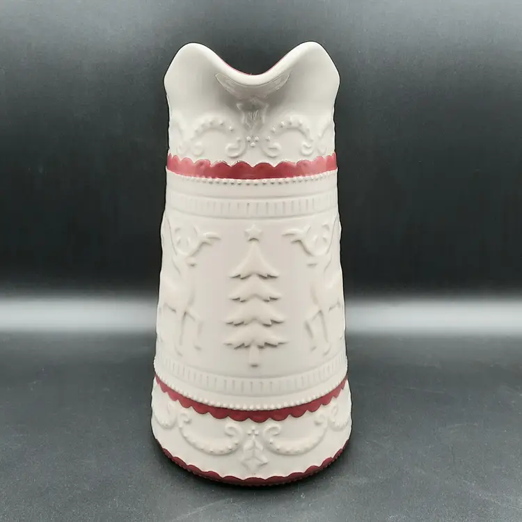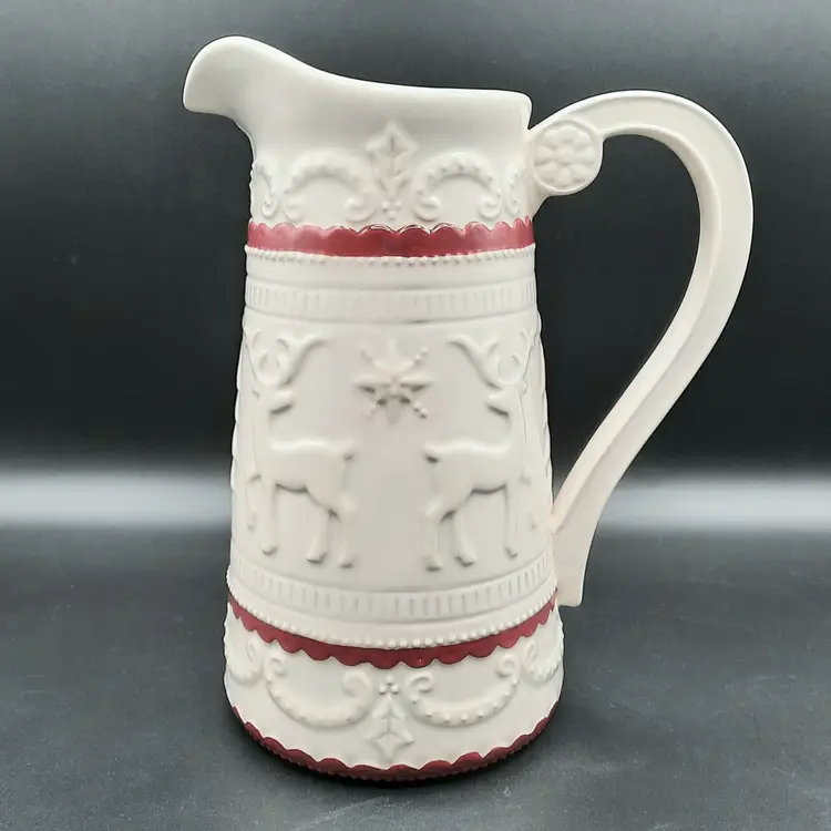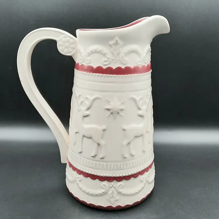 Beautiful Christmas red & ivory ceramic pitcher with deer, tree and scroll details, 10"H x 7 1/2"W spout to handle in great condition, has one nick on handle that looks to be mfg defect that was glazed over