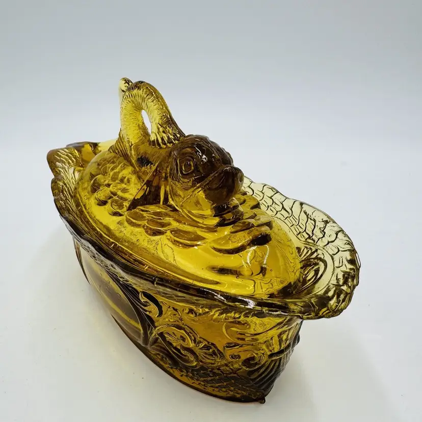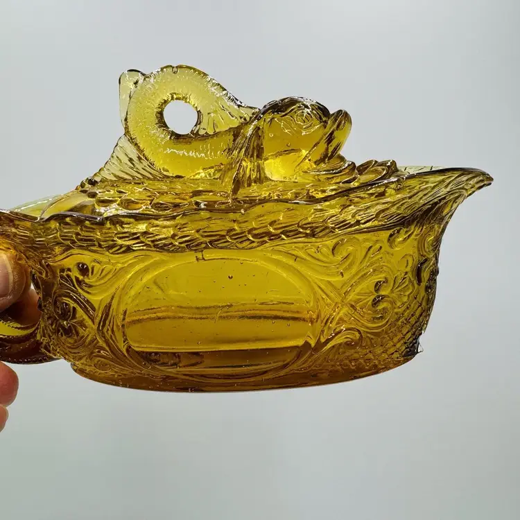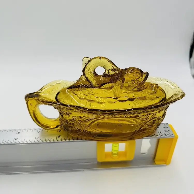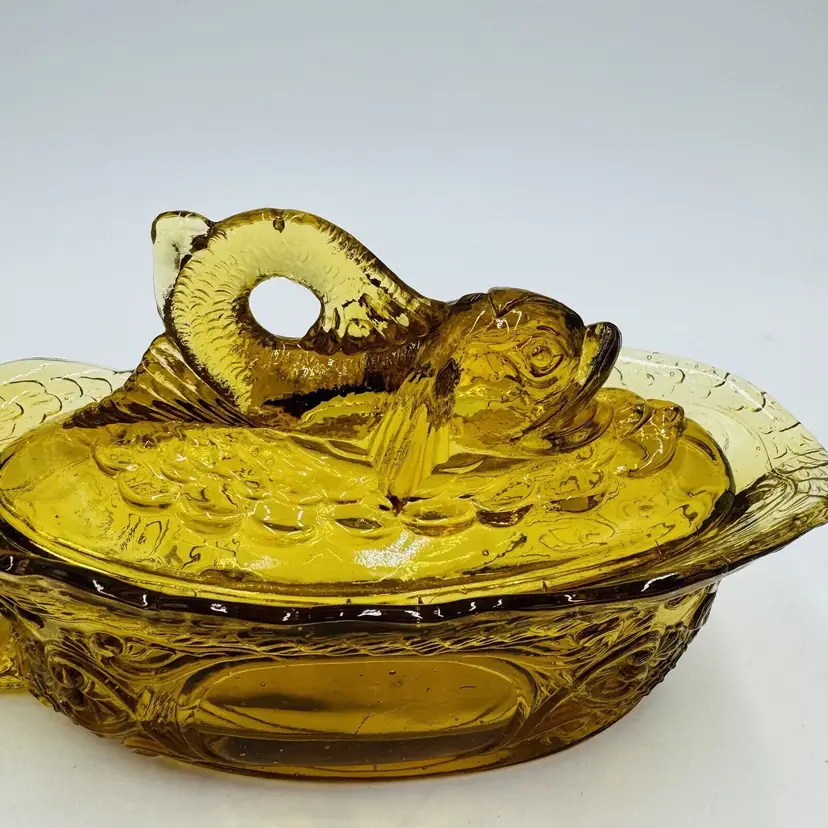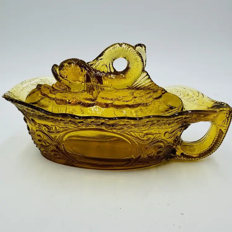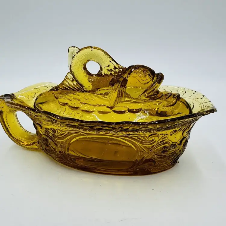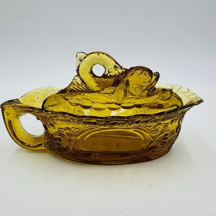 Handmade: No Item Width: 3” Pattern: Fish Production Technique: Studio Crafted Item Length: 6 7/8” Item Height: 3 3/4” Number of Items in Set: 2 Vintage: Yes Country/Region of Manufacture: Unknown Origin: Unknown Material: Glass Glassmaking Technique: Molded Type of Glass: Elegant Glass Number of Compartments: 1 Model: Gravy Boat / Covered Dish Product Line: Gravy Boat Shape: Oval Finish: Glossy Production Style: Moulded Keeps Cold For: 1 3/4” Brand: Unmarked Style: Art Deco Color: Amber Original/Licensed Reproduction: Original Backstamp: No Theme: Fish Item Depth: 1 3/4” Type: Covered Dish