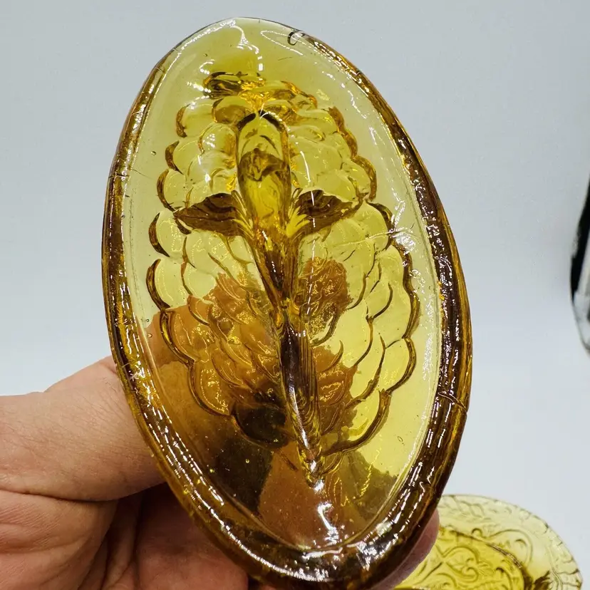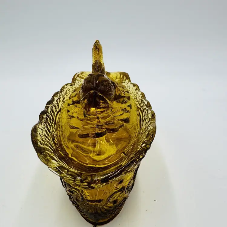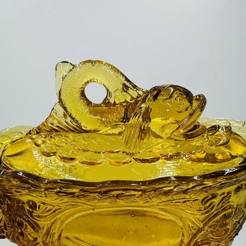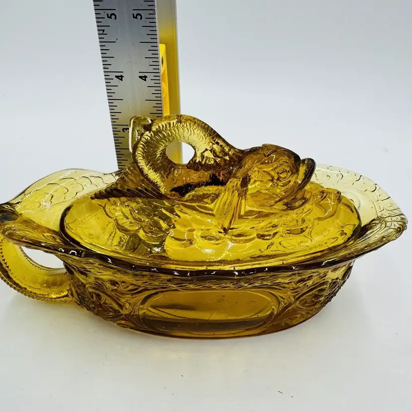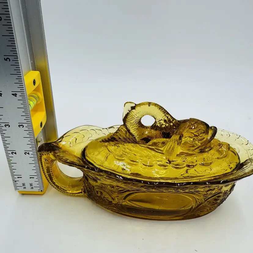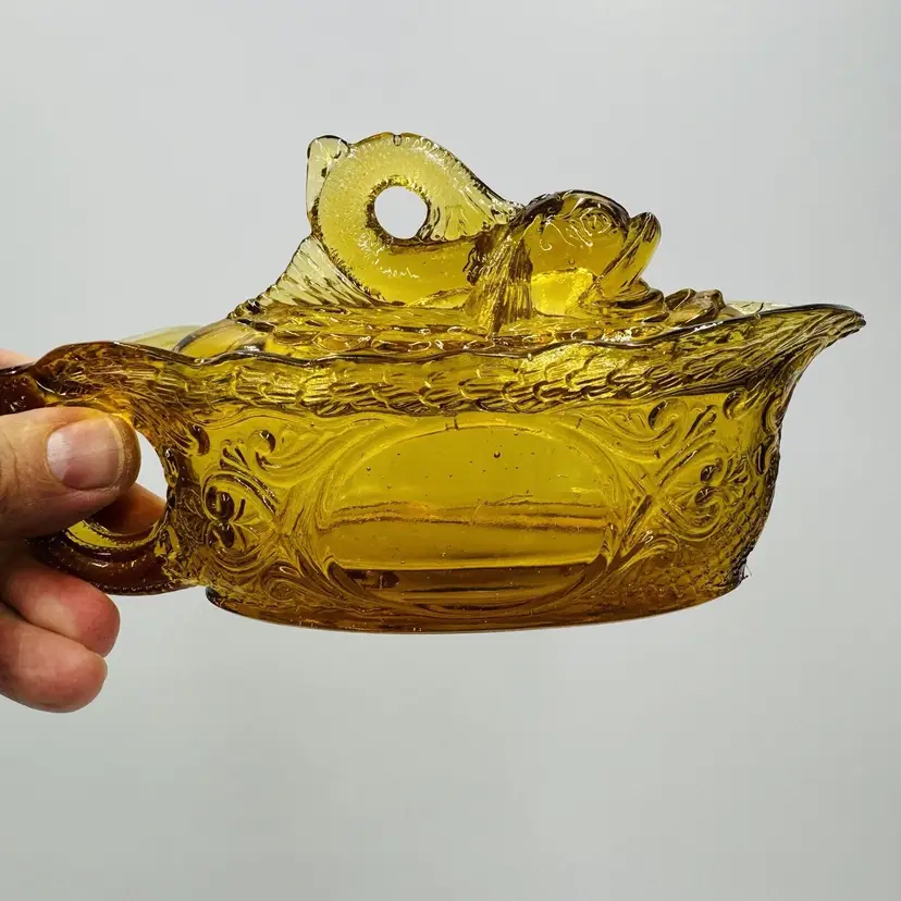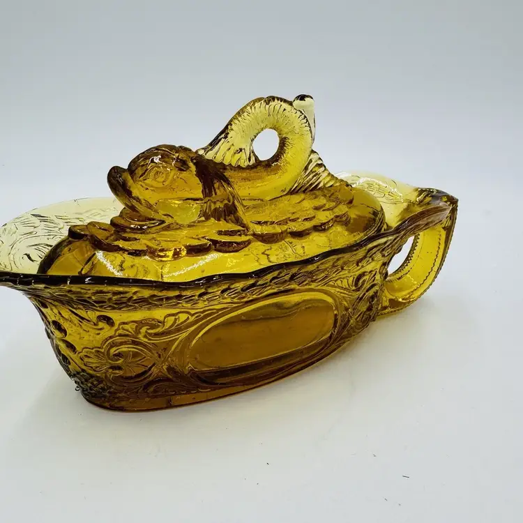 Handmade: No Item Width: 3” Pattern: Fish Production Technique: Studio Crafted Item Length: 6 7/8” Item Height: 3 3/4” Number of Items in Set: 2 Vintage: Yes Country/Region of Manufacture: Unknown Origin: Unknown Material: Glass Glassmaking Technique: Molded Type of Glass: Elegant Glass Number of Compartments: 1 Model: Gravy Boat / Covered Dish Product Line: Gravy Boat Shape: Oval Finish: Glossy Production Style: Moulded Keeps Cold For: 1 3/4” Brand: Unmarked Style: Art Deco Color: Amber Original/Licensed Reproduction: Original Backstamp: No Theme: Fish Item Depth: 1 3/4” Type: Covered Dish