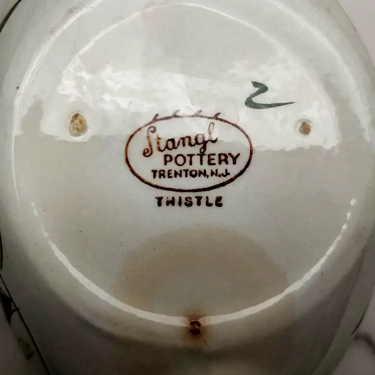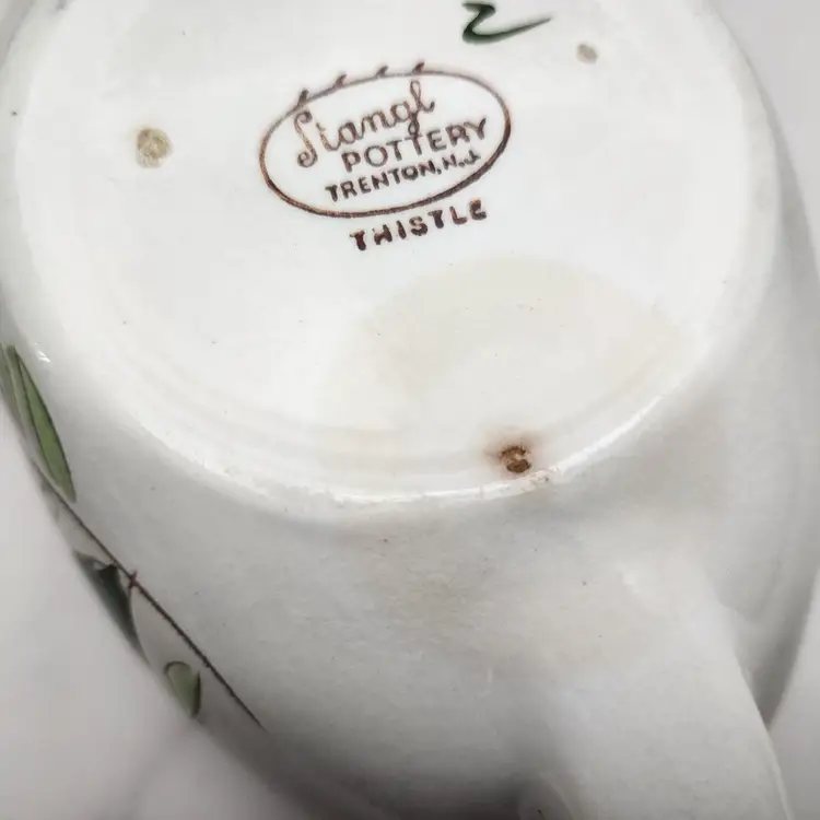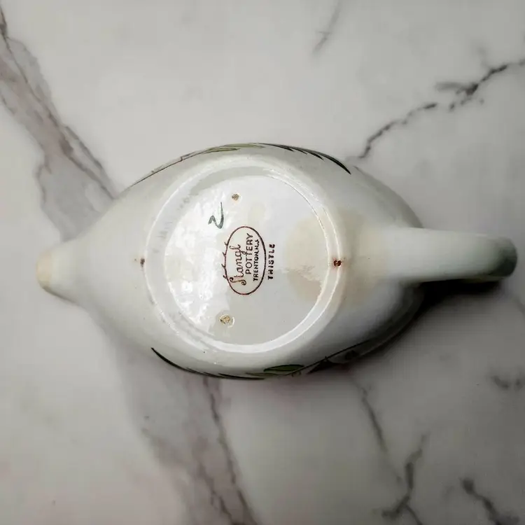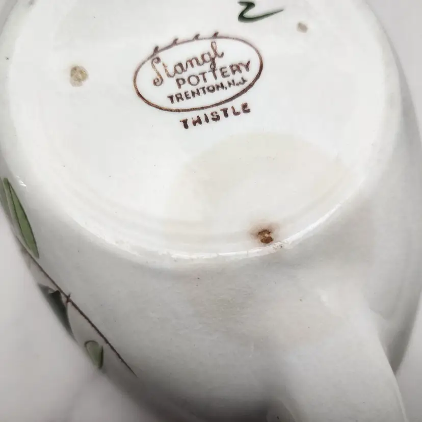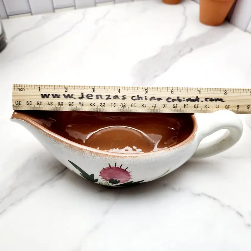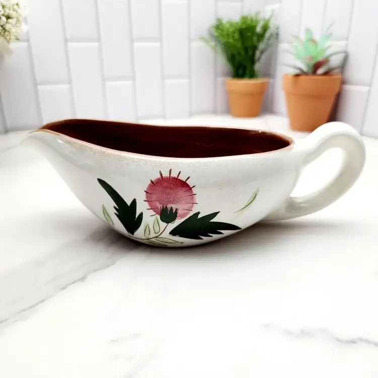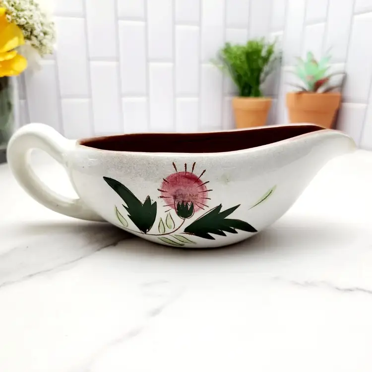 Vintage Handpainted Gravy Boat by Stangl Pottery NJ. Pink Thistle pattern. Vibe/Style: Vintage/Retro/Farmhouse/Country Cottage Pattern: Thistle (Pink Thistle) discontinued made between 1951 - 1978. Made by: Stangl Pottery, Trenton NJ USA Condition: Good: No Chips or Cracks. There is 2 spots of discoloration only visible when turned over. See Pics.