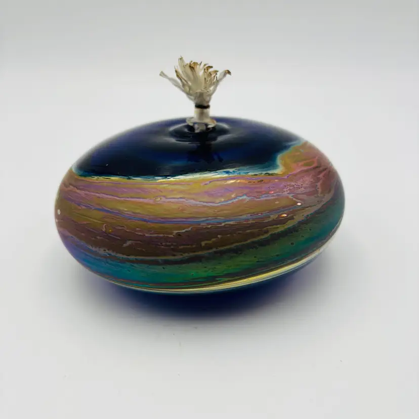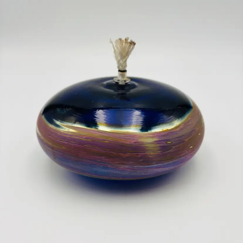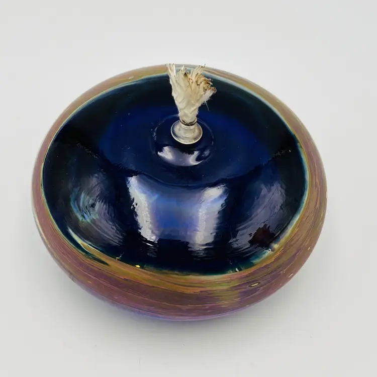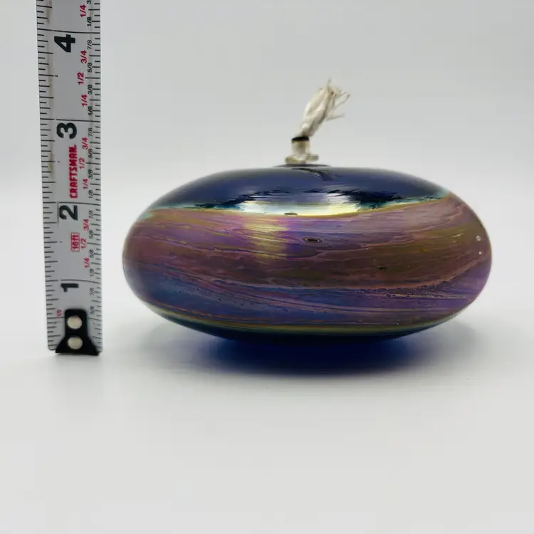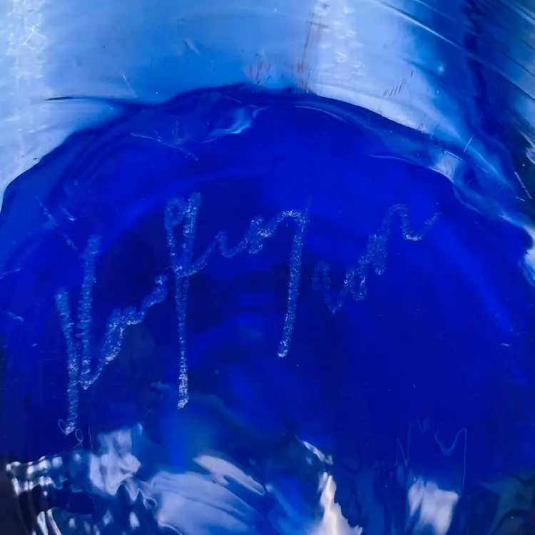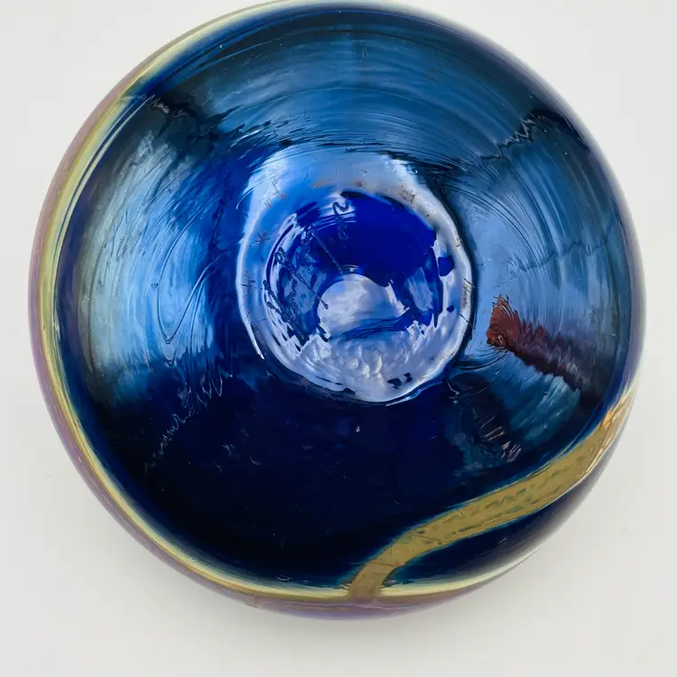 Features: it is signed "Kevin Gray 2002". He was a Canadian glass artist who passed away in 2012, the son took over the family business "Gray Art Glass". The upper half and bottom is a deep cobalt blue glass, the middle part of the glass is a banded pattern with shades of purple, bronze and teal. The colors appear to shift and change depending on the light and viewing angle.
