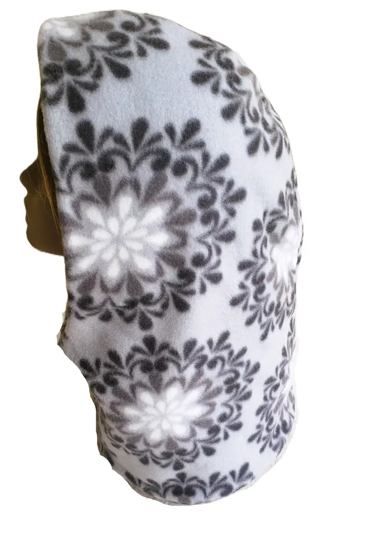 This hood is soft and cozy. It has a very nice pattern. The main color is gray and has a black and white floral medallion design on it. The lining is a coordinating gray. It is made of soft fleece. This will keep your head, neck and ears warm in those cold winter months. This hood is a one size fits all.