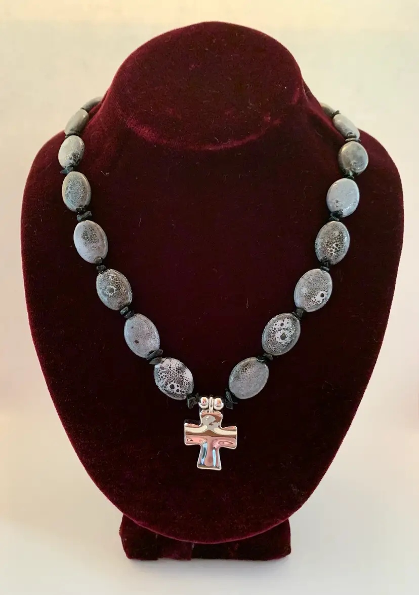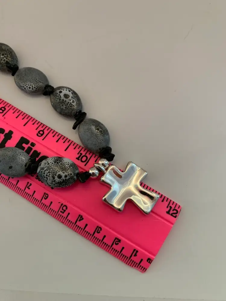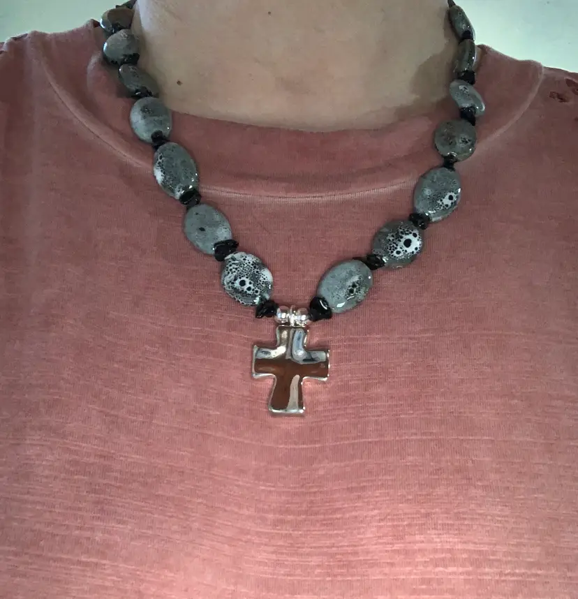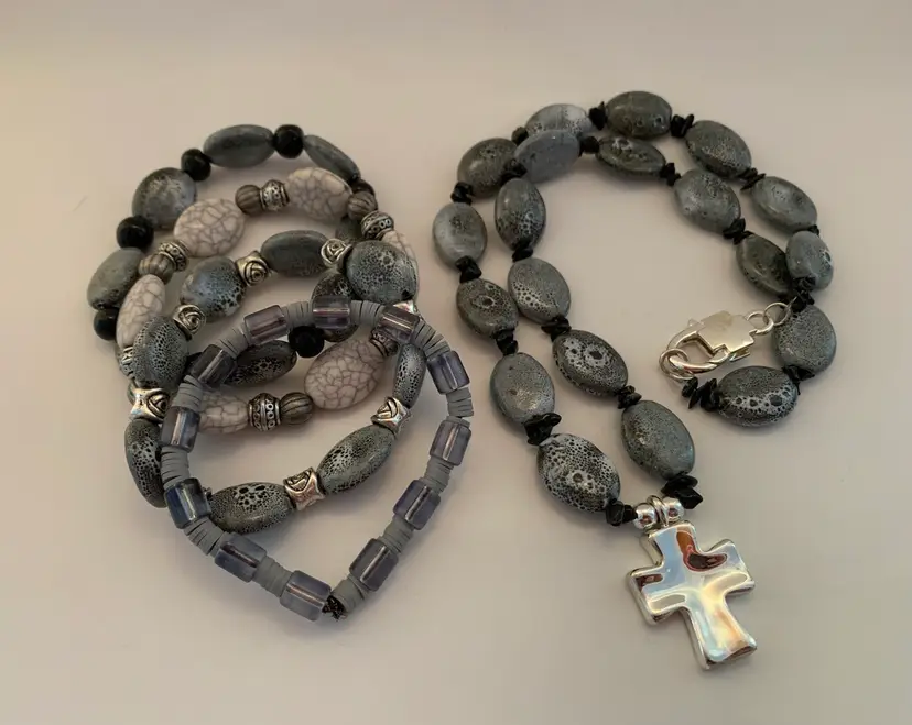 Gray ceramic and black stone chip necklace with a silver toned cross pendant and an oversized silver toned lobster claw closure. Coordinating 4 piece stretch bracelet stack is made from ceramic, glass, metal and plastic beads, strung on sturdy elastic. Necklace measures 10” in wearable length. Bracelets are about 7” in diameter.