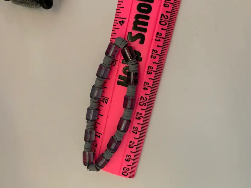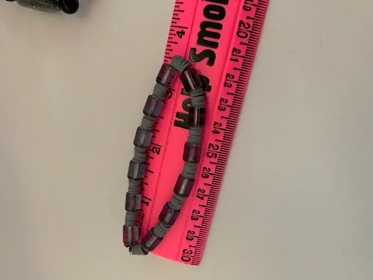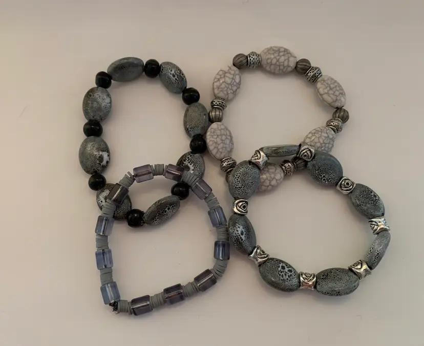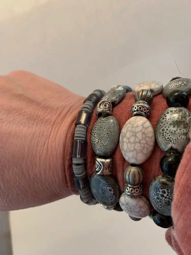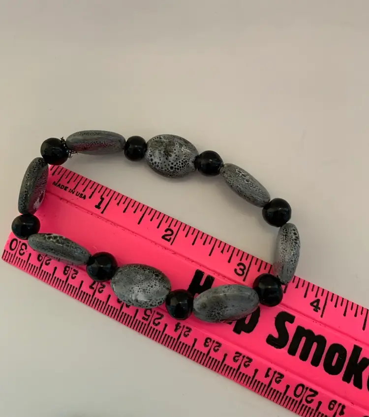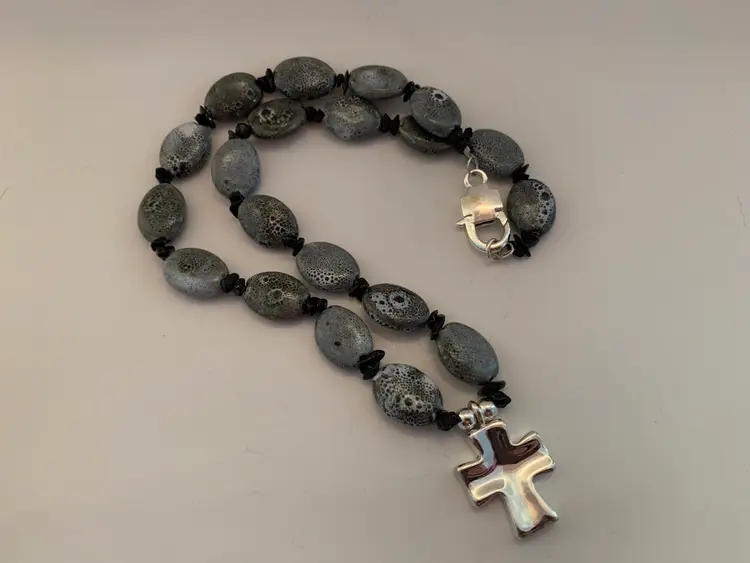 Gray ceramic and black stone chip necklace with a silver toned cross pendant and an oversized silver toned lobster claw closure. Coordinating 4 piece stretch bracelet stack is made from ceramic, glass, metal and plastic beads, strung on sturdy elastic. Necklace measures 10” in wearable length. Bracelets are about 7” in diameter.