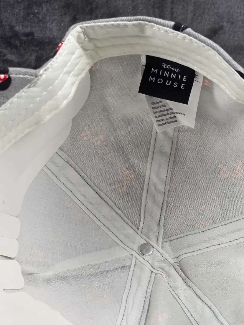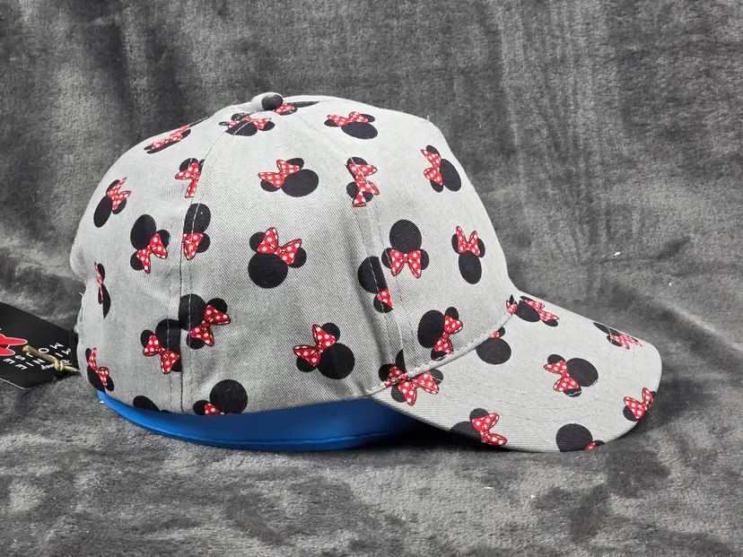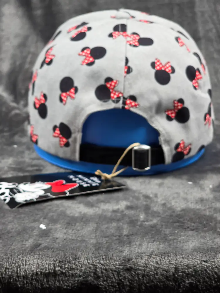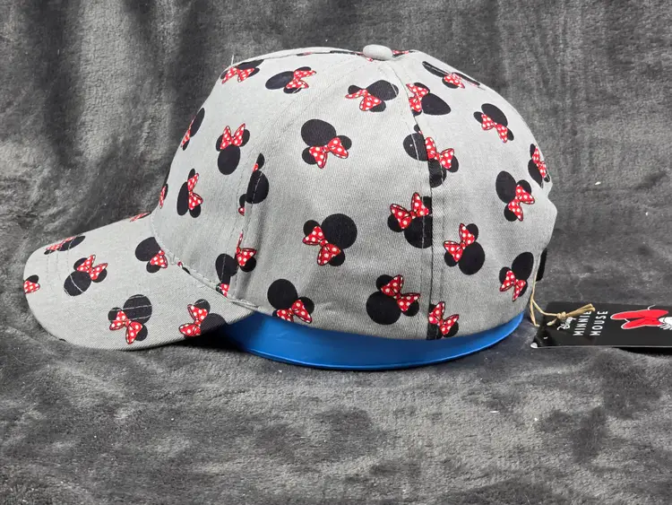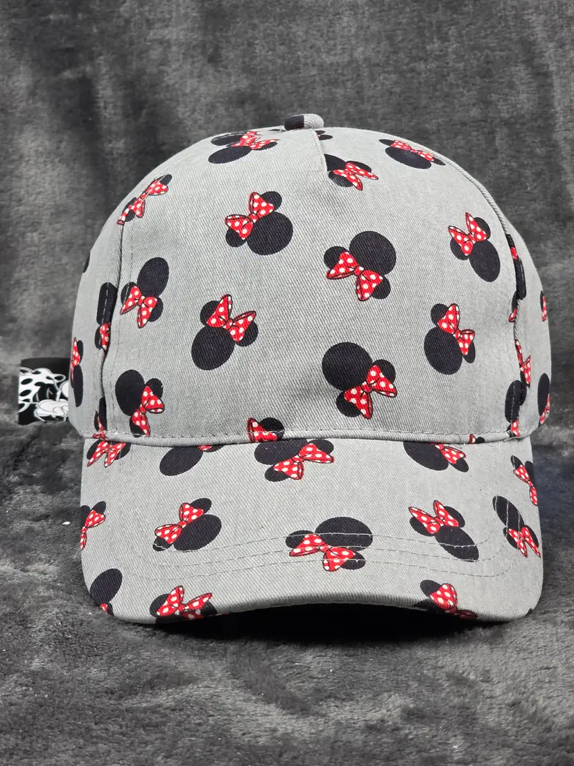 Celebrate your love for Disney with this stylish gray baseball cap featuring an all-over pattern of black Minnie Mouse head silhouettes, each adorned with red and white polka-dotted bows. The playful design adds a fun and fashionable twist to a classic accessory, perfect for theme park visits, casual outings, or Disneybounding.