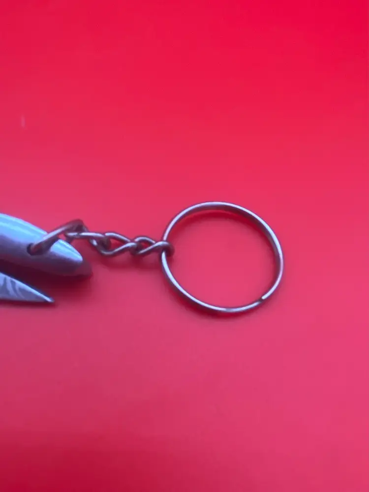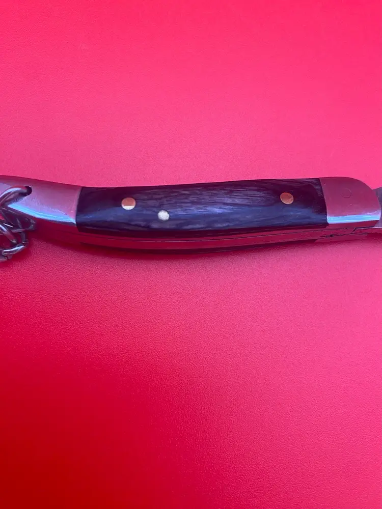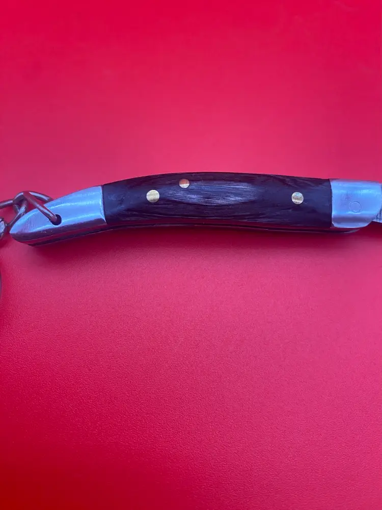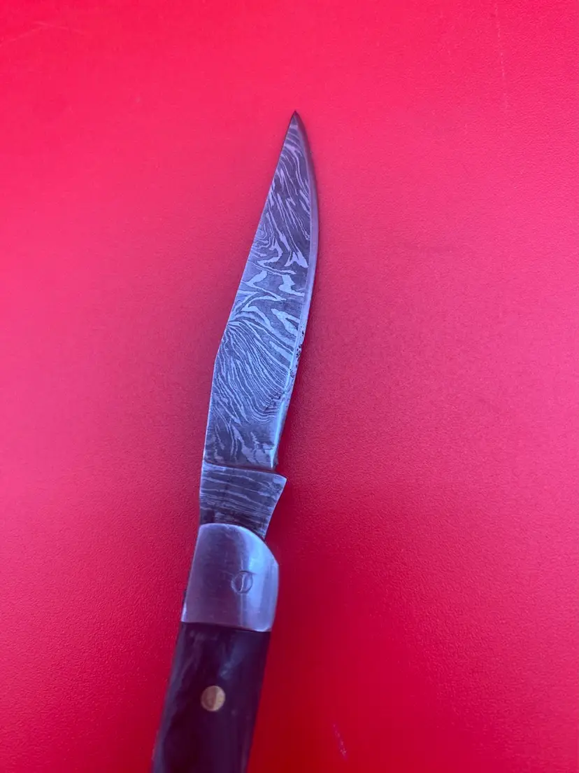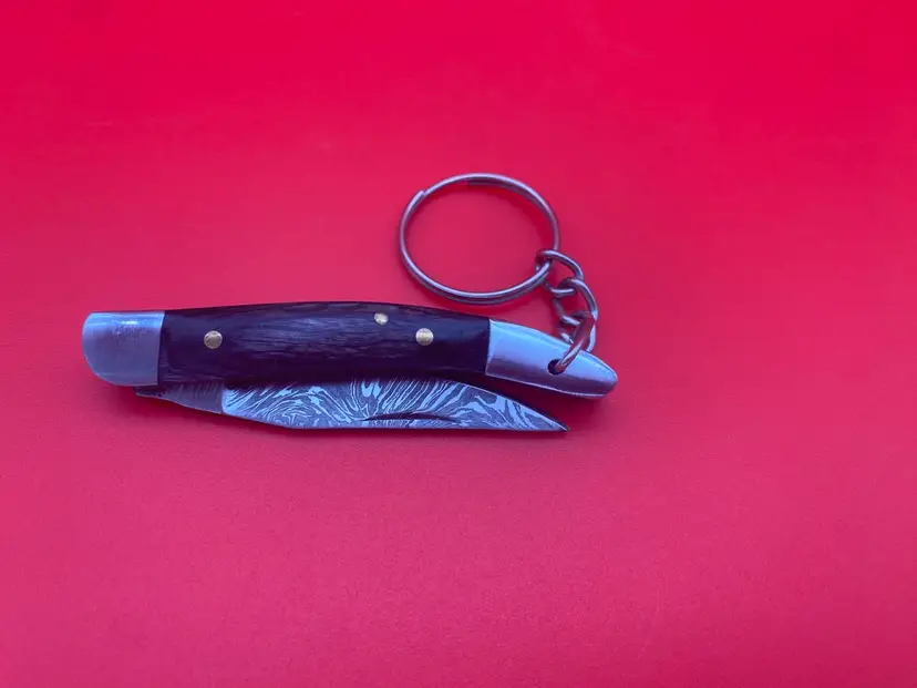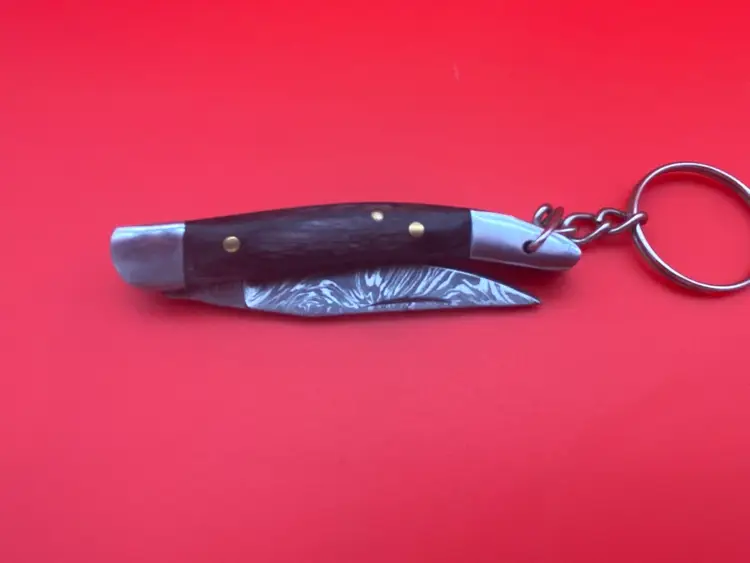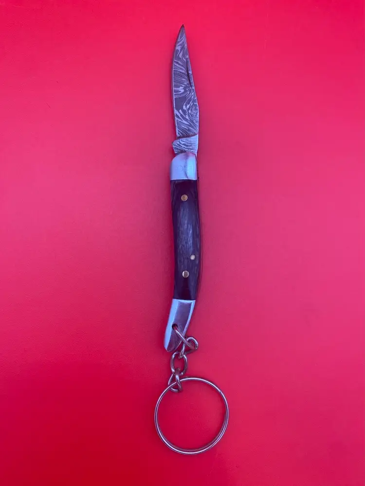 You are purchasing one Keychain Pocketknife with a Gray Wooden Handle and a Damascus Blade. This Knife has a 2.5 inch blade and hangs a total of 4.75 inches when closed. This Knife is in overall good condition with no cracks, bending or rusting. Will disclose that the Knife does not seem to want to stay closed when hanging from the Keychain, could be a safety issue until tinkered with. - see final image for an example.
