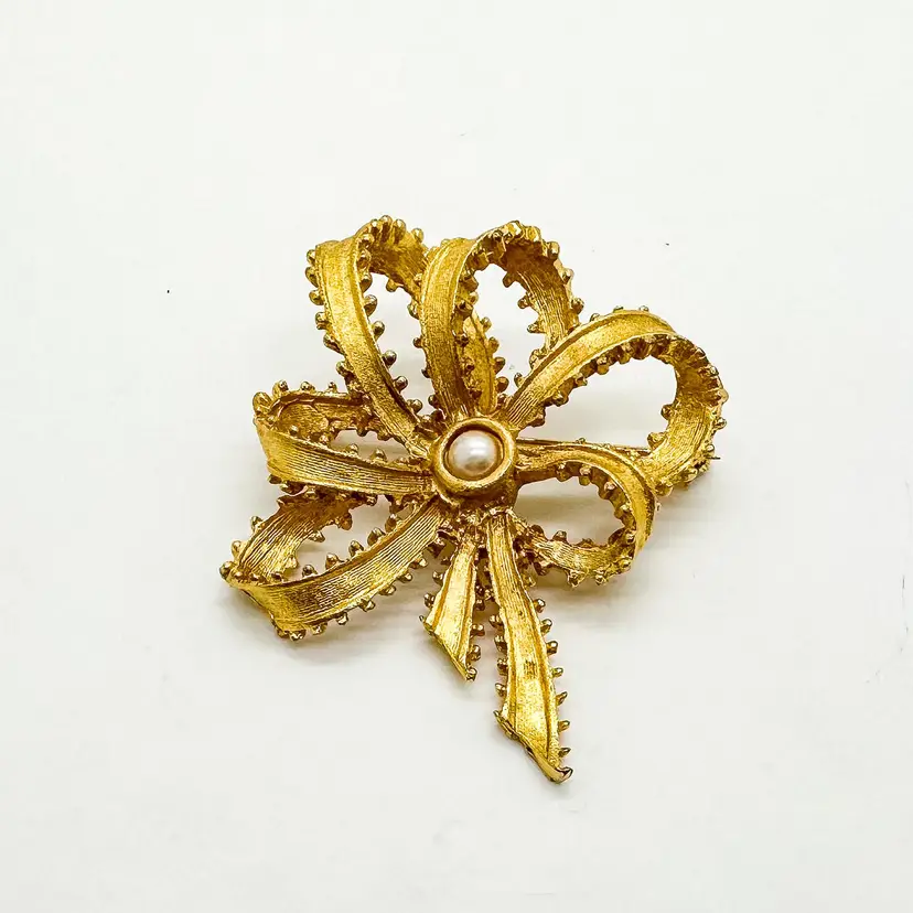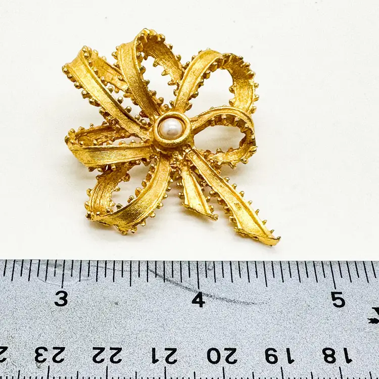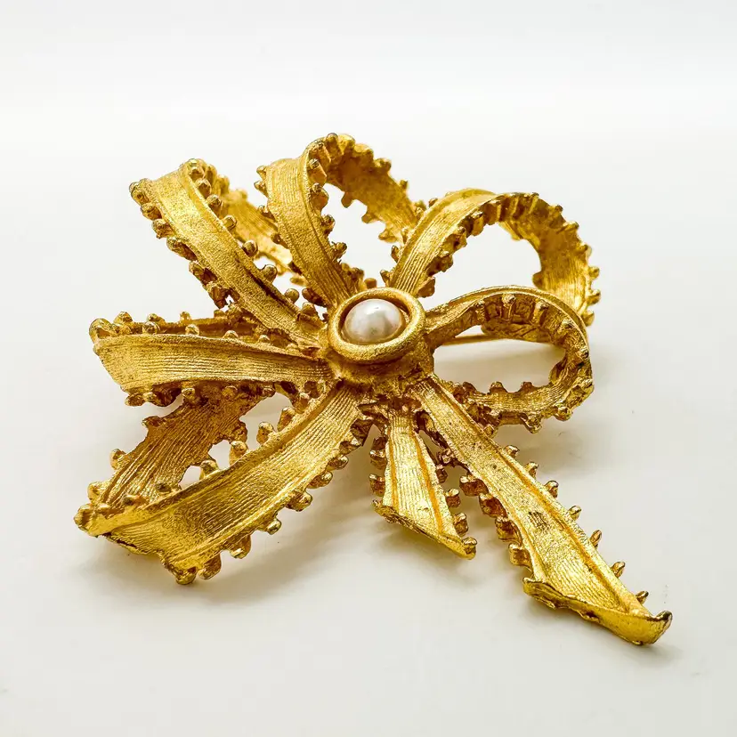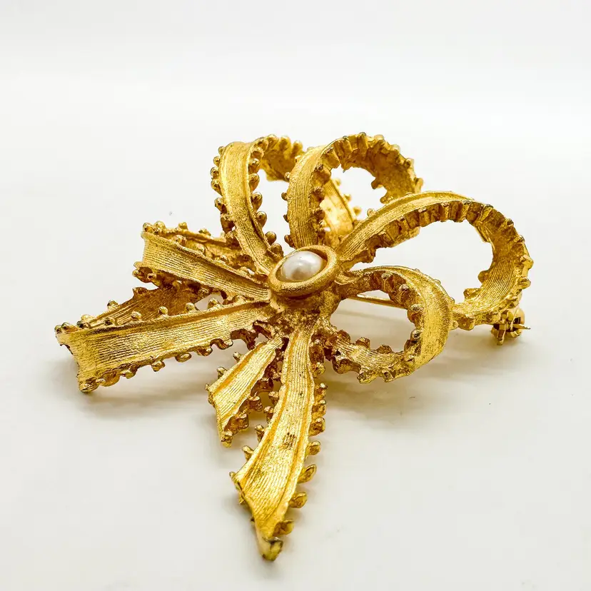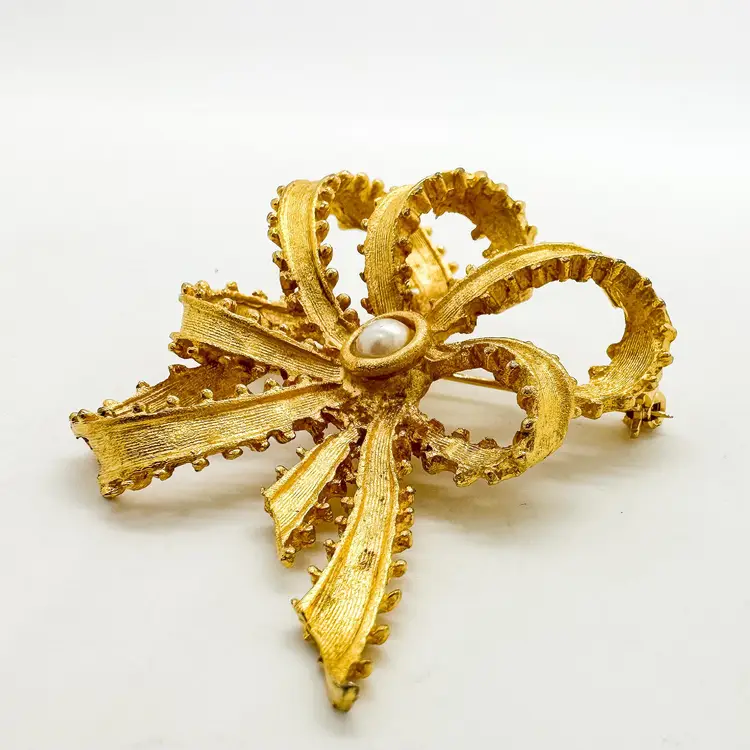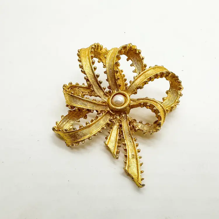 RJ Graziano Vintage Estate Brooch Pin Bow Ribbon Gold Tone Signed Features faux pearl center Beautiful dimensional design with edge detail Pin is straight and functions properly Signed Approximately 1.5" L and W Very good condition, minimal signs of wear appropriate for age and use, some light metal fading in a few areas, see all photos