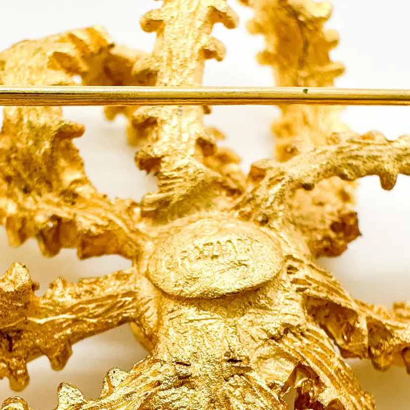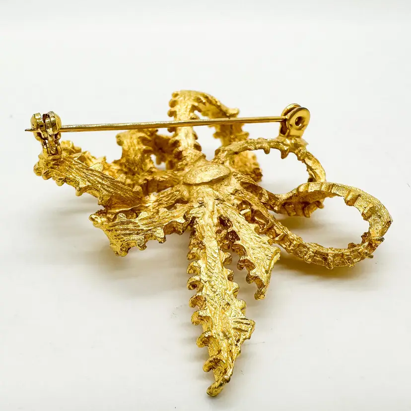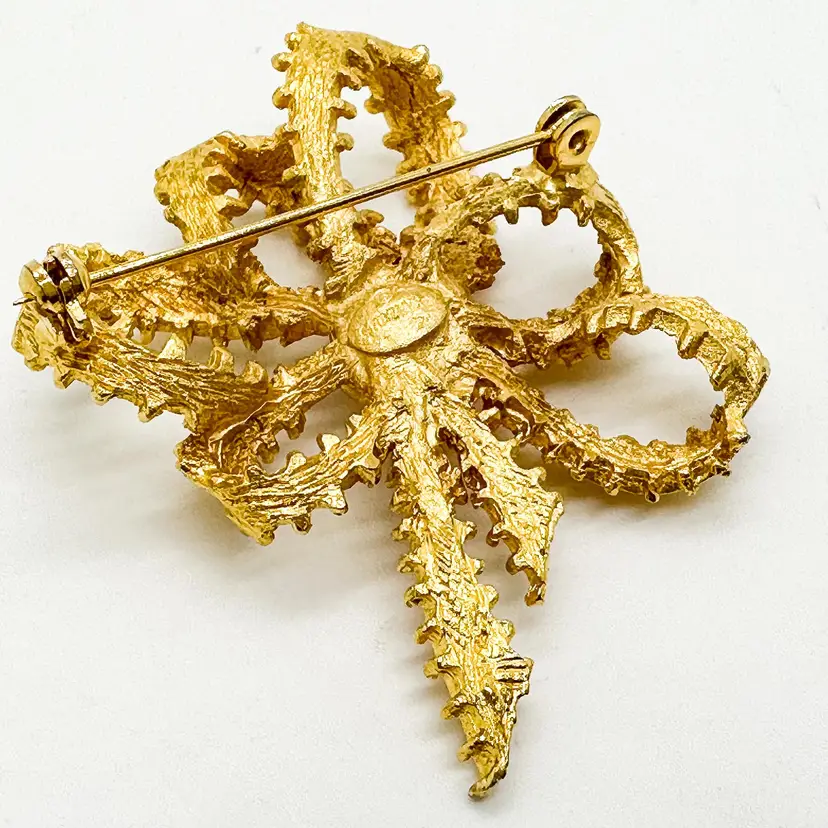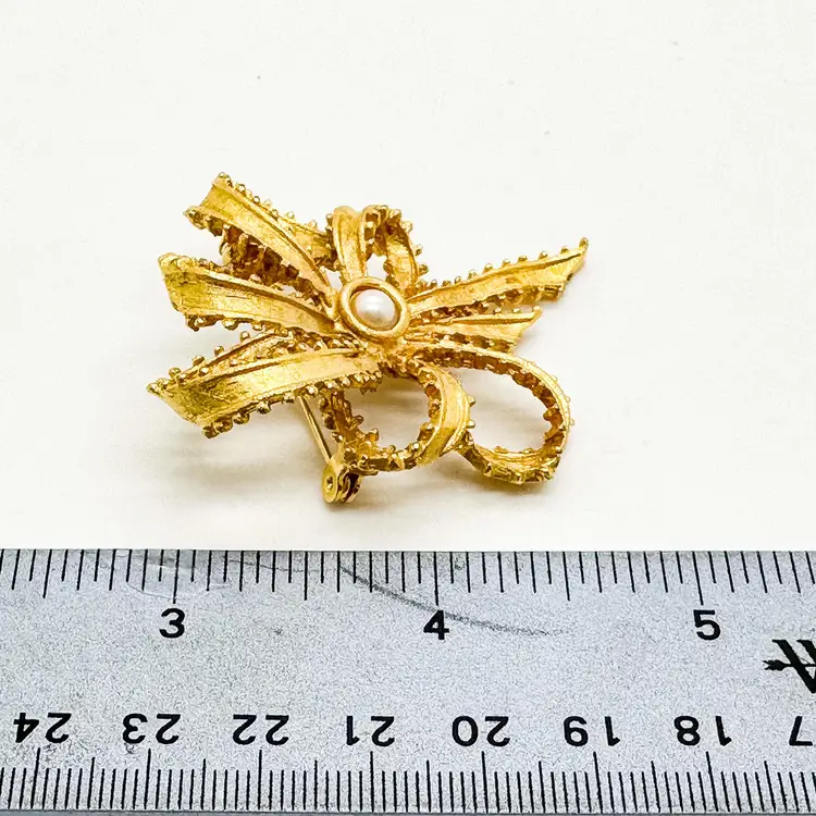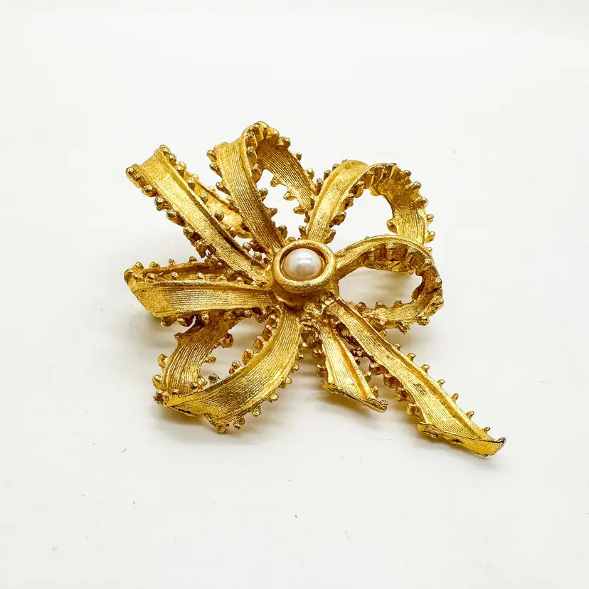 RJ Graziano Vintage Estate Brooch Pin Bow Ribbon Gold Tone Signed Features faux pearl center Beautiful dimensional design with edge detail Pin is straight and functions properly Signed Approximately 1.5" L and W Very good condition, minimal signs of wear appropriate for age and use, some light metal fading in a few areas, see all photos