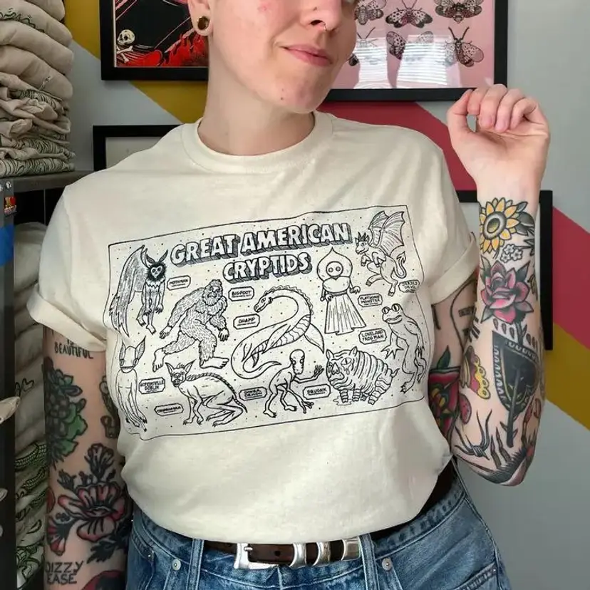 These shirts are hand printed by yours truly with blue denim ink on natural colored Gildan brand tees. Unisex tees run a bit on the large side, but can be shrunk if desired.