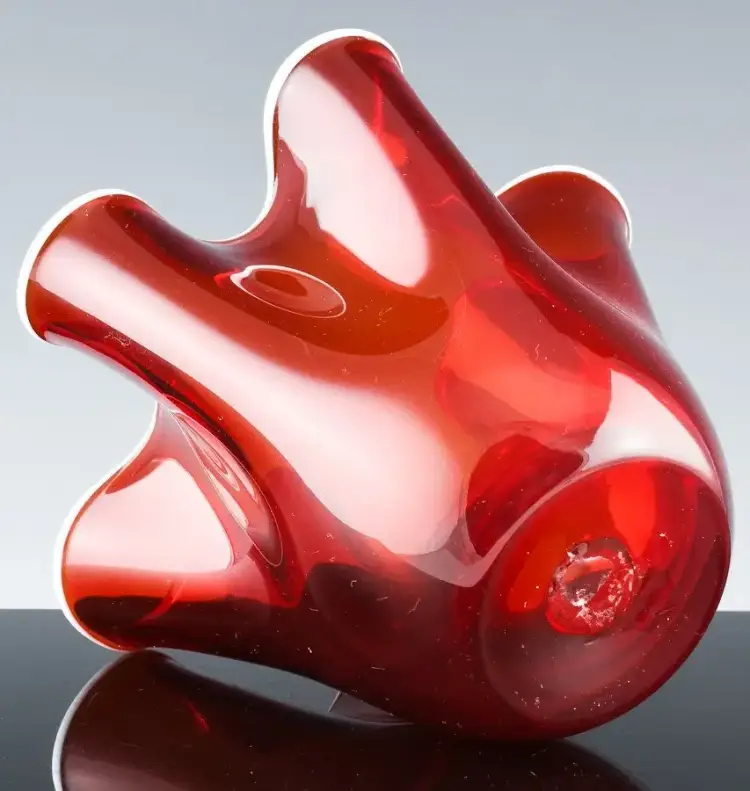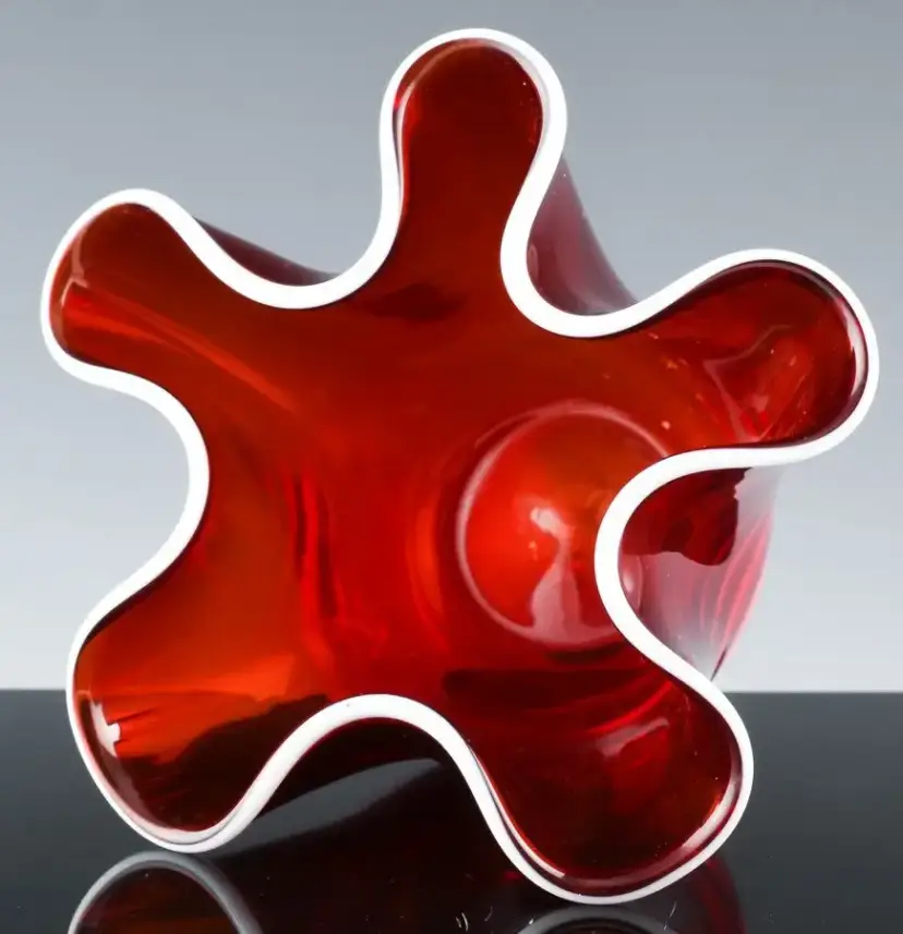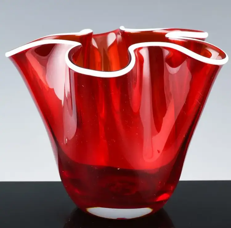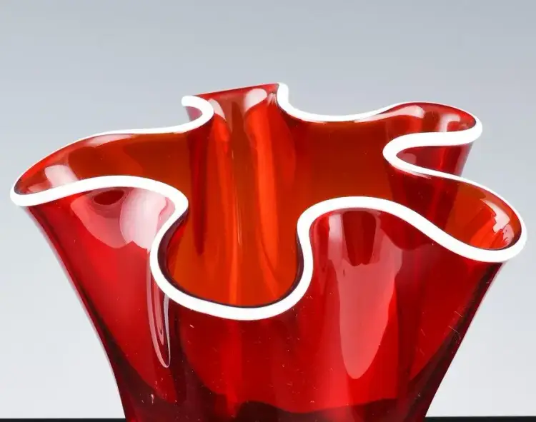 Presented for your consideration is a Red Handkerchief Glass Vase. This is a very fine little vase, with a rich Cranberry red color and an unusual milk glass brim which we have not seen before. Hand Blown and of a very Mid Century Modern look. A piece like this goes well in almost any space, also would make an outstanding gift to someone dear to yo.