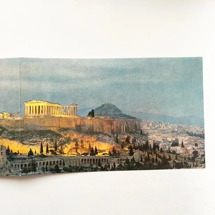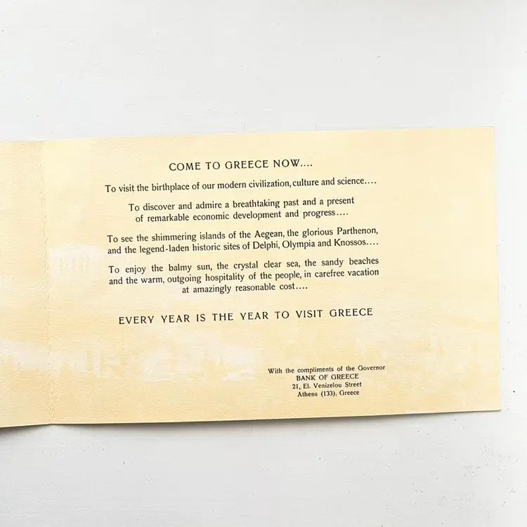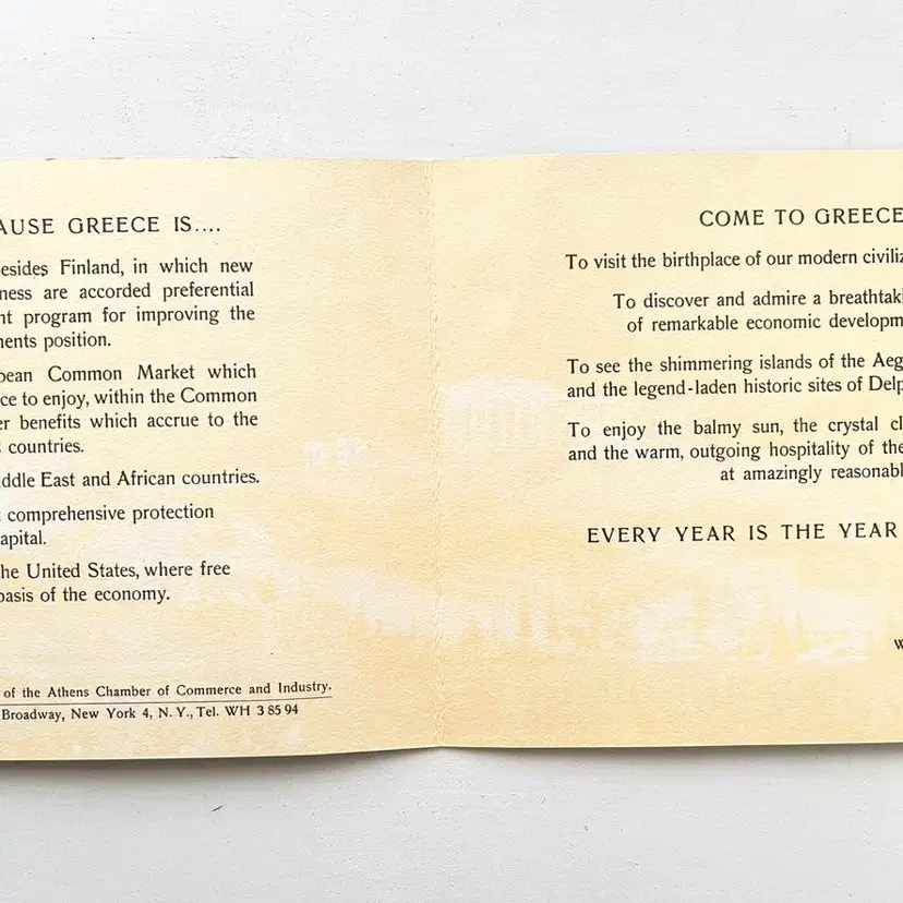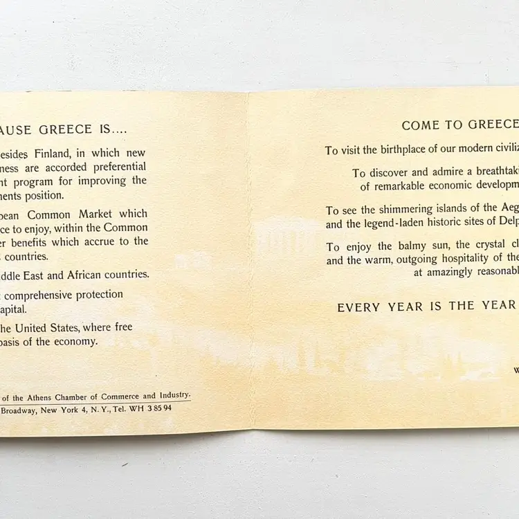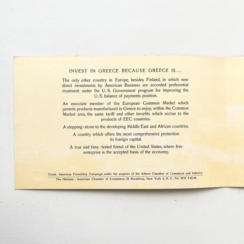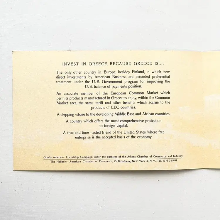 Greece Economy European Economic Community Common Market Photo Card Folder 1960s Advertising Card Folder With Panoramic Photo of Greece Parthenon Athens Acropolis Greek - American Friendship Campaign under the auspices of the Athens Chamber of Commerce and Industry The Hellenic - American Chamber of Commerce, 25 Broadway, New York, NY With Compliments of the Governor Bank of Greece, 21 El Venizelou Street, Athens, Greece INVEST IN GREECE BECAUSE GREECE IS... The only other country in Europe, besides Finland, in which new direct investments by American Business are accorded preferential treatment under the US Government program for improving the US balance of payments position An associate member of the European Common Market which permits products manufactured in Greece to enjoy, within the Common Market area, the same tariff and other benefits which accrue to the products of EEC (European Economic Community) countries A stepping stone to the developing Middle East and African countries A country which offers the most comprehensive protection to foreign capital A true and time-tested friend of the United States, where free enterprise is the accepted basis of the economy COME TO GREECE NOW... To visit the birthplace of our modern civilization, culture and science... To discover and admire a breathtaking past and a present of remarkable economic development and progress To see the shimmering islands of the Aegean, the glorious Parthenon, and the legend-laden historic sites of Delphi, Olympia and Knossos... To enjoy the balmy sun, the crystal clear sea, the sandy beaches and the warm, outgoing hospitality of the people, in carefree vacation at amazingly reasonable cost... EVERY YEAR IS THE YEAR TO VISIT GREECE Condition: The fold is a little off so it does not align exactly when folded Measures 16-3/4 inches x 5-1/4 inches Packaged in a plastic sleeve inside a rigid envelope Visit my store to see more vintage ephemera, advertising, novelties, gifts, estate sale and yard sale finds https://district.net/u/finderspickerspaper SKU B33