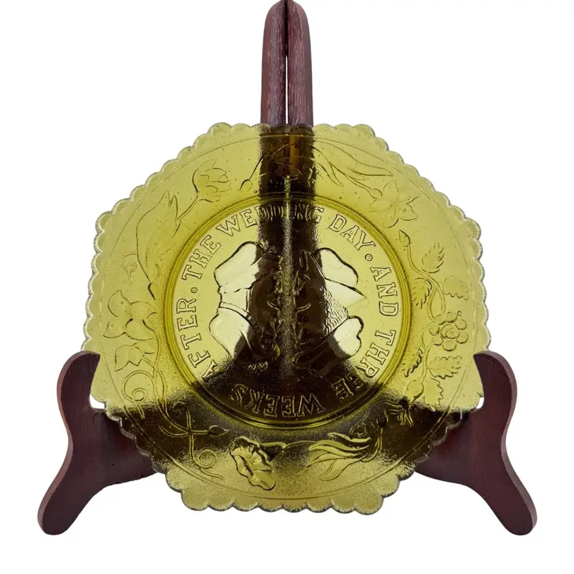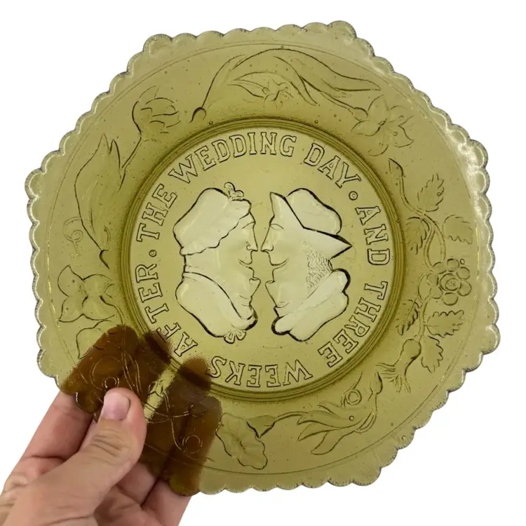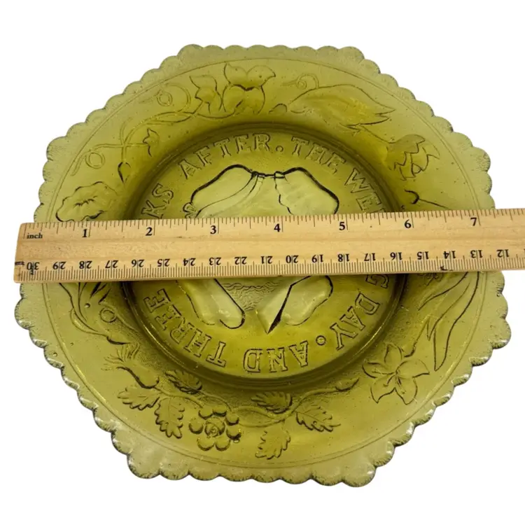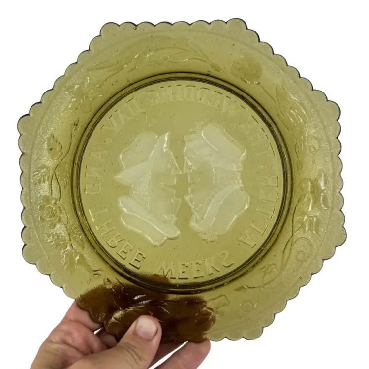 This Green Amber Glass Wedding Day Plate has NO chips or cracks. It is textured on the back of the plate. Also there is no signatures or markings on this plate.