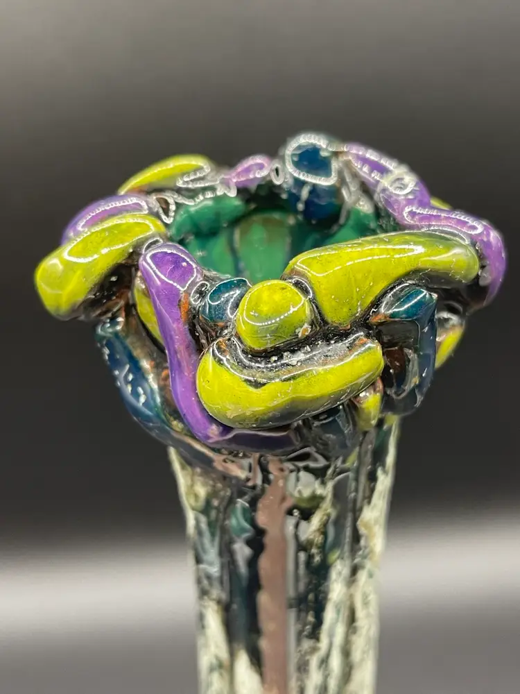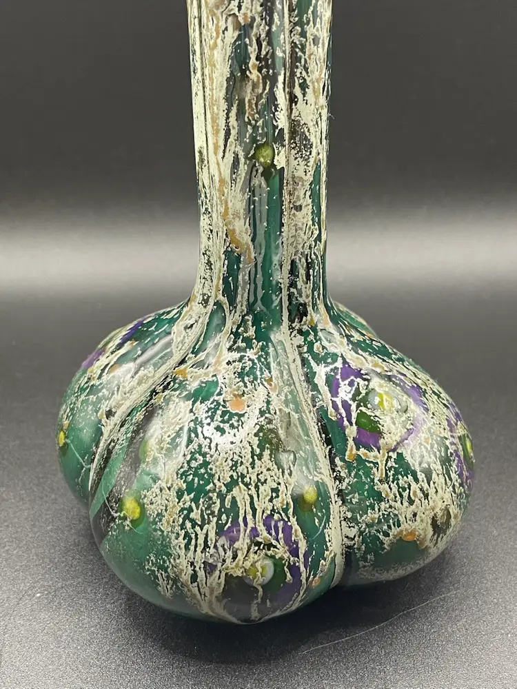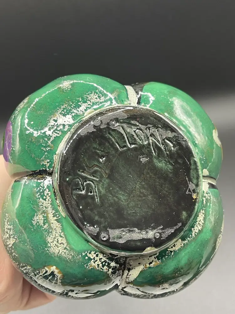 Made in Maine, hand made pottery vase. Green and purple glazed, this is signed Bisallon, which is a small pottery studio here in Maine. They are known for their bright colors.