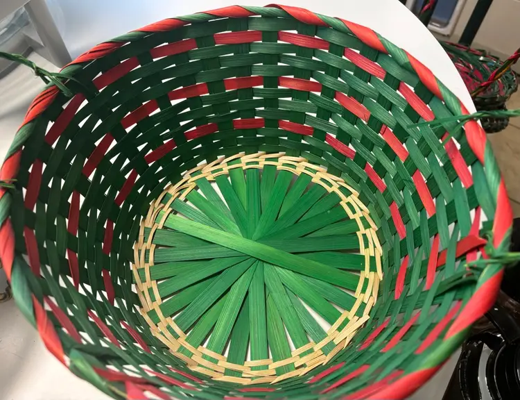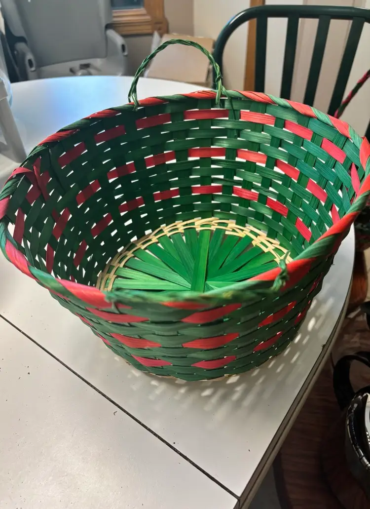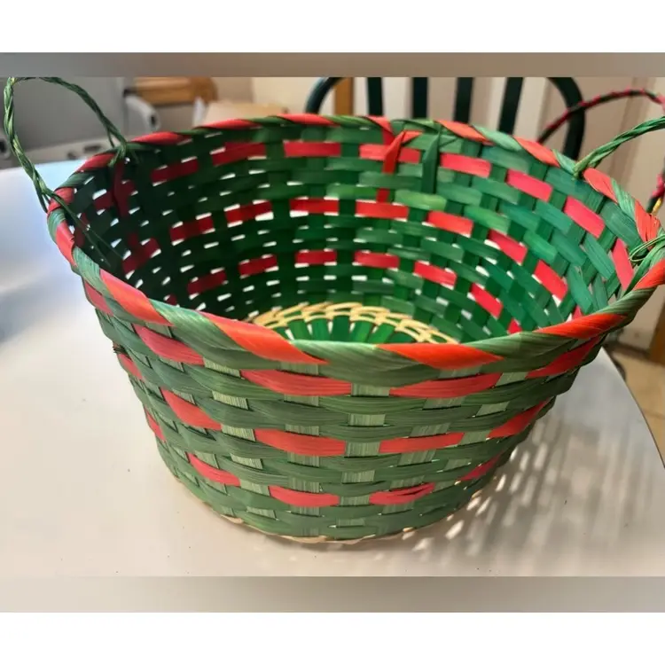 This basket features a vibrant green base with red accents, creating a festive look. It is in great condition and ready to add a touch of charm to your home