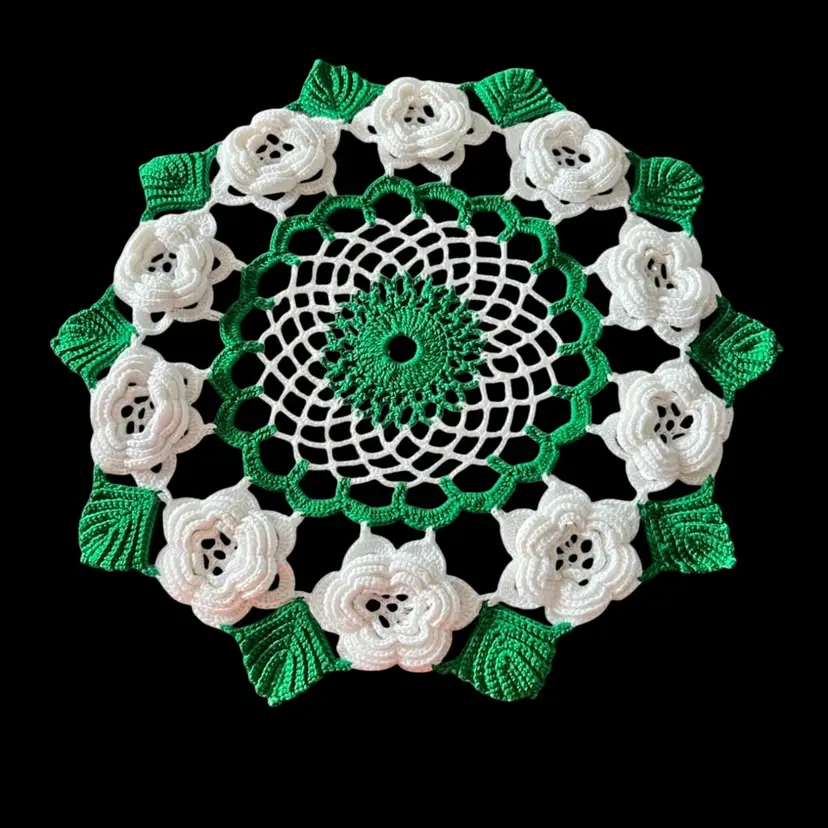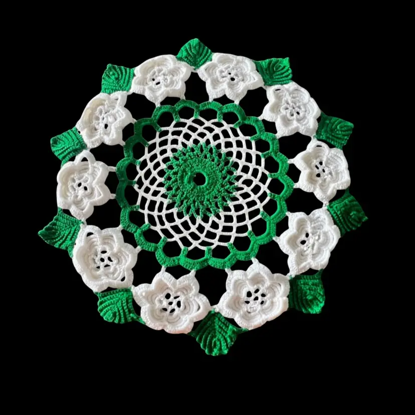 This is a beautiful green and white doile it is in perfect condition and the color is bright.