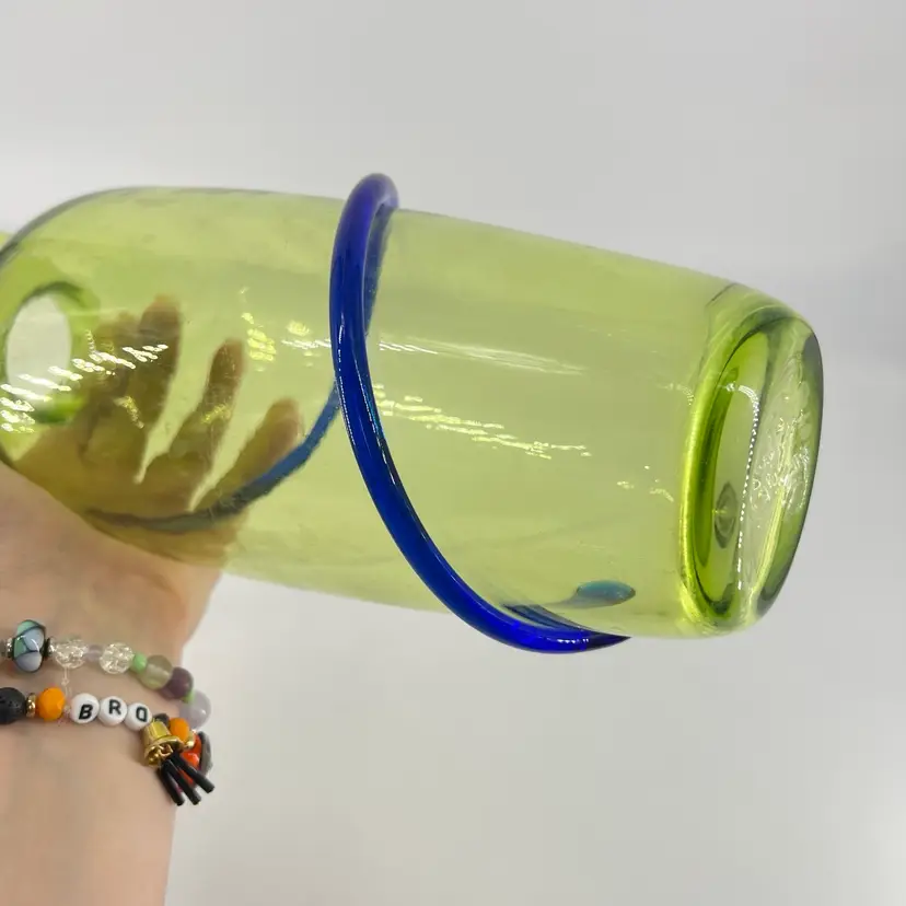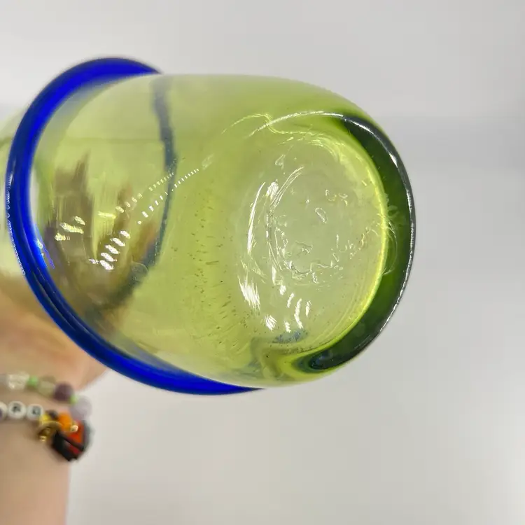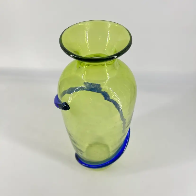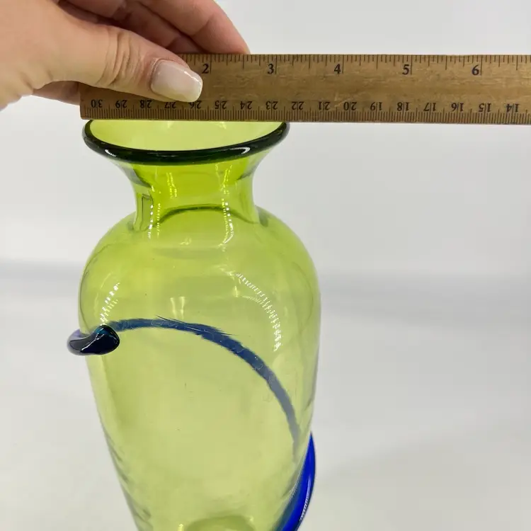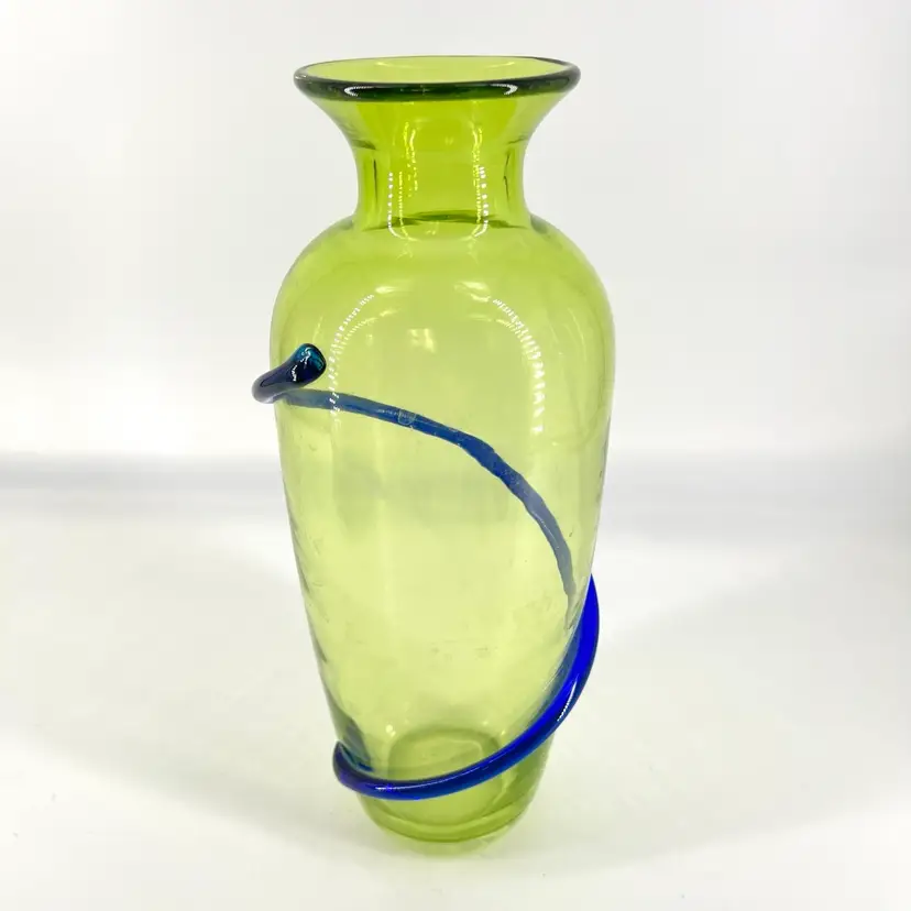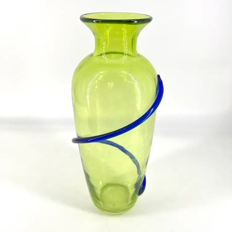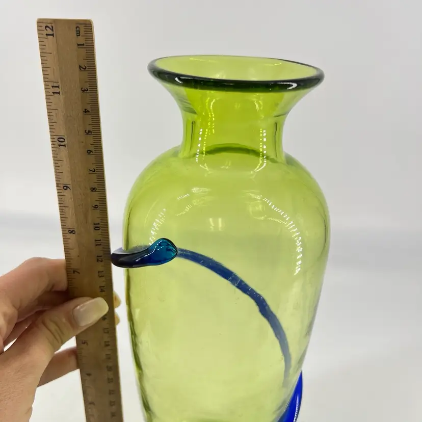This vase is green glass with a blue swirl. It measures approx 11.5” tall. There are no chips or cracks.