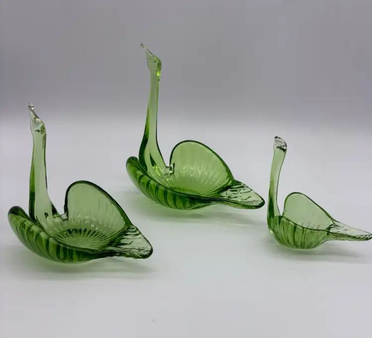 Green Art Glass Triple Swan Birds Dishes One Piece