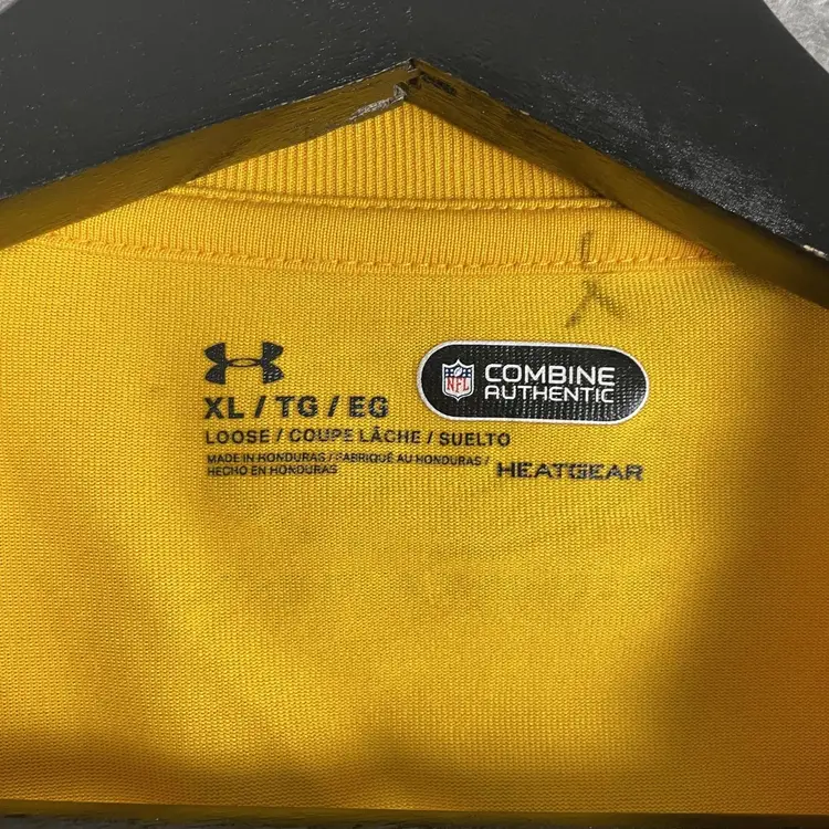 Logos and branding: Green Bay Packers oval G logo heat pressed at center chest, small NFL Combine Authentic shield logo patch on one sleeve, Under Armour logo and NFL Combine Authentic wording printed at upper back neck, and printed Under Armour neck label with HeatGear and Loose fit designations.