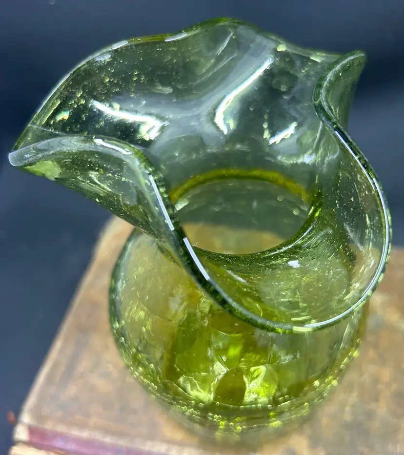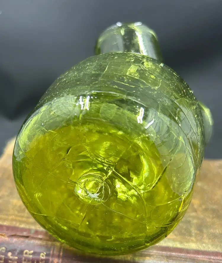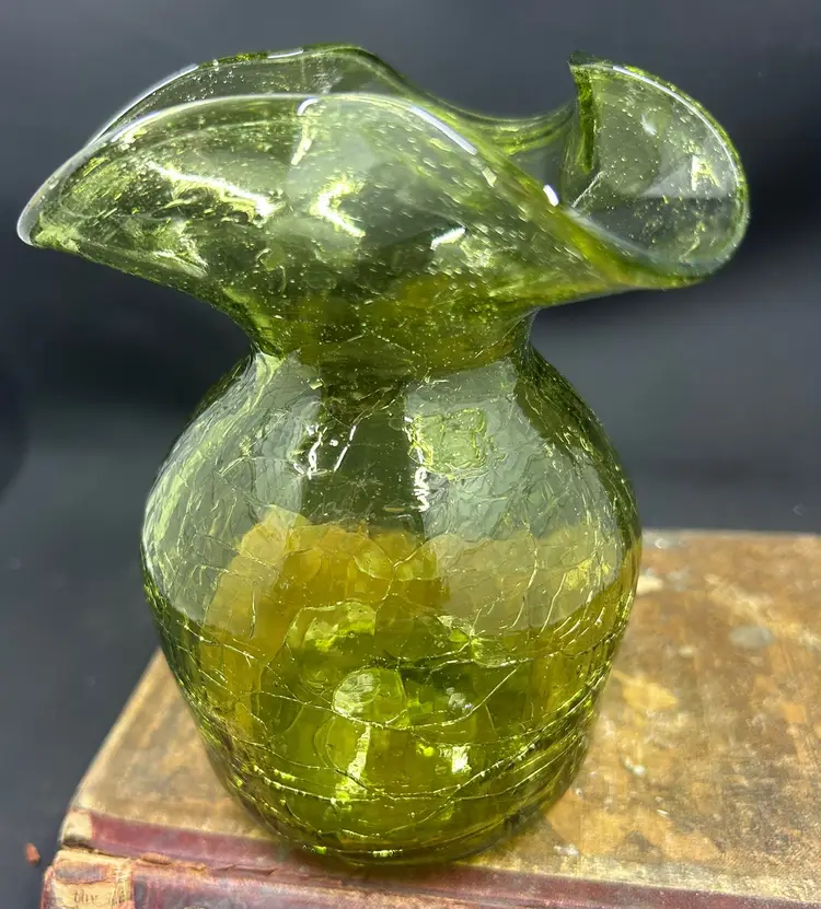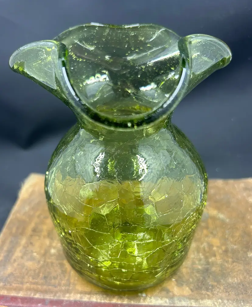 Small green glass crackle glass vase. Has a rough pontil mark on the bottom. 5” tall and 3-4” in diameter. No other flaws I can find. Has a hello tint to it. Does not glow b