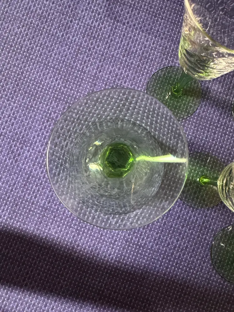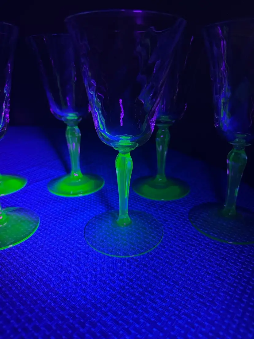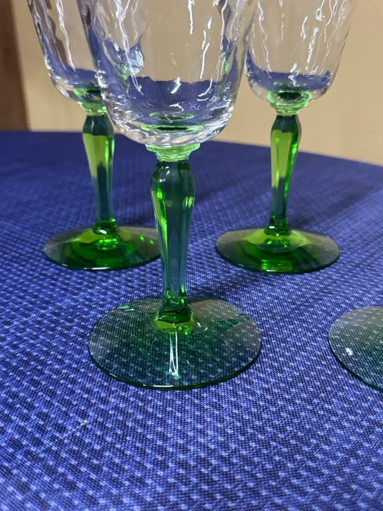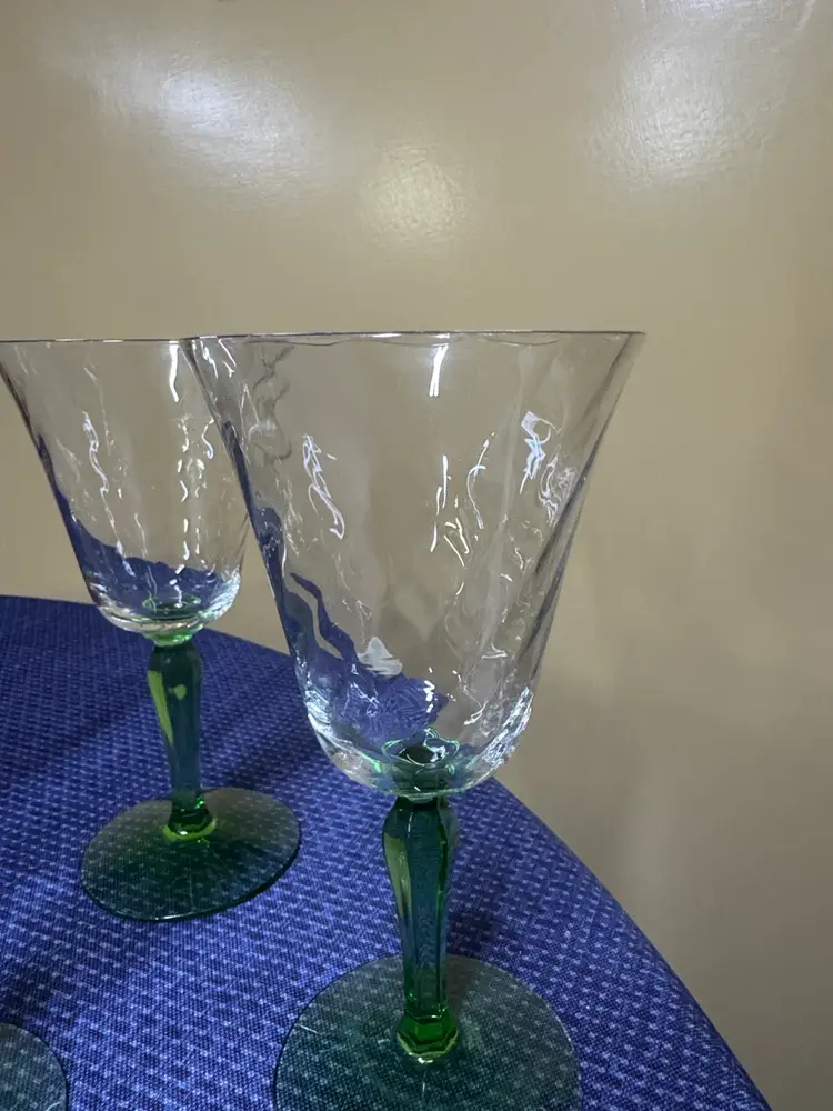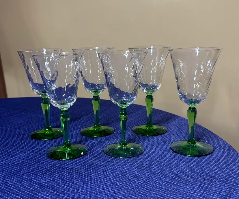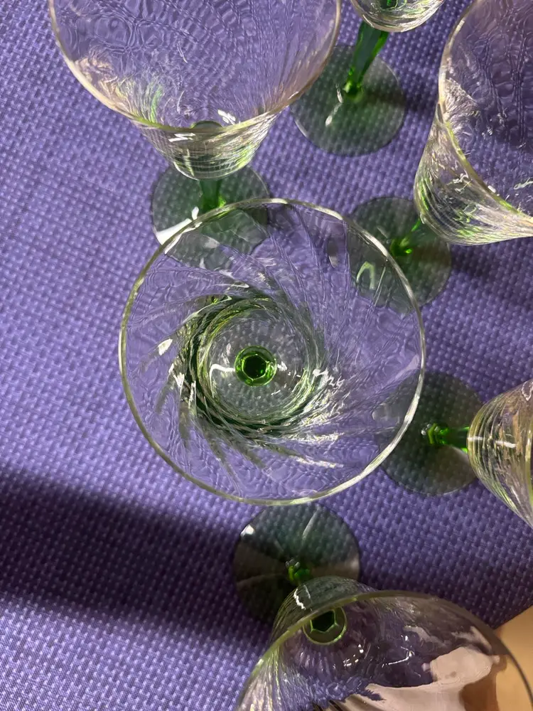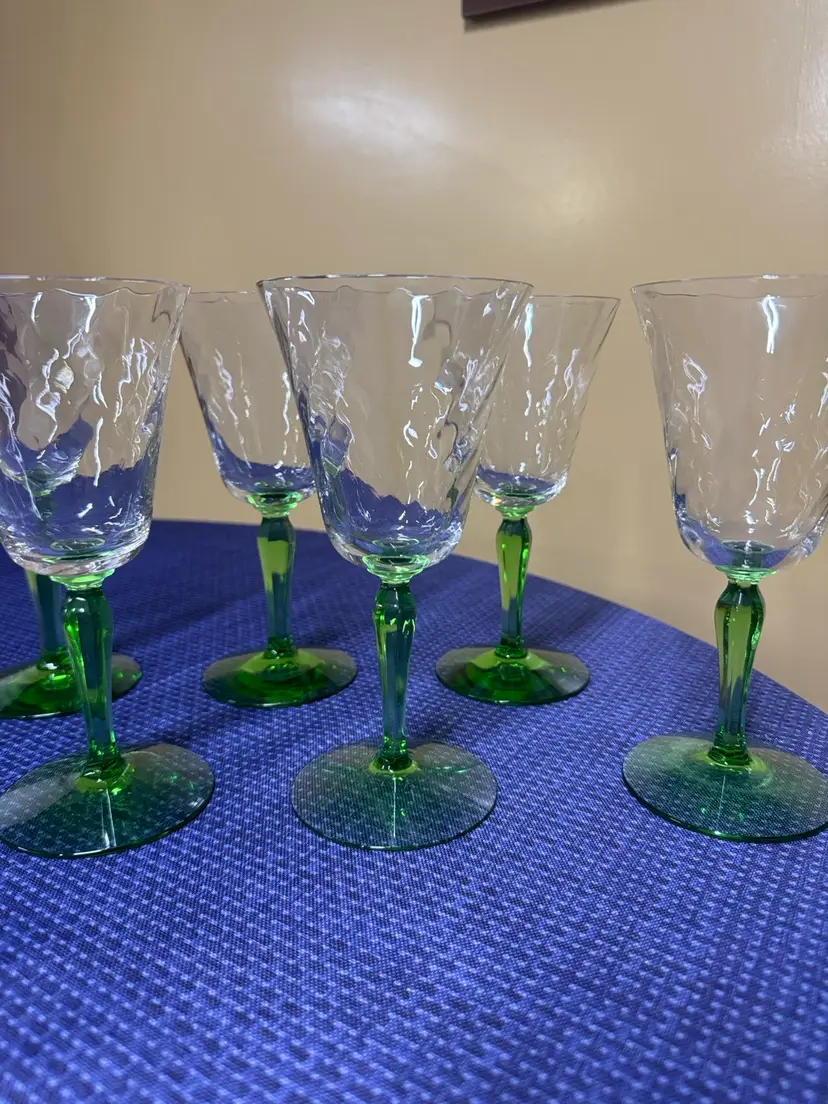 Vintage Green Depression Uranium Glass Spiral Stemmed Goblets 8 oz, 7.25” Tall 3.5” diameter Set of 6 Stems glow under black light Enhance your dining experience with this elegant set of wine glasses featuring vibrant green stems. Perfect for any occasion. 5 are in excellent condition with no breaks or chips one has a small chip on the rim (1084108254)