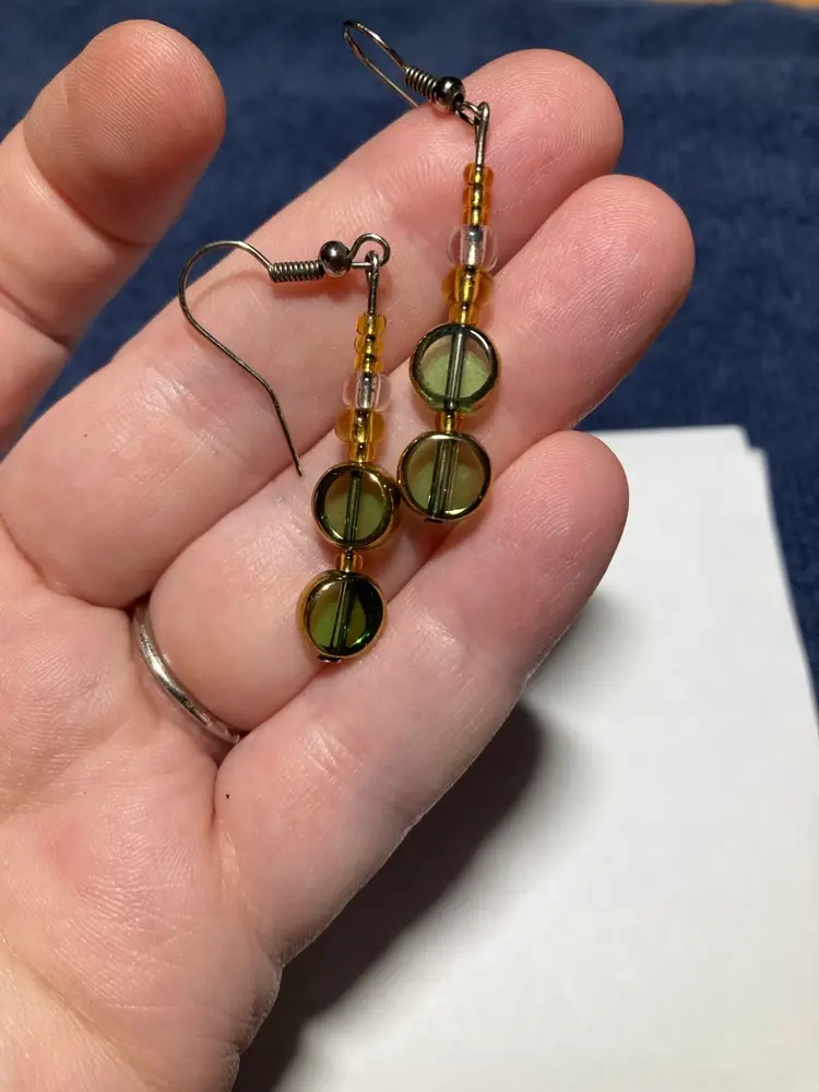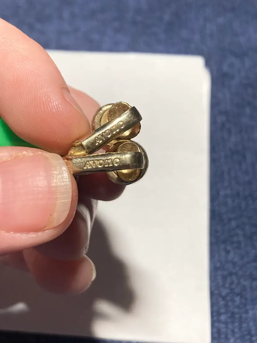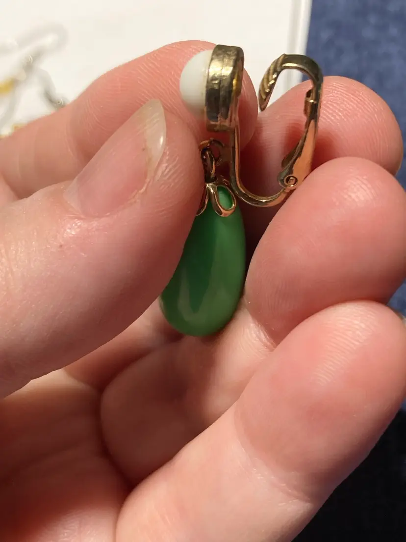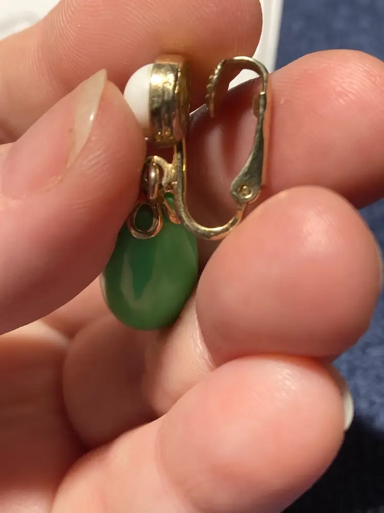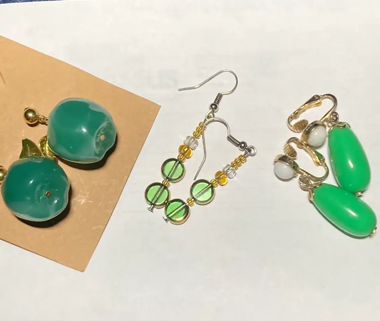 Green Avon acrylic pierced apples 1992. Green and white Avon acrylic clip on dangles. Green glass or acrylic dangles.