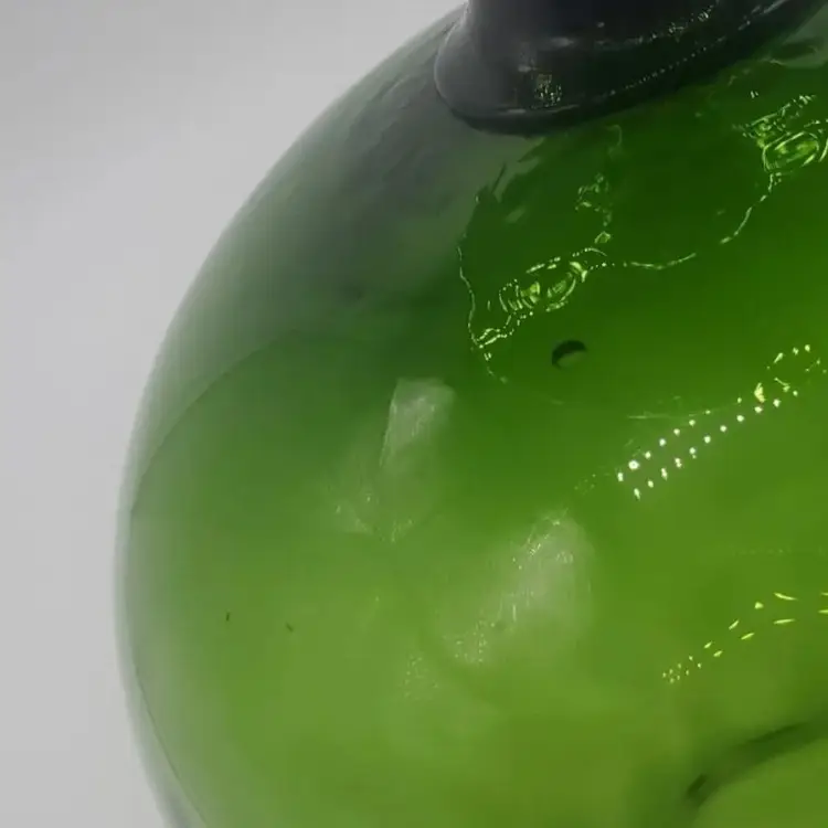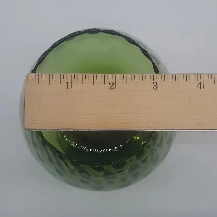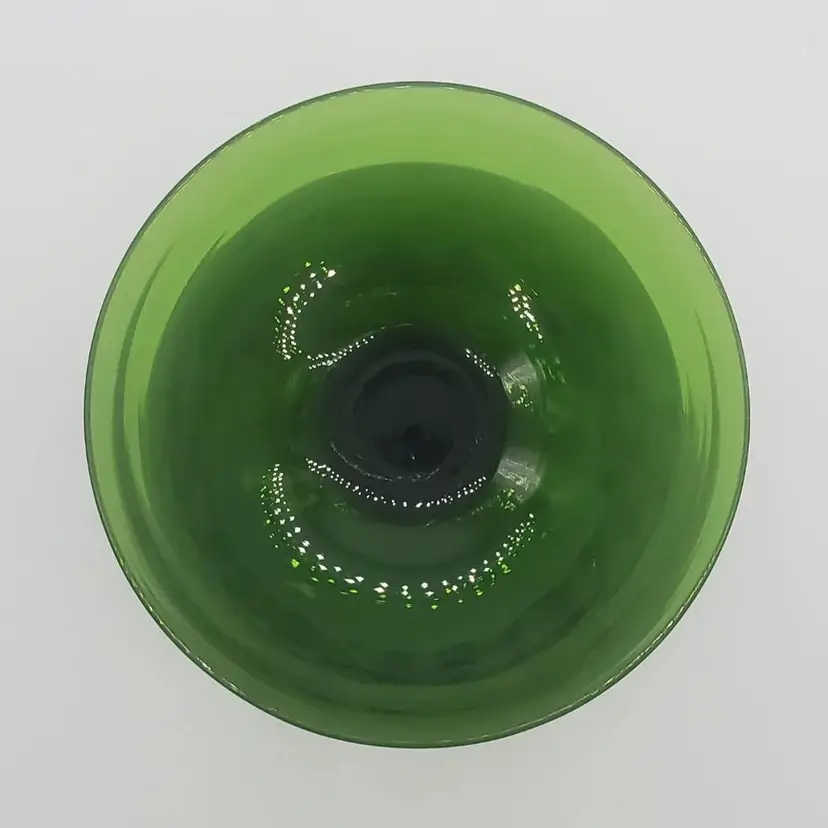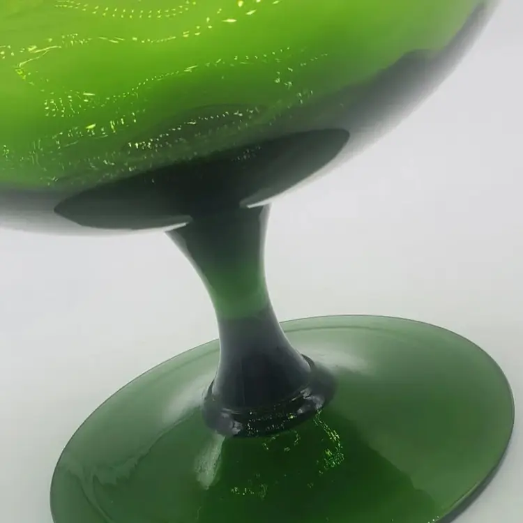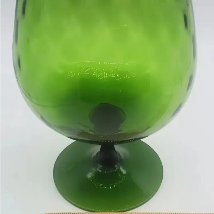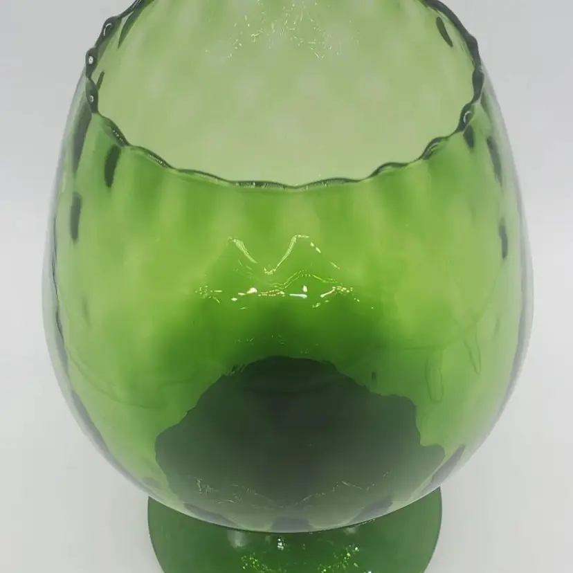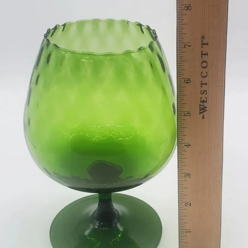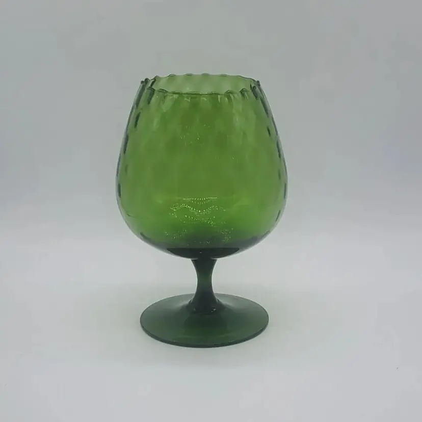 A Green Empoli Glass Brandy Snifter With diamond Optic, a Ripple Edge and a pedastal base. It stands approximately 7.5" tall and approximately 3" wide at the opening. The base is approximately 3.5" wide. No makers mark is seen, however from a brief research online, it is believed to be Empoli Glass from Italy. There are a few bubbles seen within the glass. It is in Good, Pre-owned condition, showing minimal wear from previous use and age. There are no breaks, no cracks, no chips. See all photos of description
