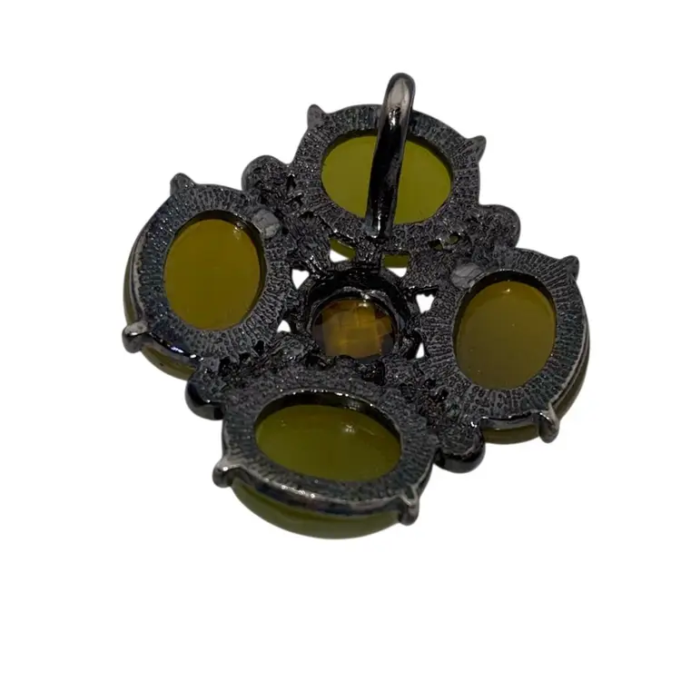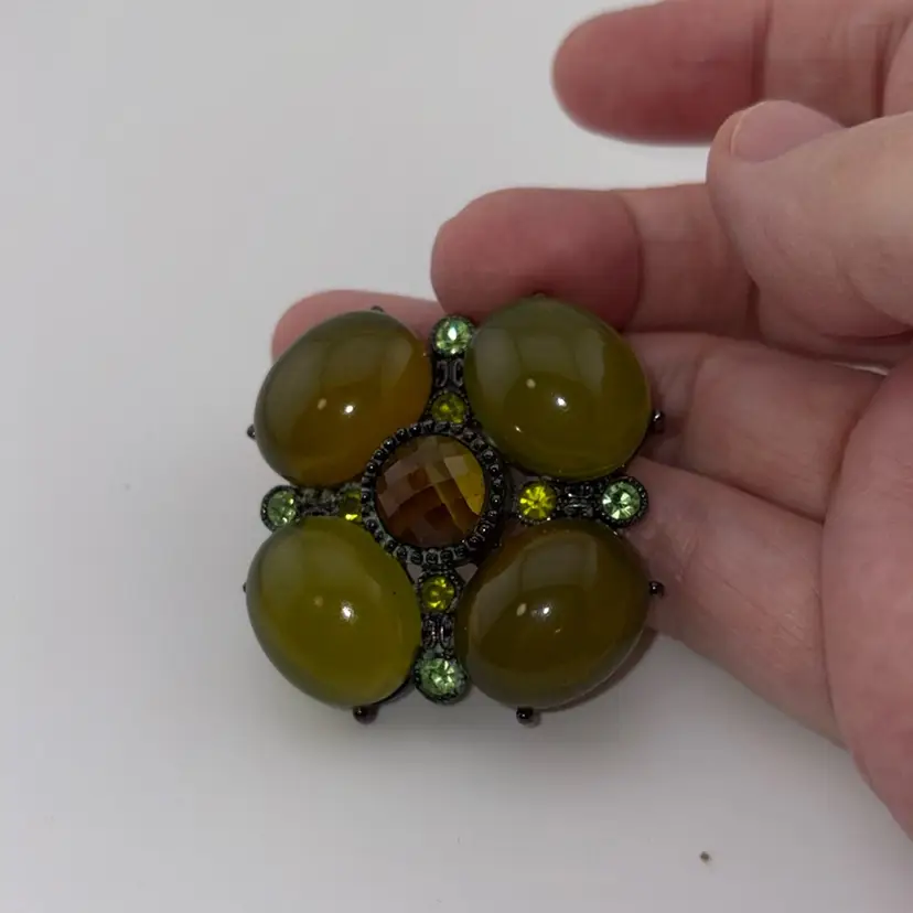 I am unsure of the types of gemstones these are. The piece measures 2” x 1.75”.