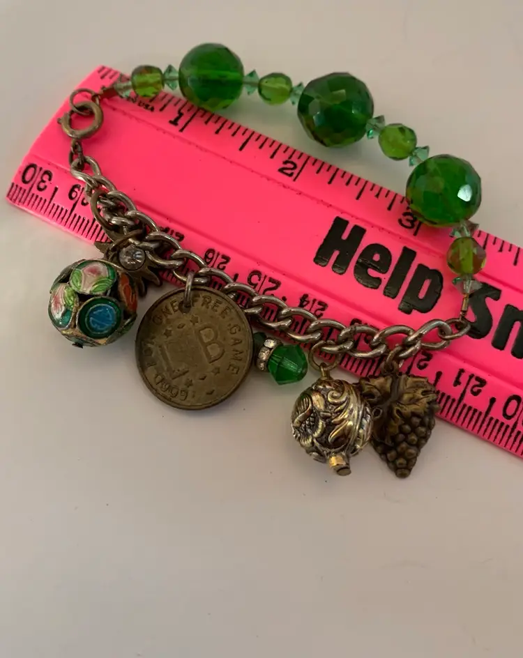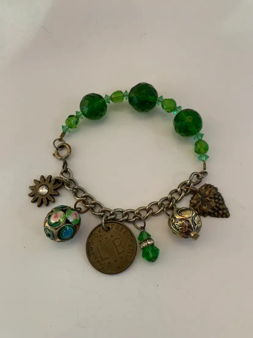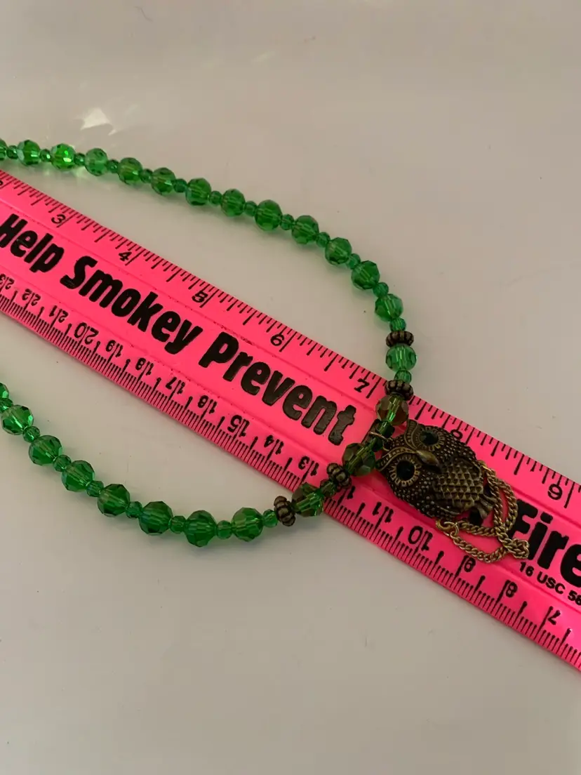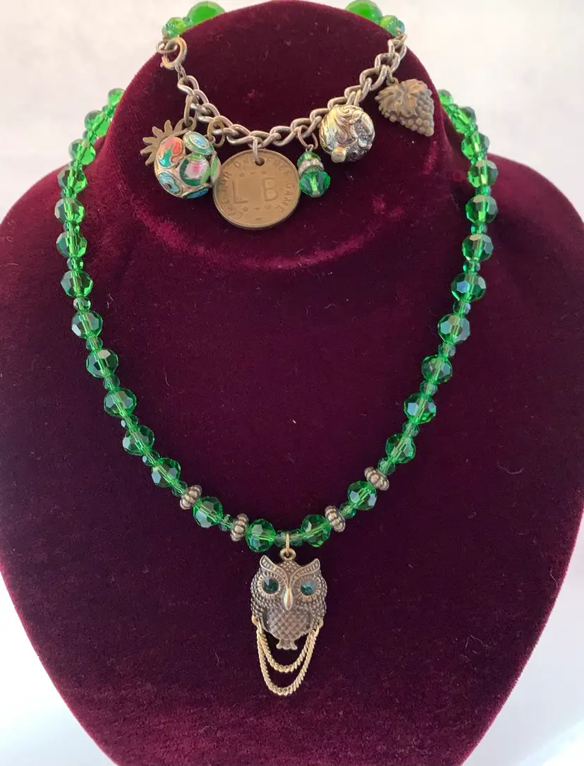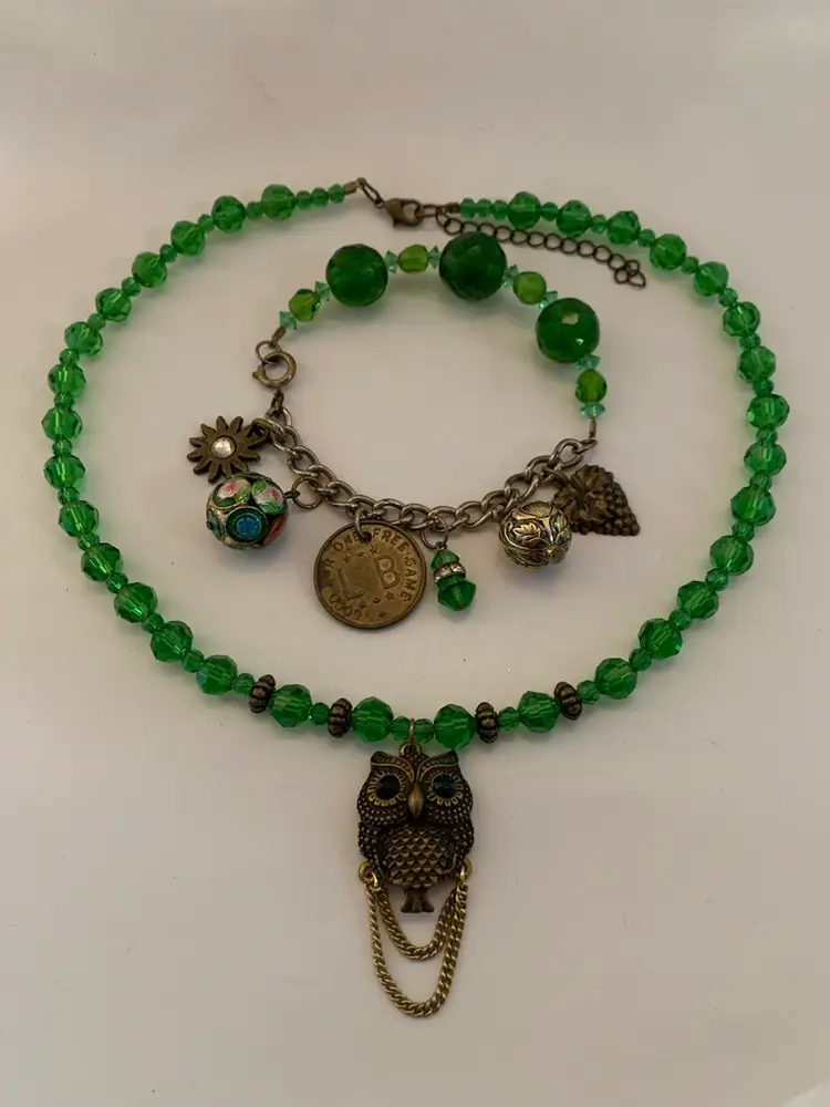 Handmade necklace created with vintage repurposed green glass faceted beads and an antique toned owl pendant. Coordinating boho style bracelet is made from vintage green glass beads, repurposed chain and unique charms to make a one of kind piece. Necklace is about 7 1/2” in wearable length, bracelet is 7” in diameter.