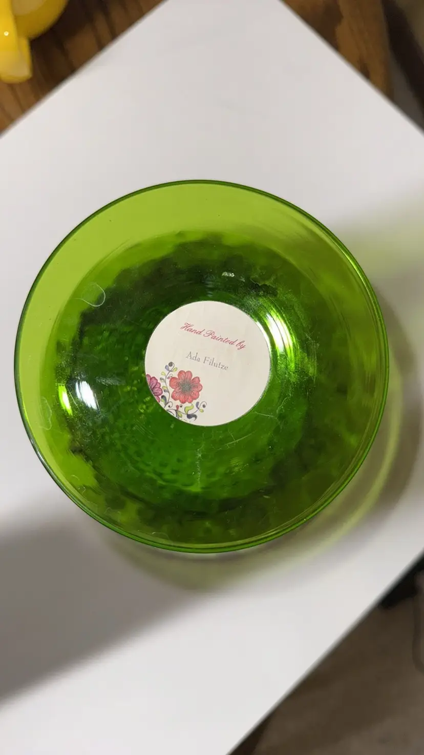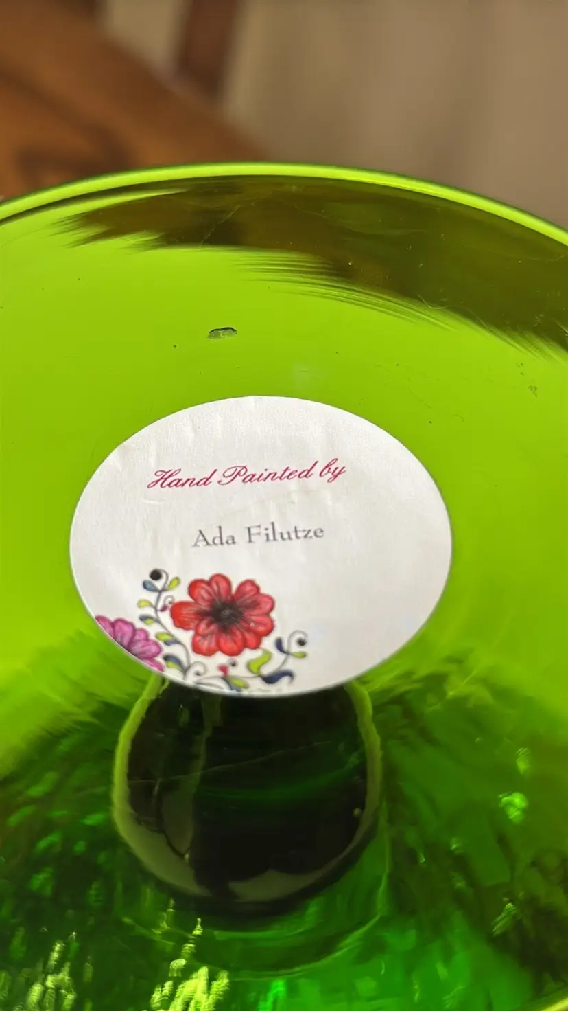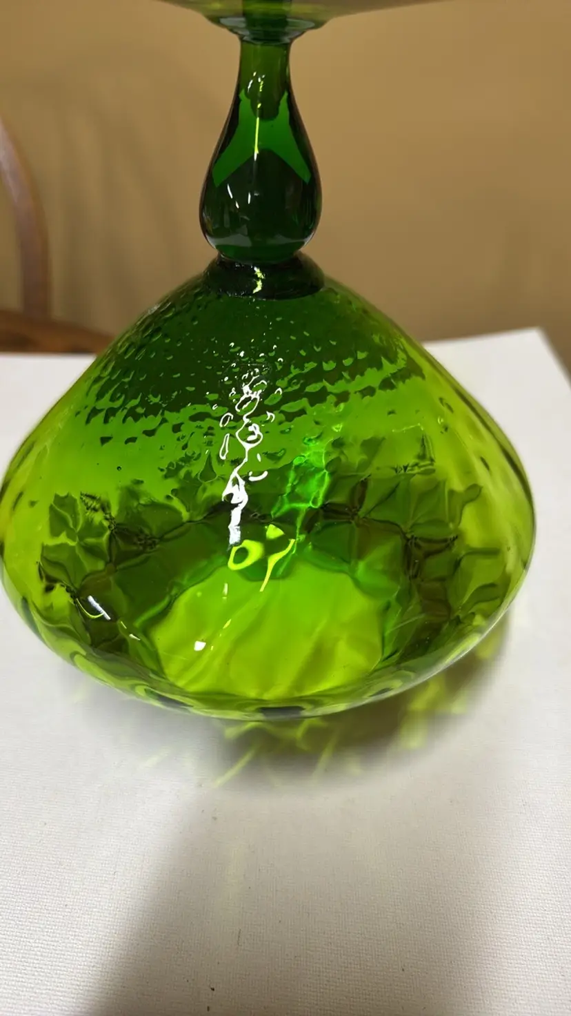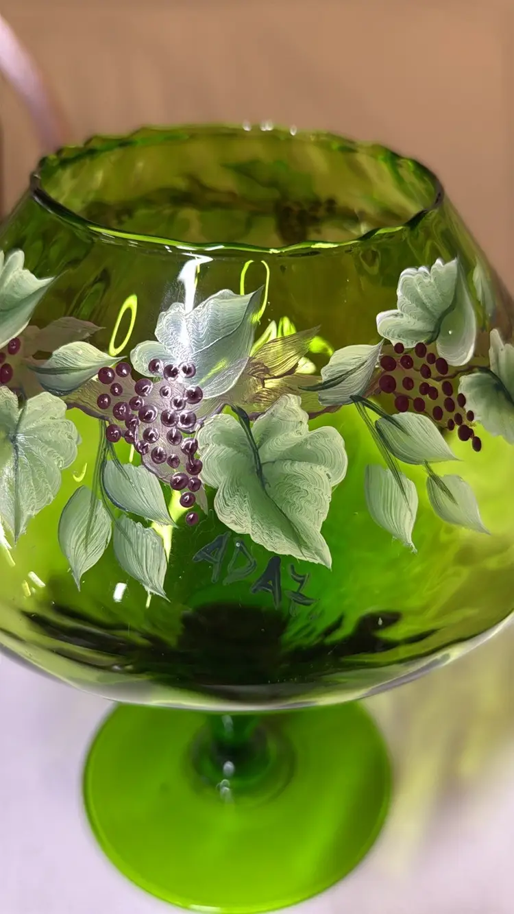Vintage 1970s Italian Green Art Glass Empoli Diamond Optics Hand Blown Footed Bowl Vase snifter Hand paintedted with grapes and leaves signed by the artist Ada Filutze Beautiful and in perfect condition with no breaks or chips (6110256)