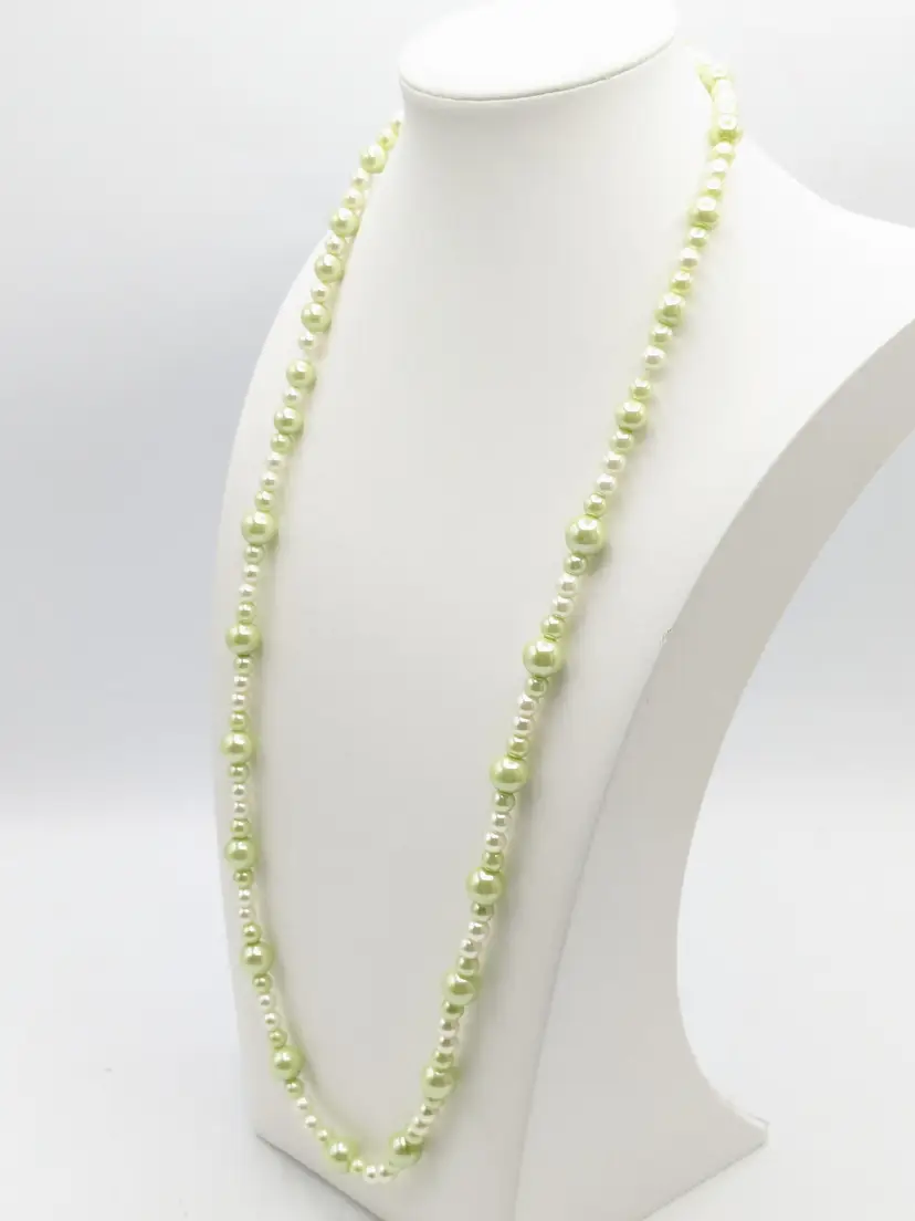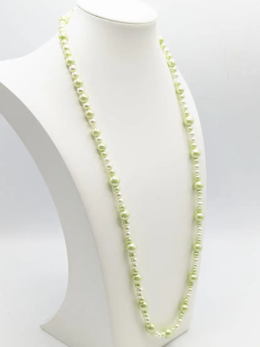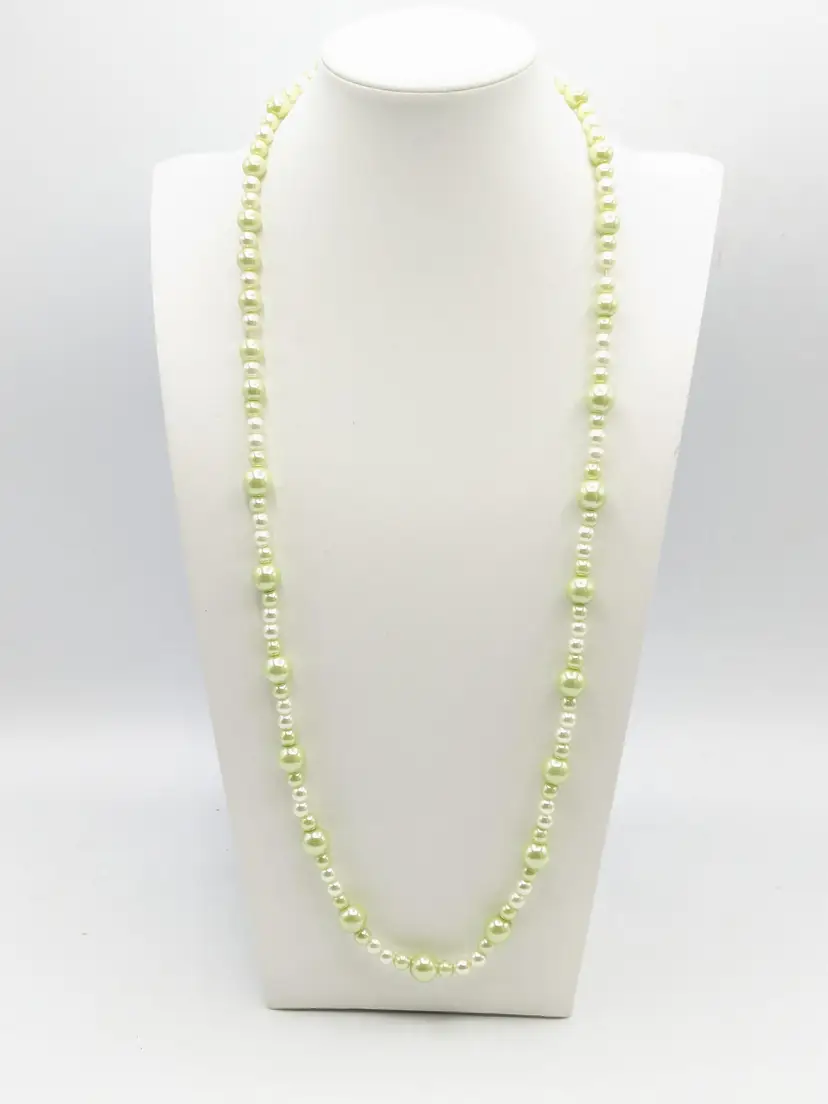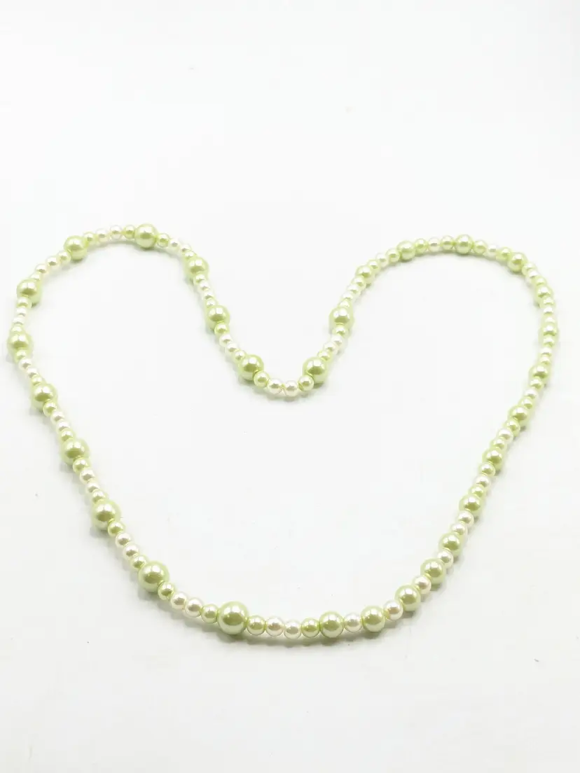 Good condition. Lovely light green faux pearl beads. Measures 30" in length and is a stretch necklace. Perfect for layering or wearing alone. (EN2)