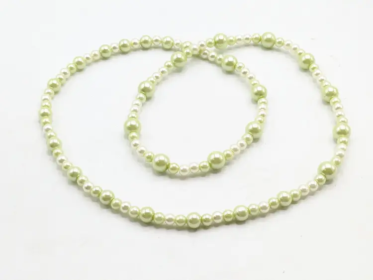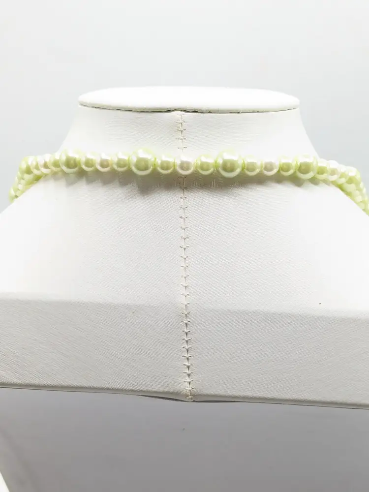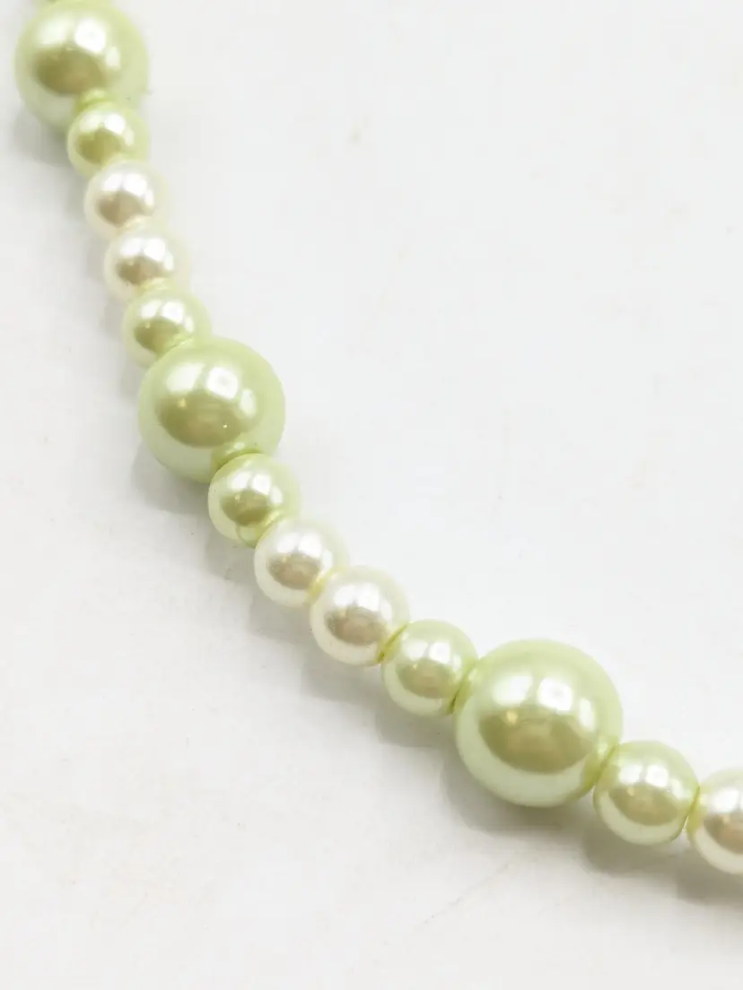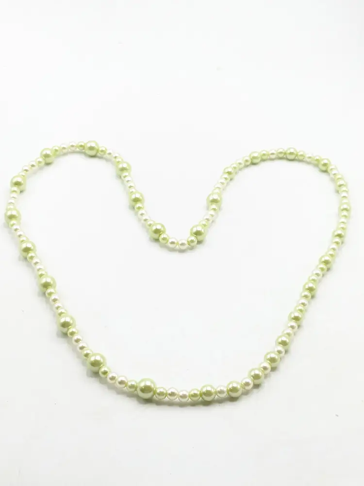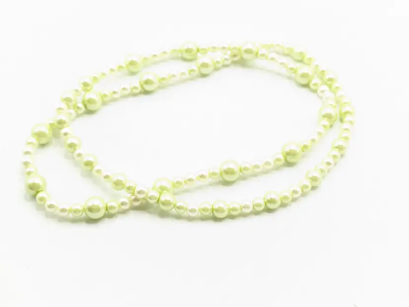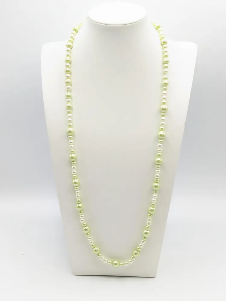 Good condition. Lovely light green faux pearl beads. Measures 30" in length and is a stretch necklace. Perfect for layering or wearing alone. (EN2)